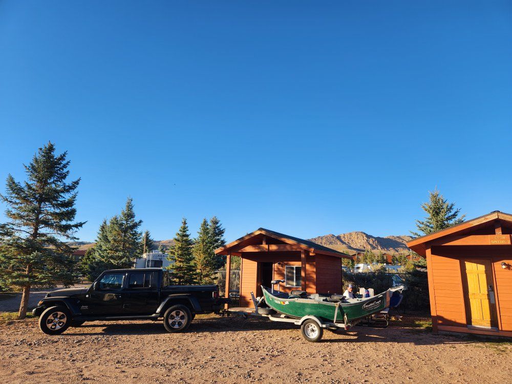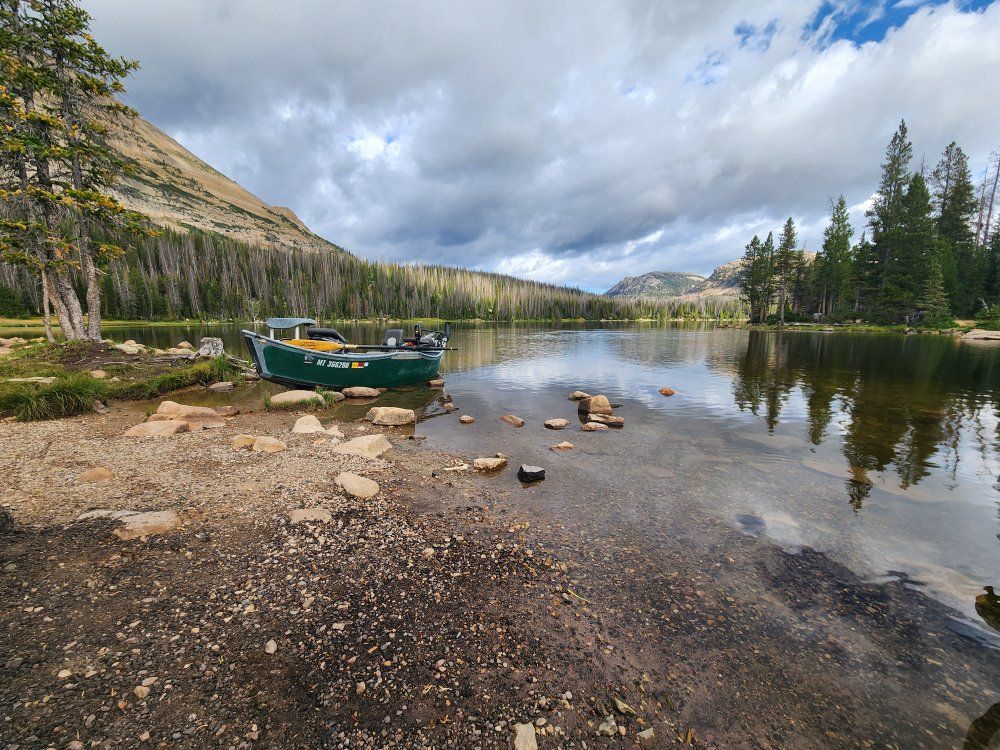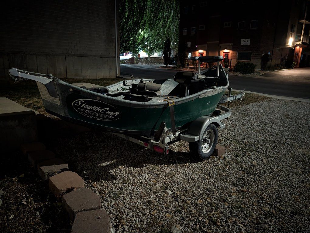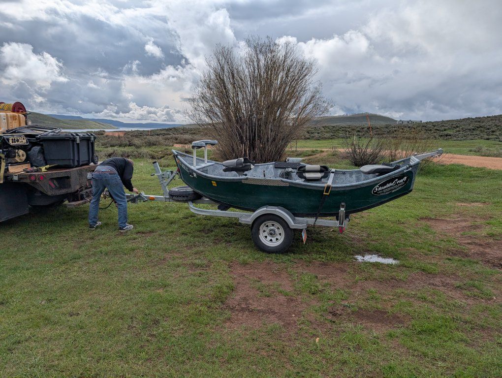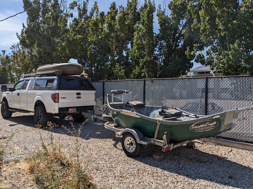 https://stealthcraftboats.com/stealthcraft/minifly/ Fishes 3 and a dog comfortably. Absolutely perfect for 2 anglers and a dog. Upgraded power package-12v battery - 55lb Minn Kota Endura trolling motor- Headlights - Navigation lights - interior lighting- All wired into boat structure. Easily expanded. Add whatever you want. Full size spare. 2 to 1 anchor system. 35lb Fish Fighter anchor (like tornado but fully adjustable weight) Sawyer squaretop oars. Transom motor mount for trolling motor and outboard. Front storage. Rowers seat storage. Under rear seat storage. Internal rod storage for 4 rods. Front and rear seats can be removed as well as lean bar up front for an open layout. Oars refinished annually. Bearings repacked with fresh grease annually. Every other year deep scrub and polished. New tires under 500 miles. You can troll up to about 3mph with the trolling motor. Nothing beats trolling a huge streamer in the fall at Strawberry for Big Cutts. Designed to run up to an 8hp outboard as well. I ran a 3.5 tohatsu for some years- loved it. Up to 8 mph +- wind. It's a fantastic drift boat-Floated rivers in Idaho, Montana, Wyoming, Utah, New Mexico and Colorado. Has all the typical cosmetic dings and scratches from running countless rapids. Nothing that needs to be repaired. Free Rocky Mountain custom pinstripes. Badges of service.