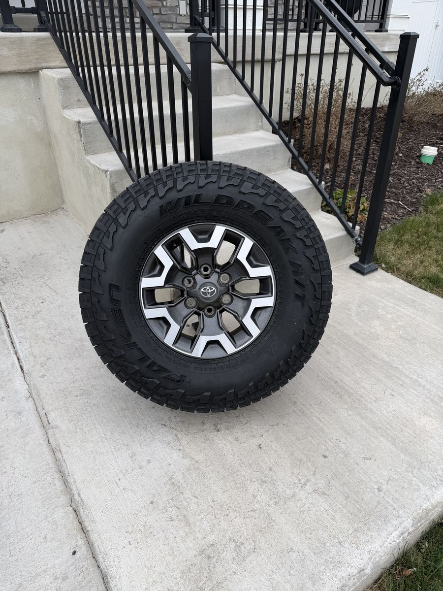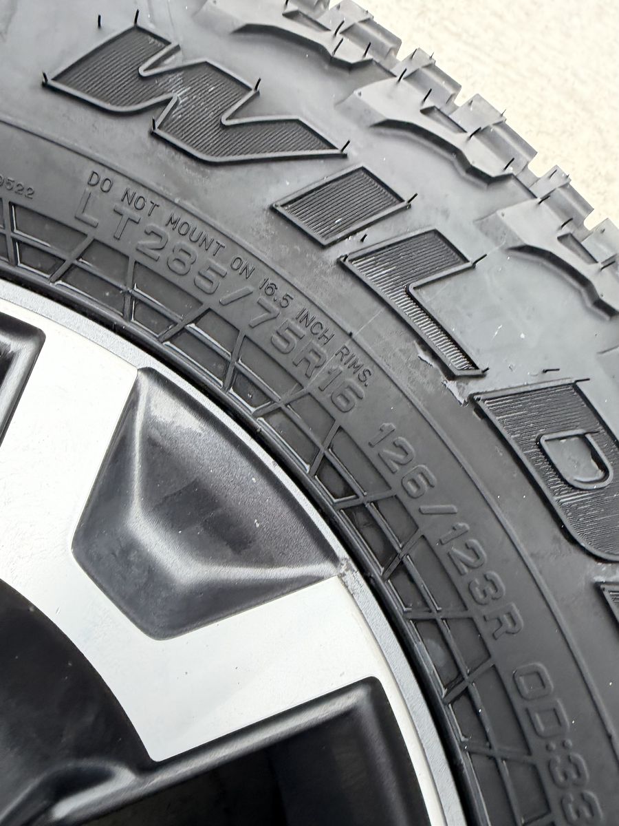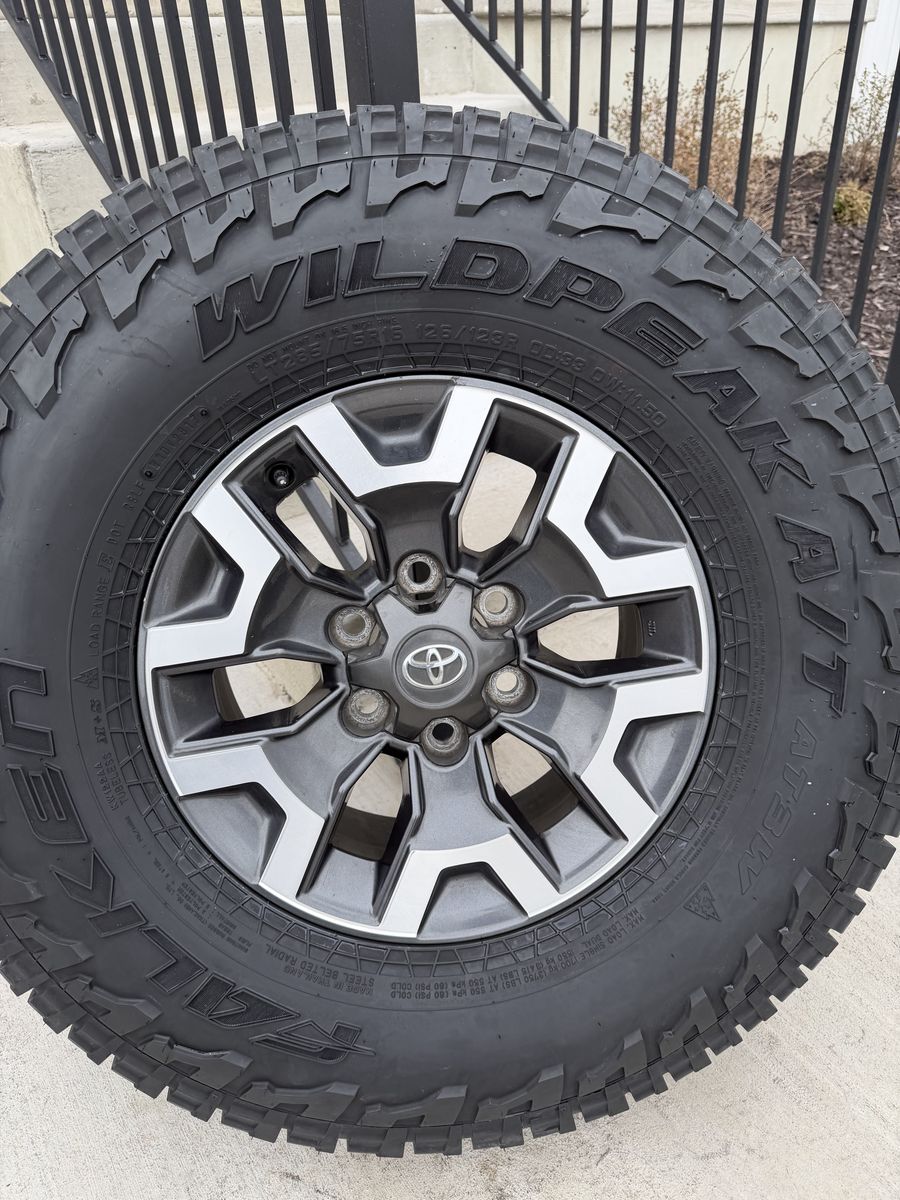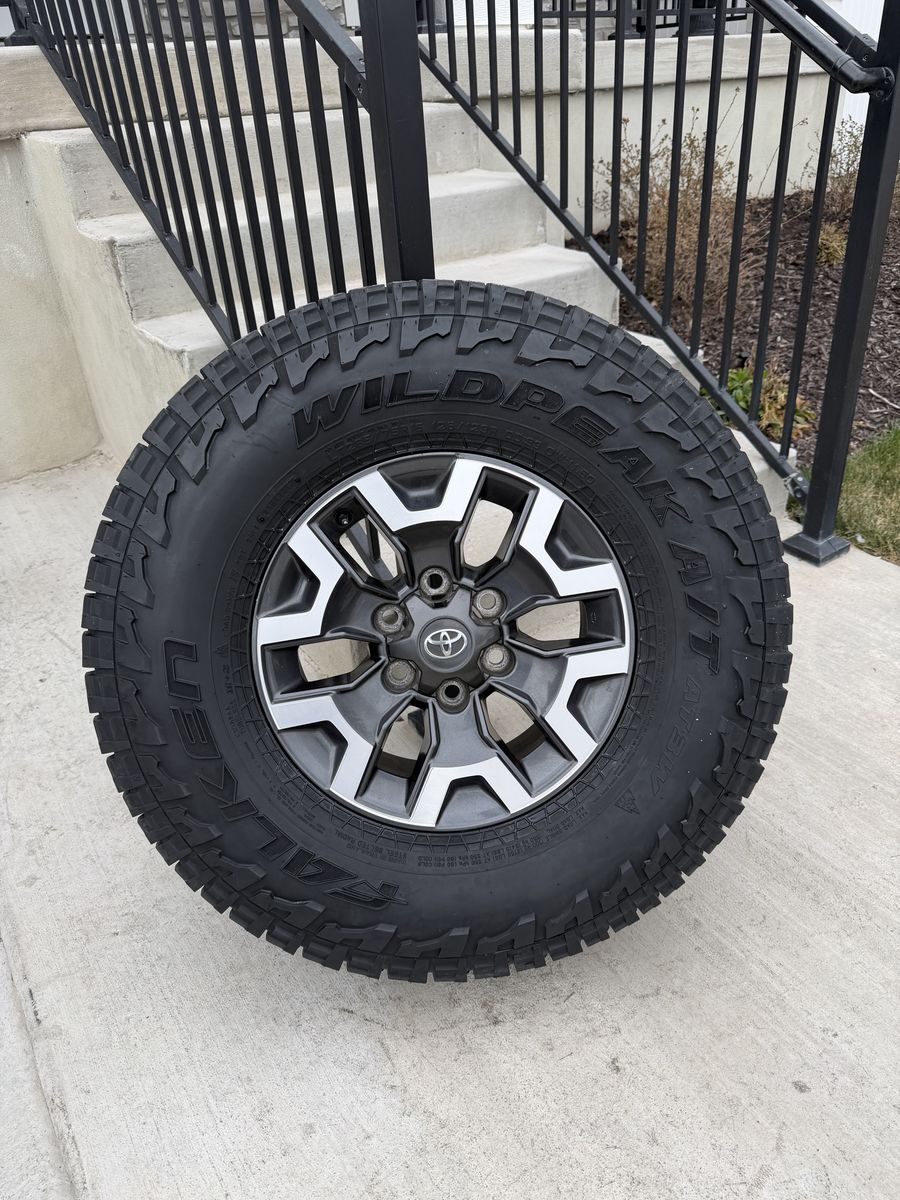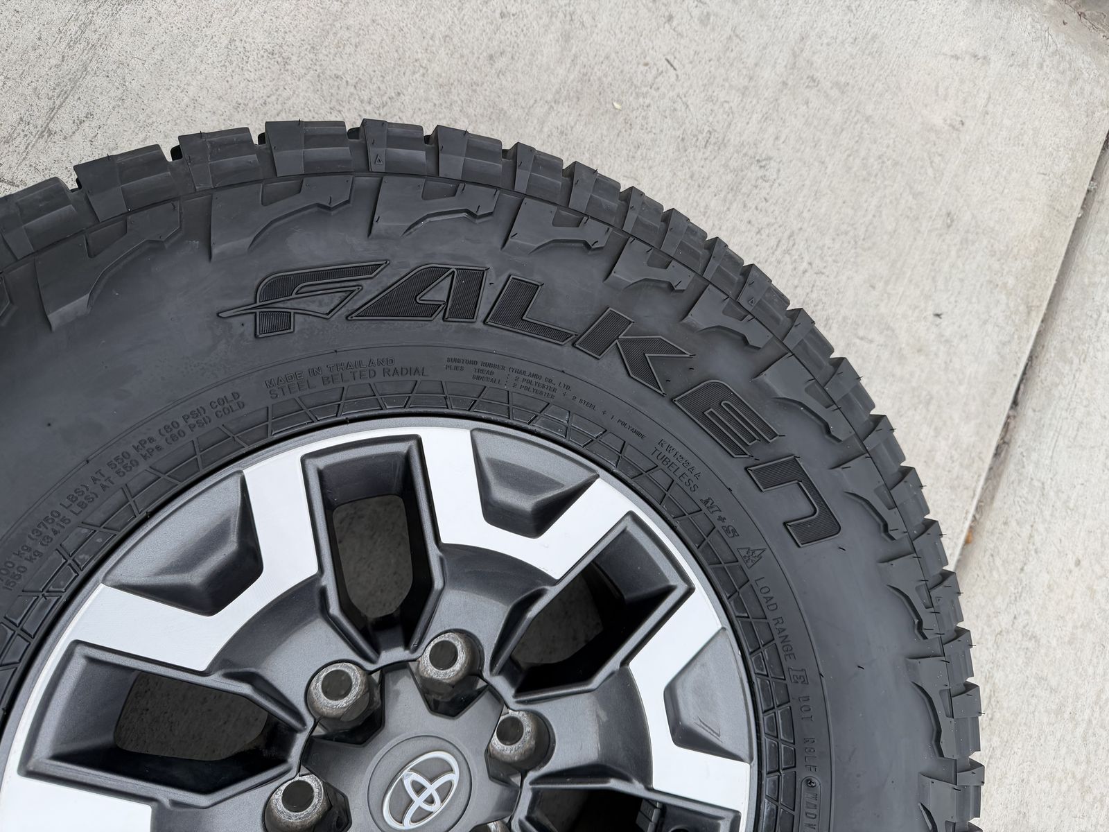 ZelleSet of 4-Toyota Tacoma Rims and Tires 285/75R16 Falken Wildpeak AT3W Load E Almost new in excellent condition,asking $1300 Tires are almost new Rims are like new no scratches or curb rash Comes with lug nuts Bolt pattern 6-5.5 or 6-139.7 Text anytime 385-402-2292