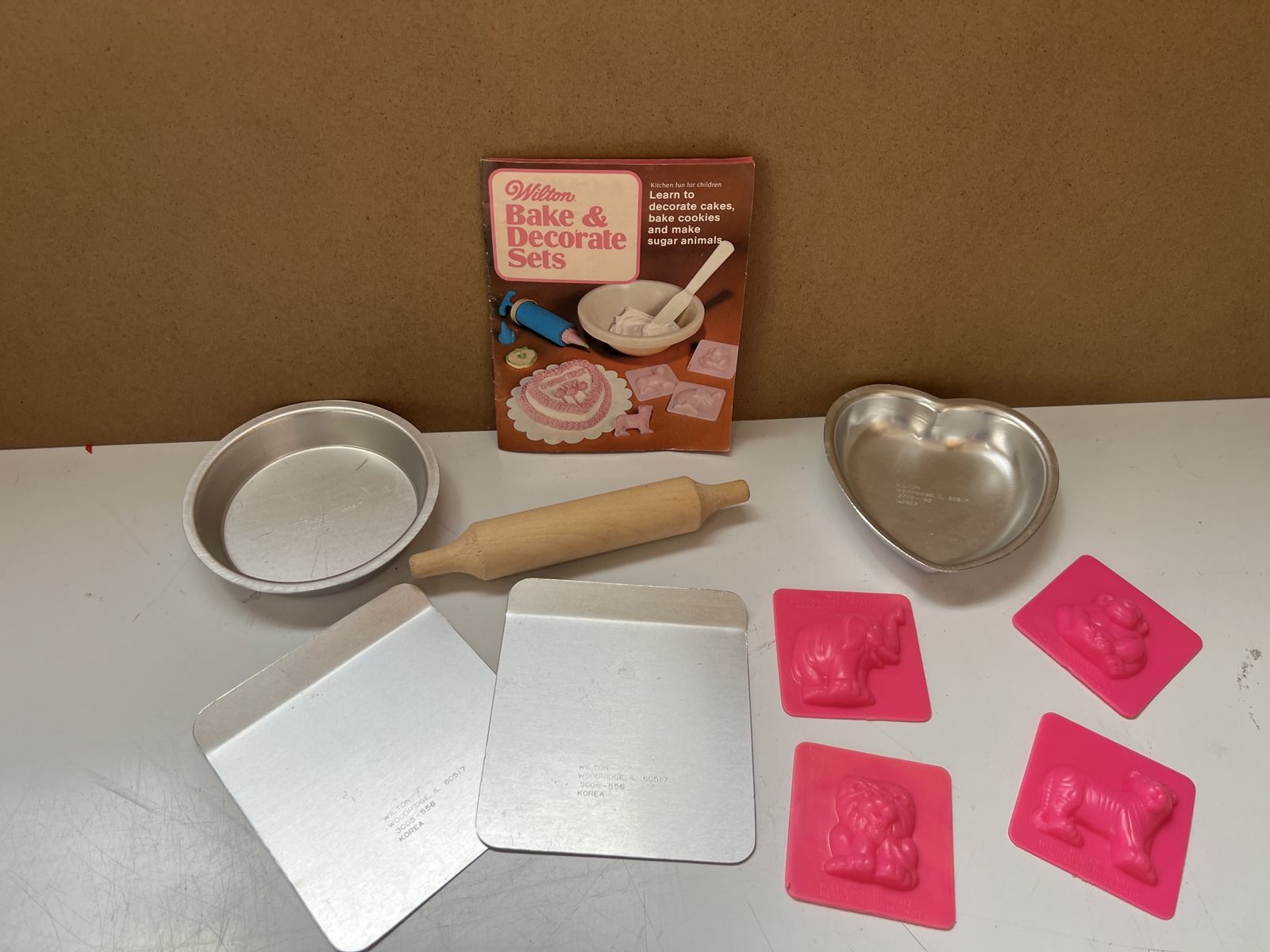 VenmoThis vintage Wilton Bake & Decorate Set from Korea is a collectible kit designed to teach children how to bake cookies and decorate cakes. Includes aluminum baking pans (round and heart-shaped). Features pink plastic molds for creating sugar animals. Comes with a small wooden rolling pin and a recipe/instruction booklet. Also included are 25 of 26 Wilton alphabet plastic cookie cutters. They are so cute! Pick up in Draper. Pet and smoke free home. Cash or Venmo. $35.