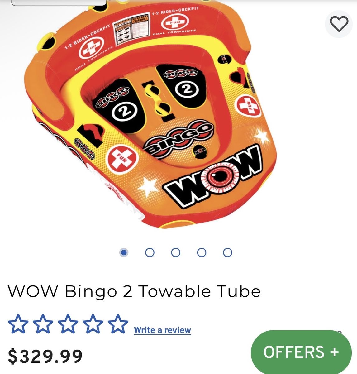 Another original design from WOW, the Bingo 2 was specifically designed with family fun in mind. This action-packed towable gives your family 2 rides for the price of 1. The Bingo tubes are the only cockpit tubes on the market with front and back tow points. Ride in the seated position from the front tow point or connect the rope to the back tow point and ride chariot style. The Bingo comes with a free 11? 4K EZ tow connector which makes it simple to switch tow points even while on the water. The deep cockpit seating with high backrest makes the riders feel more secure while the new drop speed bottom glides smoothly over the water creating less drag on the boat and therefore better gas mileage. The Bingo 2 will be loved by everyone in the family; from those that like a nice and easy ride to those that want something more extreme. 1-2 rider cockpit towable; 340 lbs. maximum capacity Reinforced front and back tow points Deep cockpit construction with high backrest Full nylon cover with heavy-duty zippers Speed valves for fast inflation/deflation
