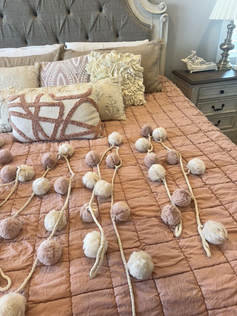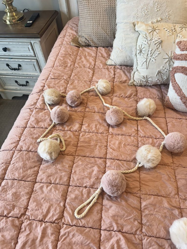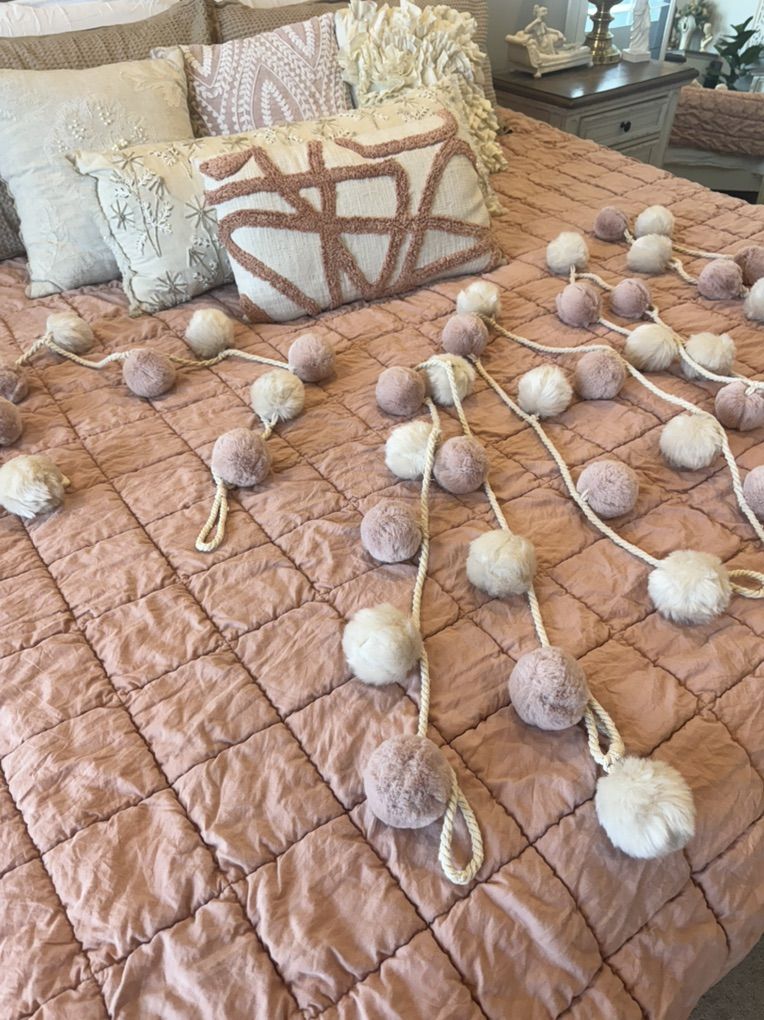 ApplePaySuper cute boho pom pom garland set in soft blush pink and cream tones. There are 5 separate strands, each measuring about 70 inches long. Perfect for nursery decor, bedroom styling, party decor, shelf styling, weddings or adding a soft whimsical touch to a space.