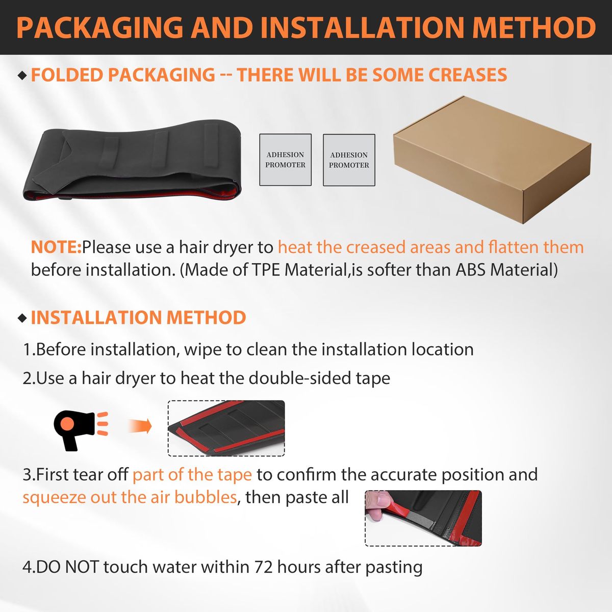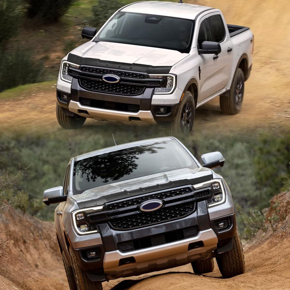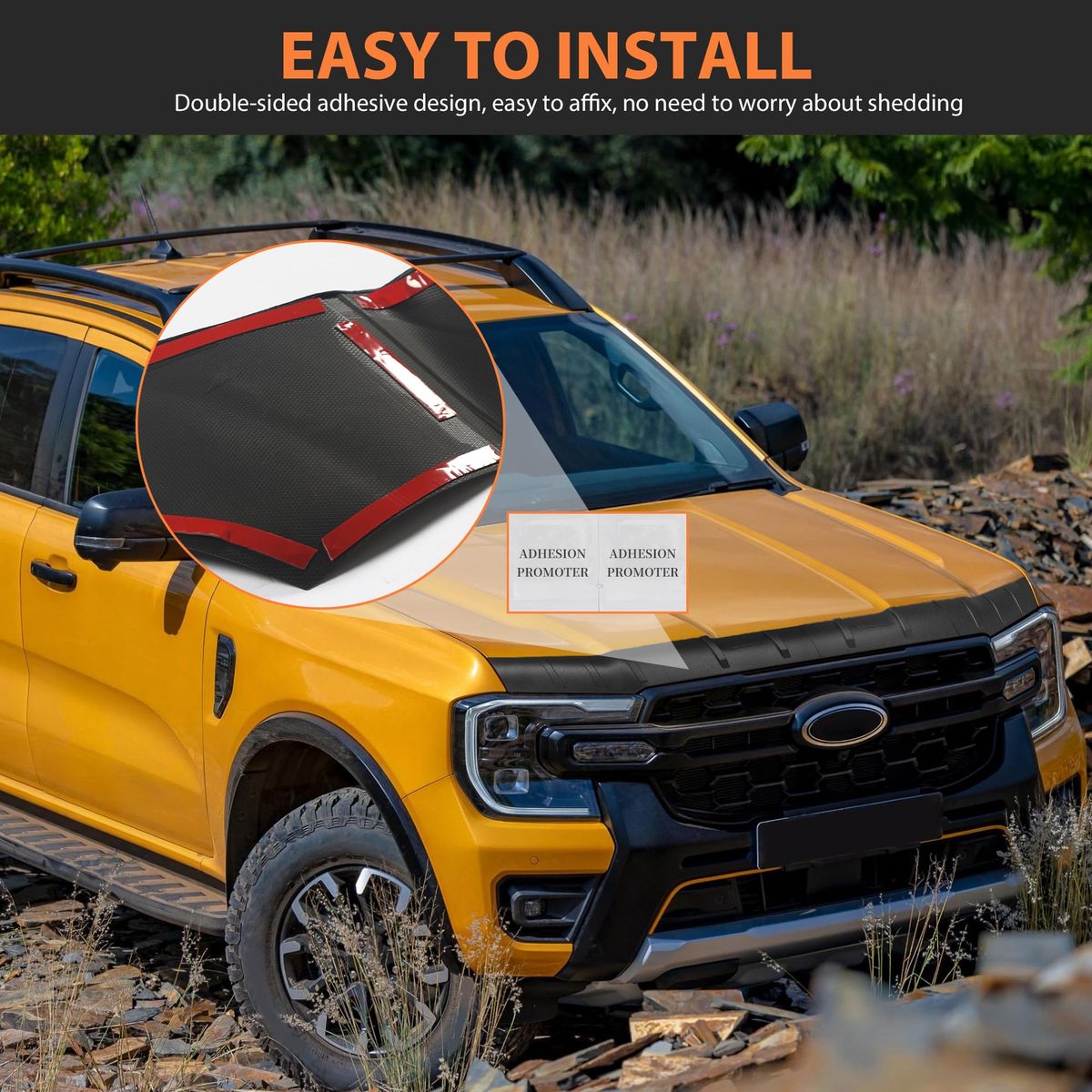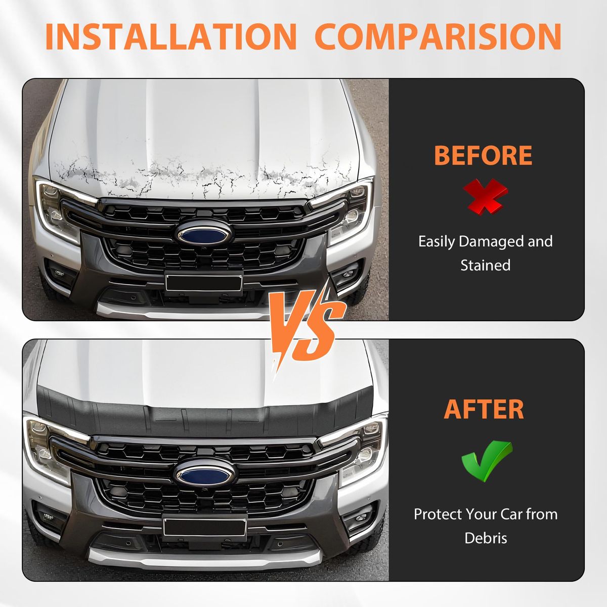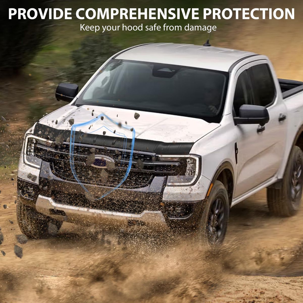 Protective Function: The hood bug deflector replacement for Ford Ranger 2024 2025 2026 Accessories, effectively protects against harsh weather conditions and road debris, reduces wind resistance noise. When driving on bumpy roads or at high speeds, it effectively reduces damage to the front of the vehicle caused by sand, stones, bugs, and other debris splashed up by the front wheels, and also lowers the risk of windshield damage, making it an excellent choice for pickup truck owners High-temperature Resistant Material: This hood shield fitting Fit for Ford Ranger 2024 2025 2026 Accessories is made of premium TPE material, different from ABS material, is softer, offering excellent flexibility, making it resistant to deformation, waterproof, and wear-resistant. It is environmentally friendly, no bad smell, so you can use it with confidence. The hood protector bug deflector features strong impact resistance and outstanding weather resistance, ensuring color stability and long-term durability Non-fading and high-adhesion: The material of our hood protector Fit for Ford Ranger 2024 2025 2026 Accessories has been upgraded to adapt to various outdoor weather conditions. It will not easily fade under high-temperature exposure, nor will it come off due to adhesive failure in rainy or snowy weather, allowing you to use it for a long time in various outdoor environments to protect your vehicle(Before installation, make sure to scrub your hood clean) Protective Function: The hood bug deflector replacement Fit for Ford Ranger 2024 2025 2026 Accessories, effectively protects against harsh weather conditions and road debris, reduces wind resistance noise. When driving on bumpy roads or at high speeds, it effectively reduces damage to the front of the vehicle caused by sand, stones, bugs, and other debris splashed up by the front wheels, and also lowers the risk of windshield damage, making it an excellent choice for pickup truck owners Easy to Install and Clean: This bug deflector Fit for Ford Ranger 2024 2025 2026 Accessories is quick and easy to install, using double-sided tape to stick. Before installation, use a hair dryer to heat the double-sided tape, and first tear off part of the tape to confirm the accurate position and squeeze out the air bubbles, then paste all making installation effortless. Do not touch water within 72 hours after pasting.It's easy to clean, just wipe it with a damp cloth when needed.(This bug deflector is packaged in a folded manner. After receiving it, please use a hair dryer to heat the creases, then wait for it to be flattened before installation)