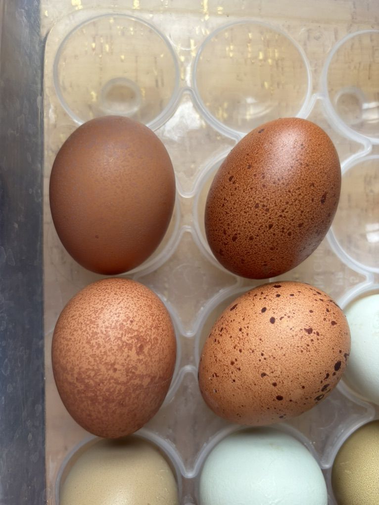 One hen will lay a variety of eggs from super speckled to just a few speckles or heavy bloom to a light bloom within a week. But all of them lay either heavy speckles or thick blooms often.