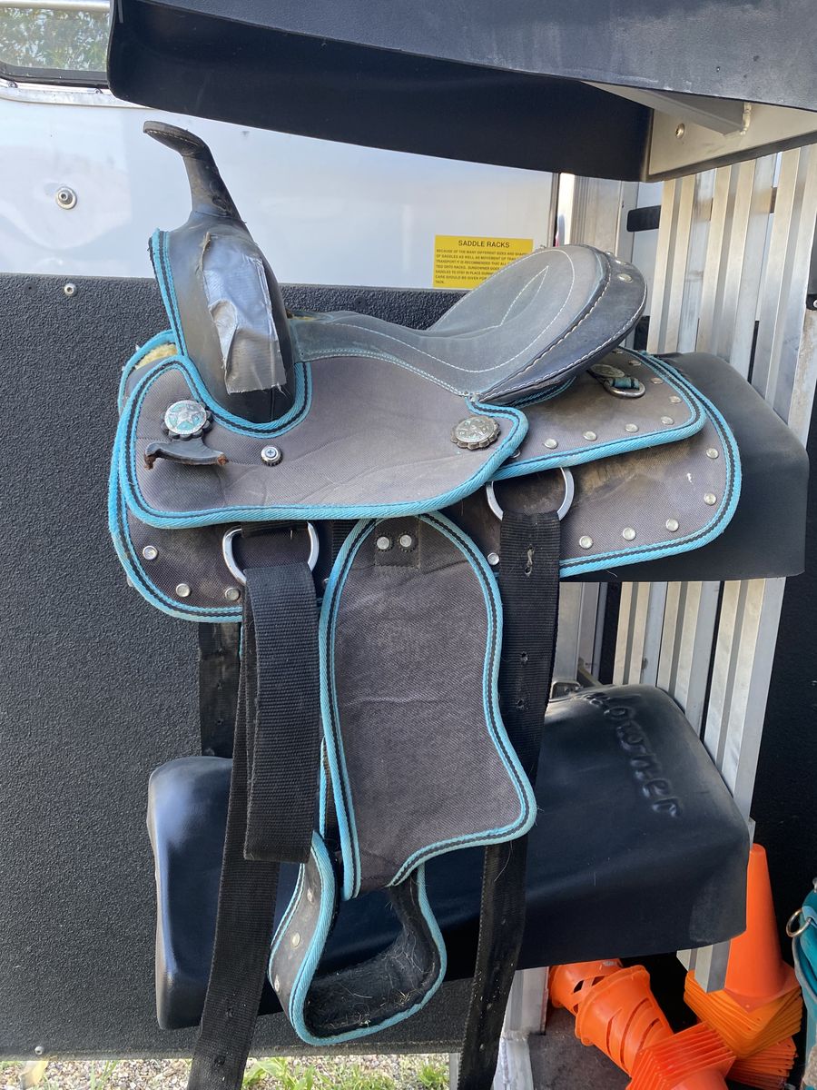 Abused kid saddle! Definitely has seen better days but has more to give. Bought it in the shape that it’s in and haven’t used it once. Can deliver to Nephi.
