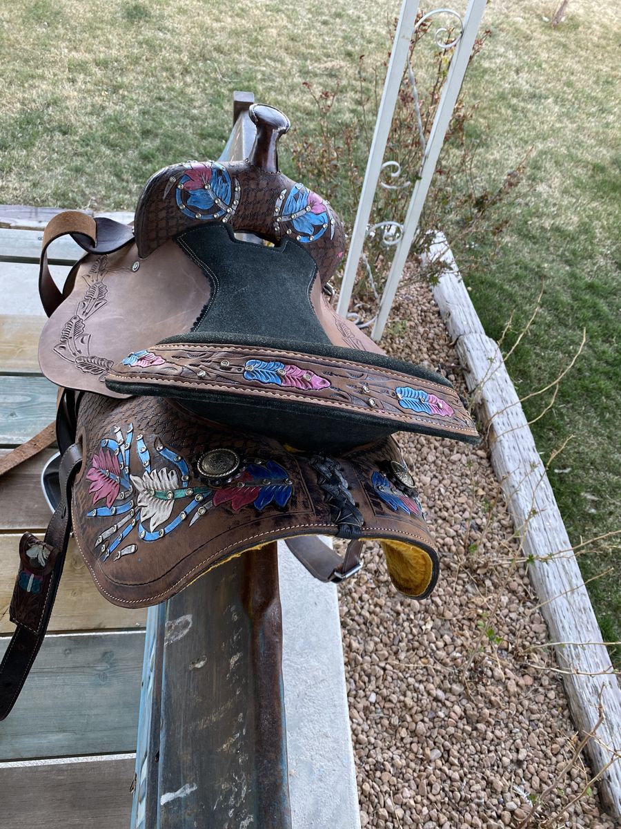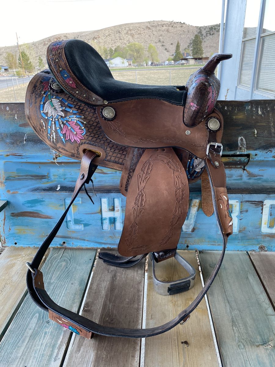No brand 15.5” Western saddle. Been on a horse maybe twice. Comes with a headstall and breast collar. Can deliver to Nephi. OBO