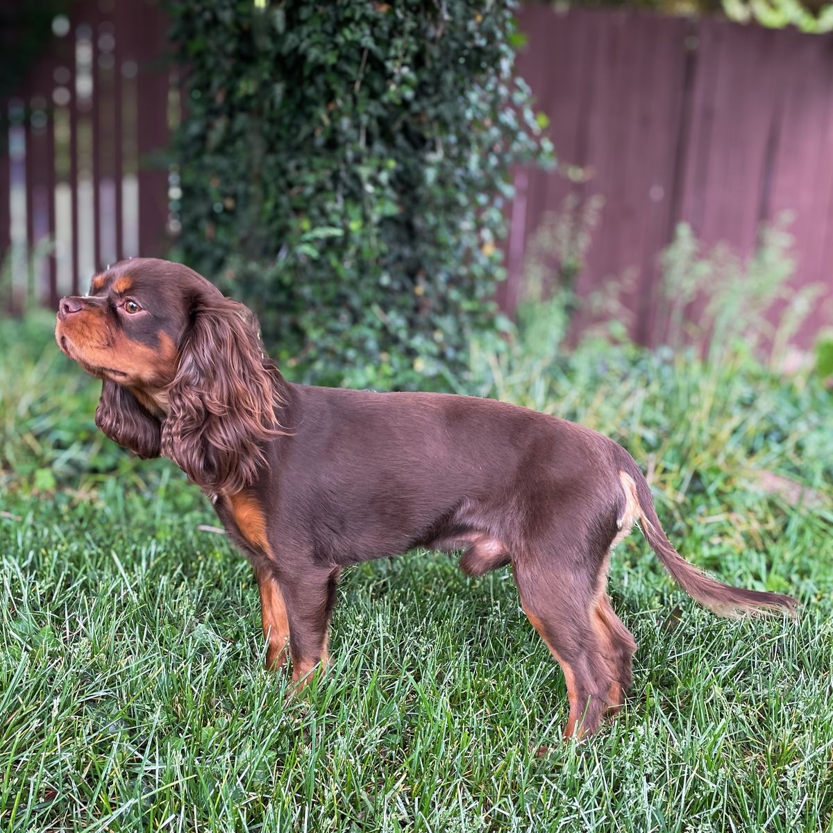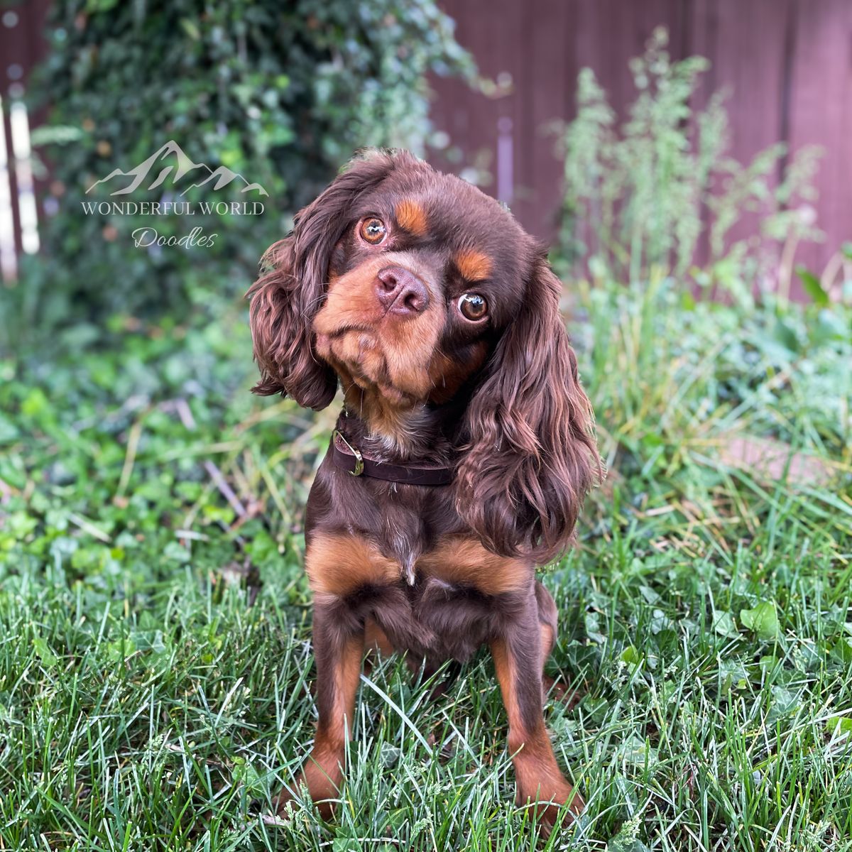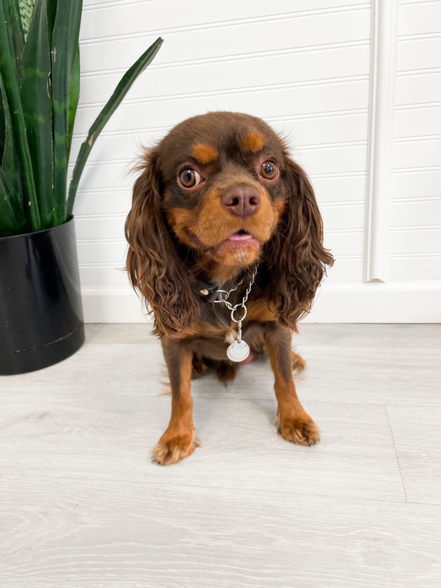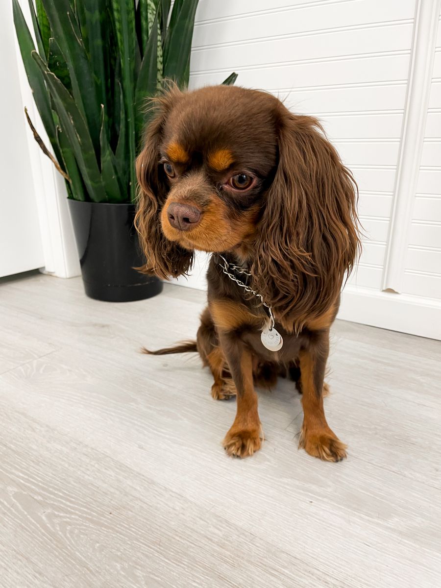 Archie is 15.5 lbs and is a super rare Chocolate AKC Cavalier!!! He is such a lover and is just the sweetest most gorgeous dog. He has a nice wide face with a short nose that everyone loves. Archie is small for a Cavalier and so adorable in person. He is very human focused and mellow.