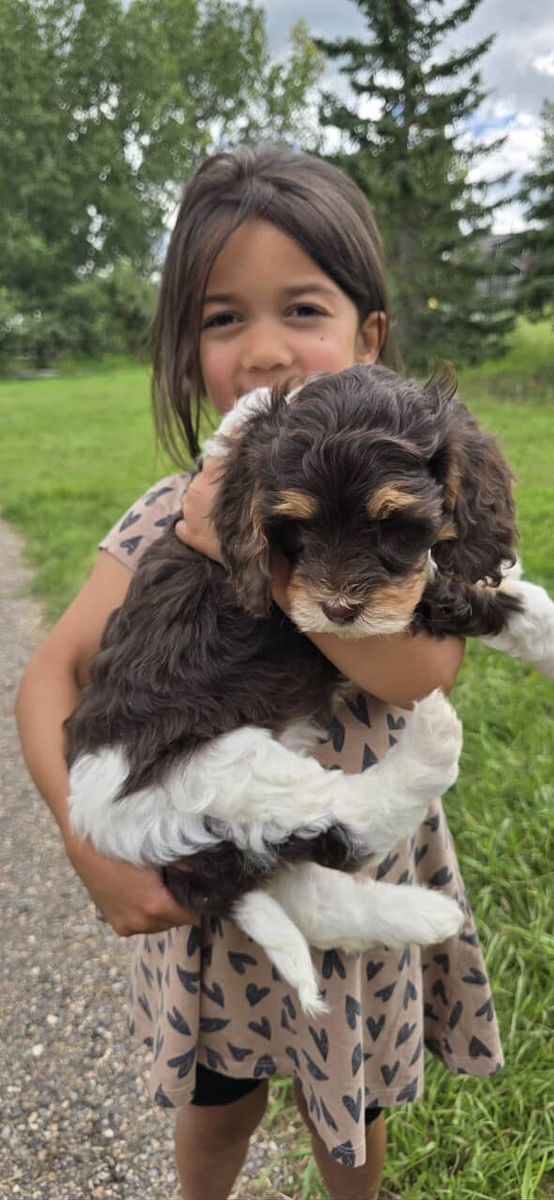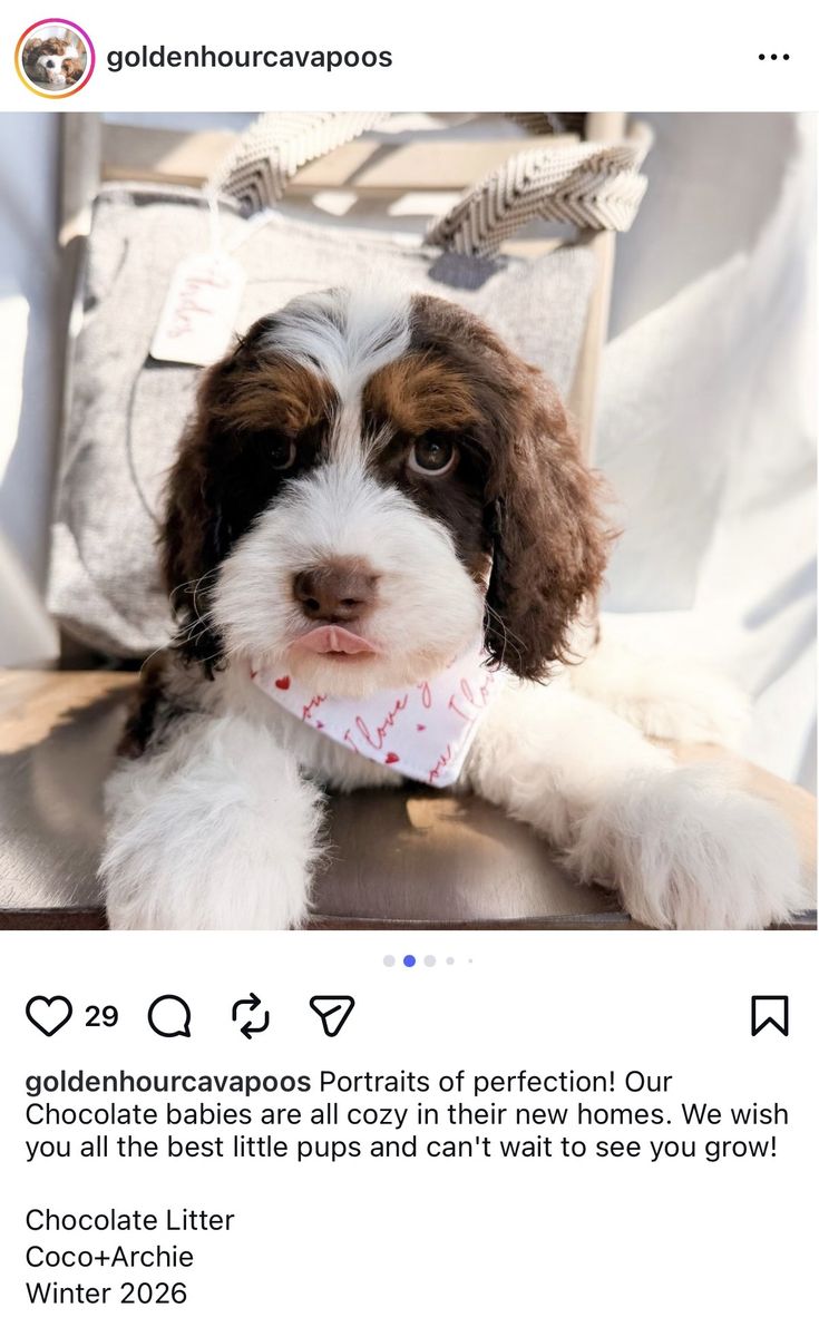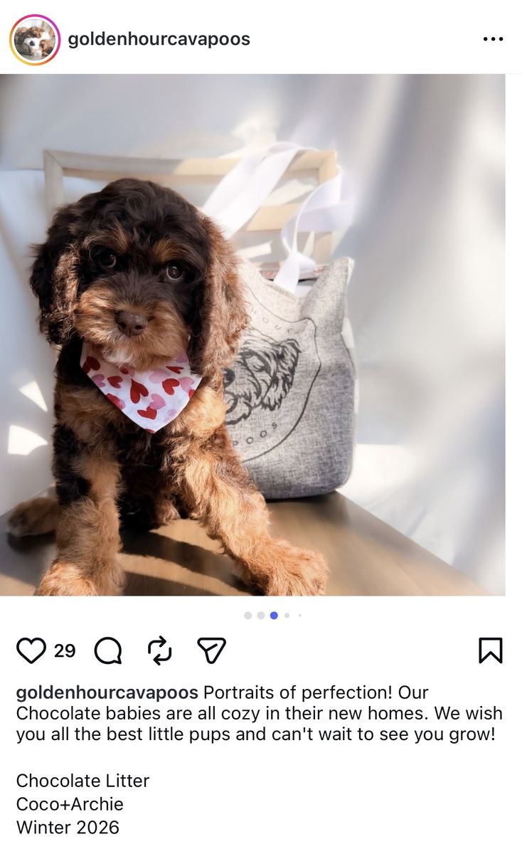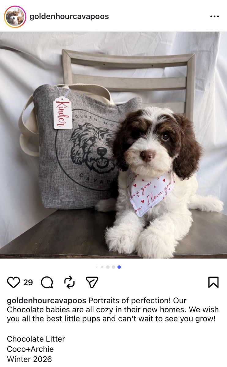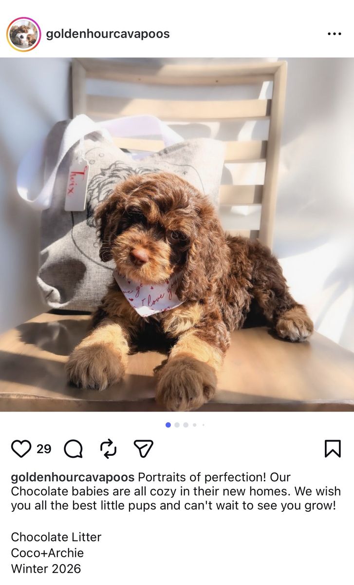 Archie is 15.5 lbs and is a super rare Chocolate AKC Cavalier!!! He is such a lover and is just the sweetest most gorgeous dog. He has a nice wide face with a short nose that everyone loves. Archie is small for a Cavalier and so adorable in person. He is very human focused and mellow.
