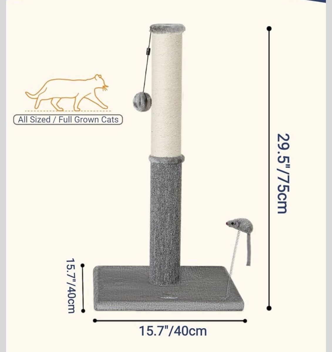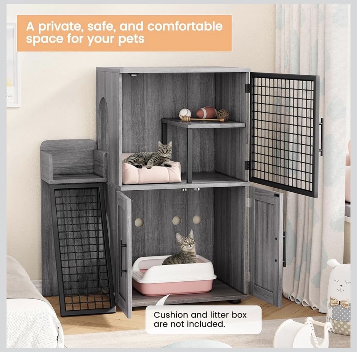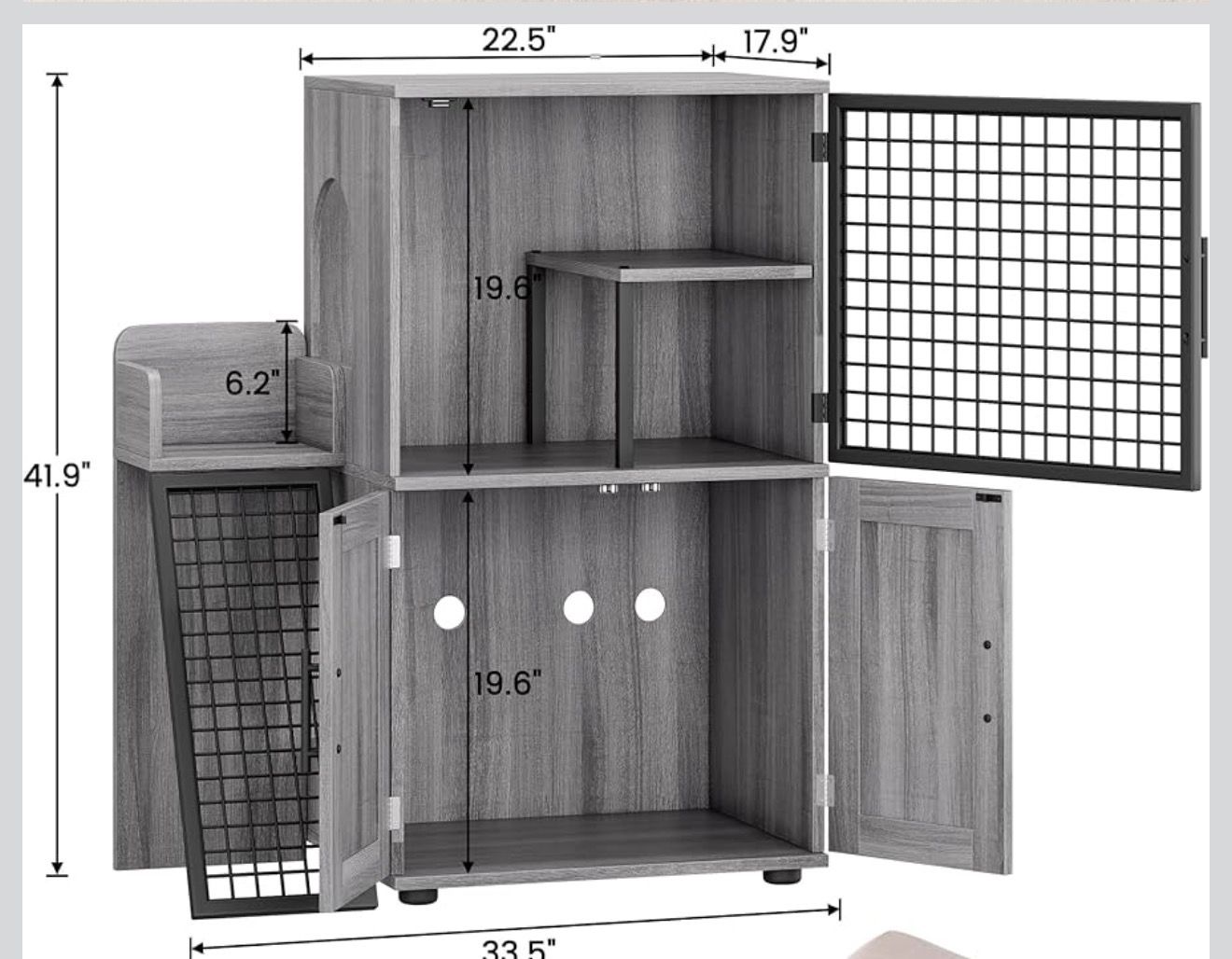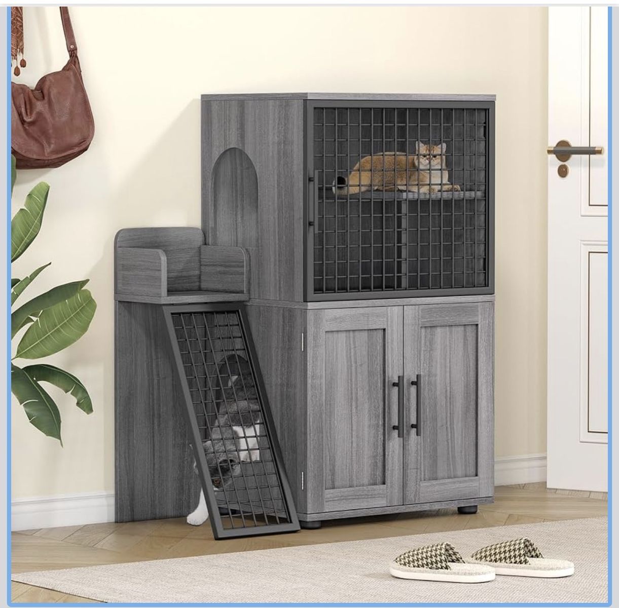 VenmoLike New. Assembled Modern Cat Litter Box Enclosure with Platform, Double Layer Hidden Litter Box, Villa Cat House with Ladder, 33.5" l x 17.9" w x 41.9" h,Dark Grey. Also Comes with 29.5" Tall Cat Scratching Post, Cat Scratchers for Indoor Cats, Sisal Scratch Post & Carpet Post in One, Light Gray. Does not include the cat beds or cat bowls, it is just the cabinet and scratching post. I purchased this for my cat to have a safe place to eat and keep litter away from the dogs but it did not fit in the space I need to keep it. Have to purchase taller/slimmer version.
