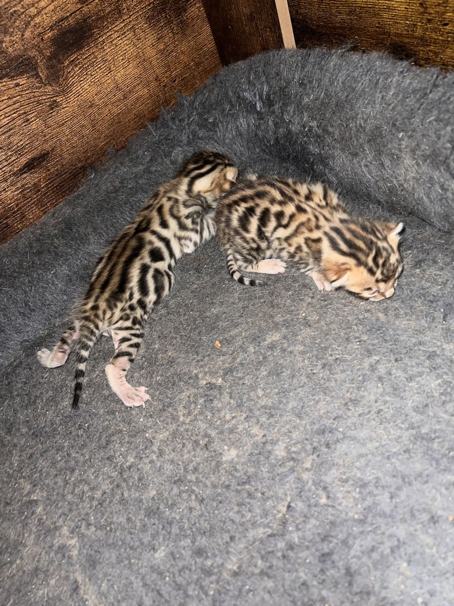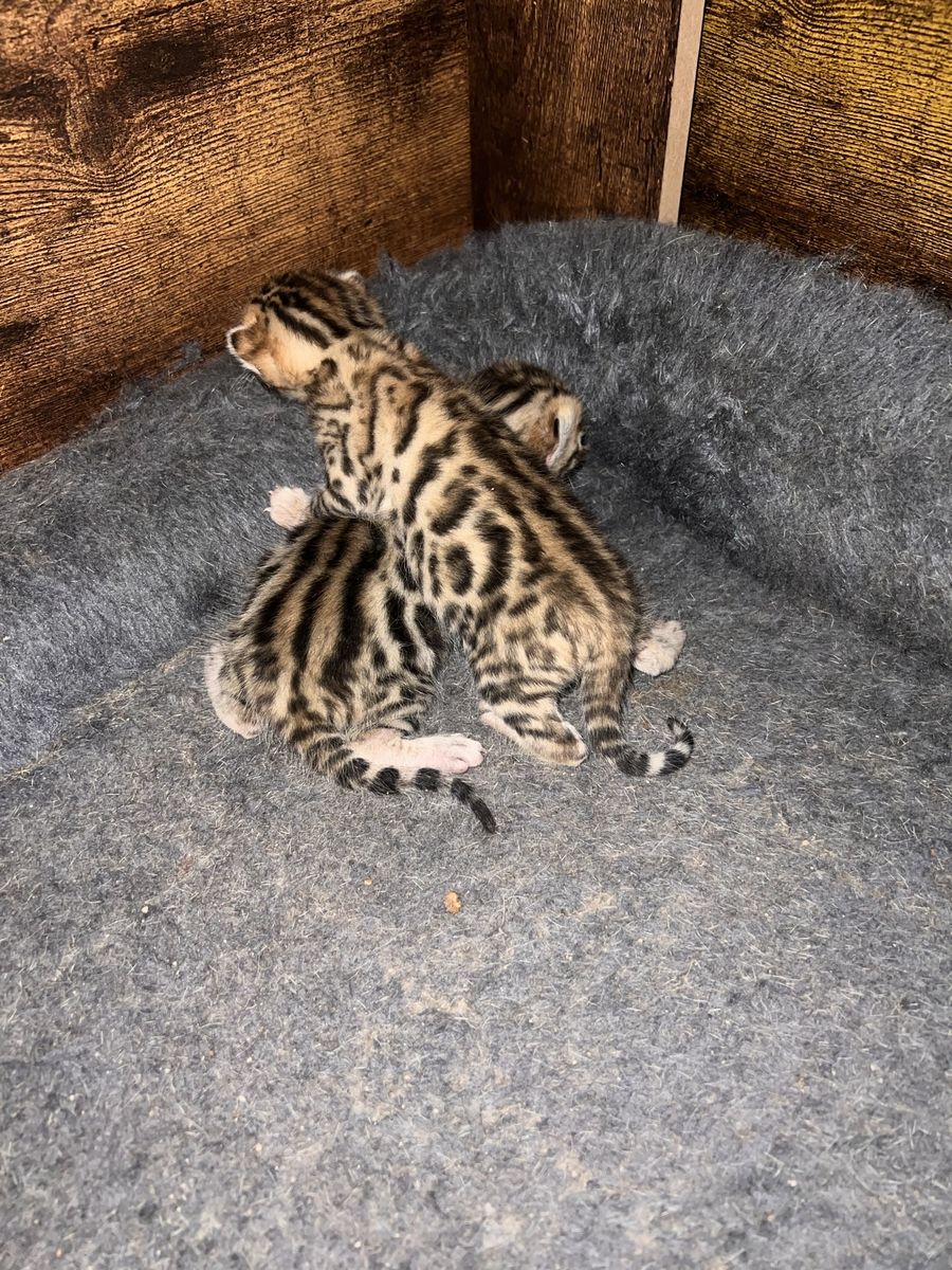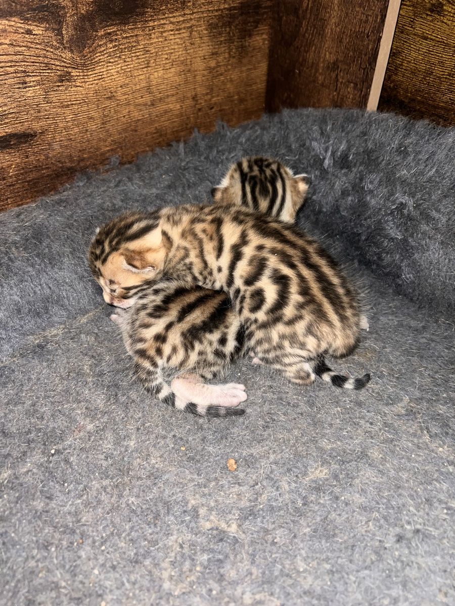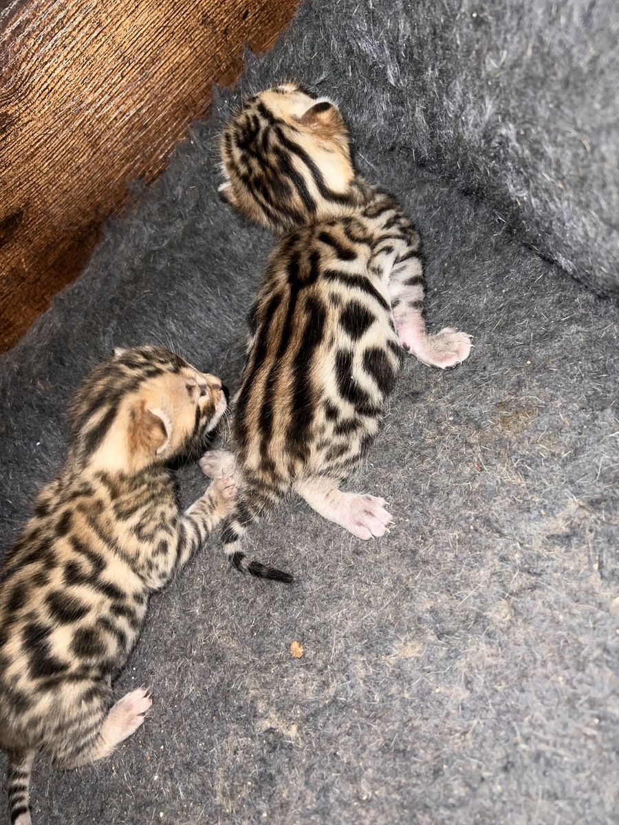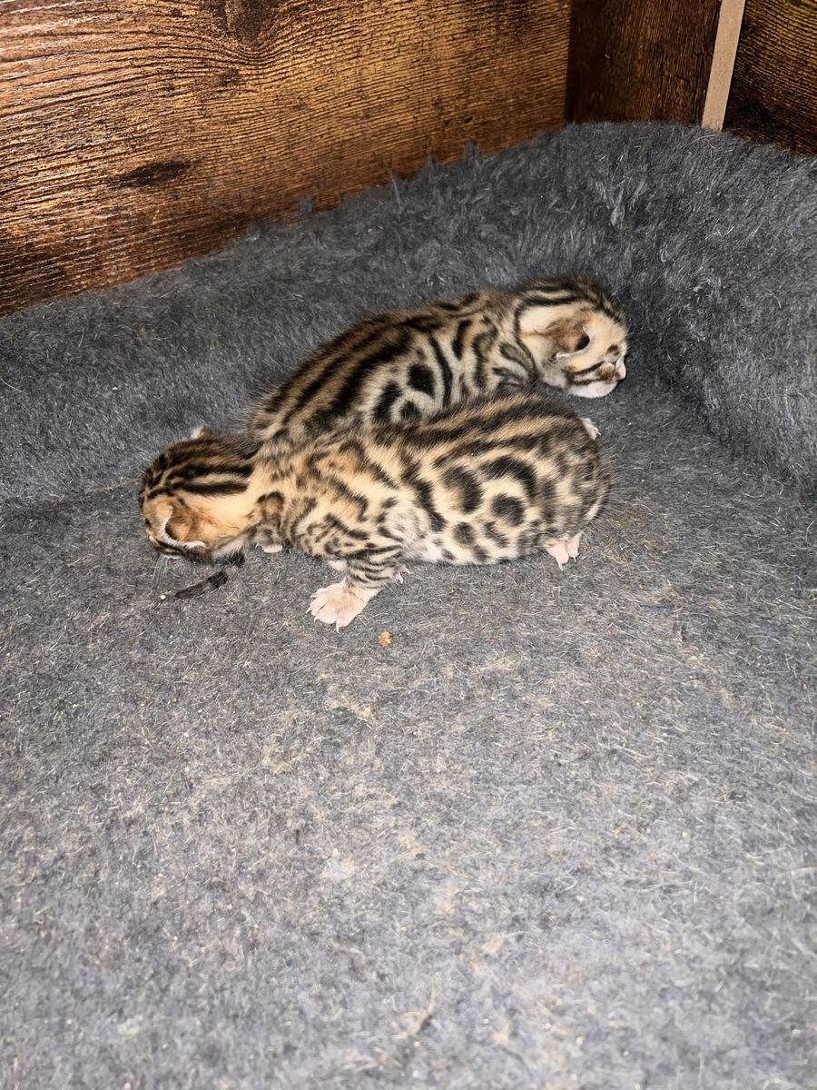 We have 2 purebred bengal kittens available 1 female and 1male. Born 04/07/2026 the females name is Tyra and the males name is Tailon . These are purebred bengal kittens they have a unique pattern simular to jaguar markings, they come in many different colors but these 2 kittens will most likely be red. They are extremely exotic cats if you don't know what a bengal is i encourage you to do your research. Bengals are more active than normal house cats they can jump up to 7ft high just from the ground and they are fast cats, they also can enjoy water. These cats move like jaguars not like normal house cats they are a very rare and unique breed. the last pics are of the parents Rajah & Iris are their names. Iris is their mother she has had many litters and does great with them. The kittens will stay with there mother until they are 10 weeks old. These kittens will be very beautiful and have rare big rosettes they are already so pretty for their age and they will only get prettier as they grow. I will update the photos to show you how they are growing and how much prettier they get by the day. These kittens will come with a gift bag of their essentials some of their toys, food, blanket, ect. if you want to know more about these kittens and my cats you can check us out on Instagram Facebook & Tik Tok @exottic_bengals_society