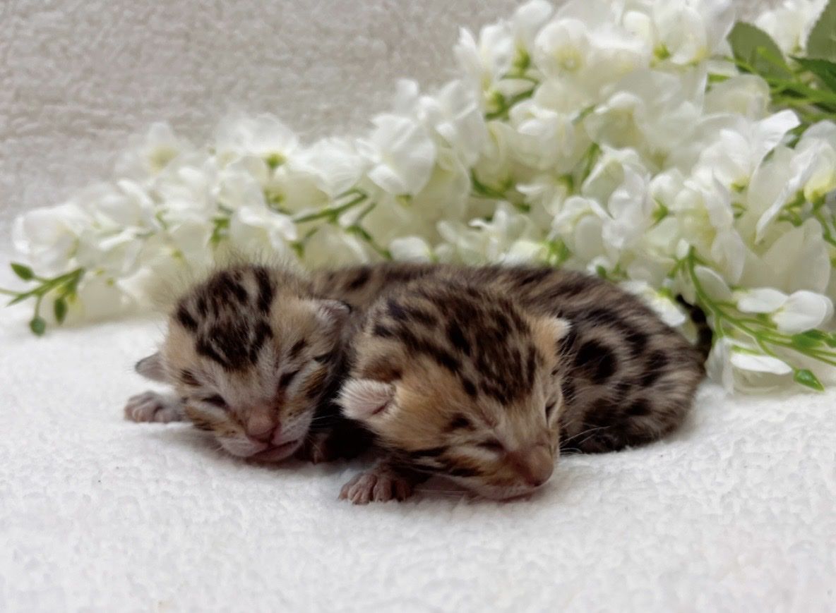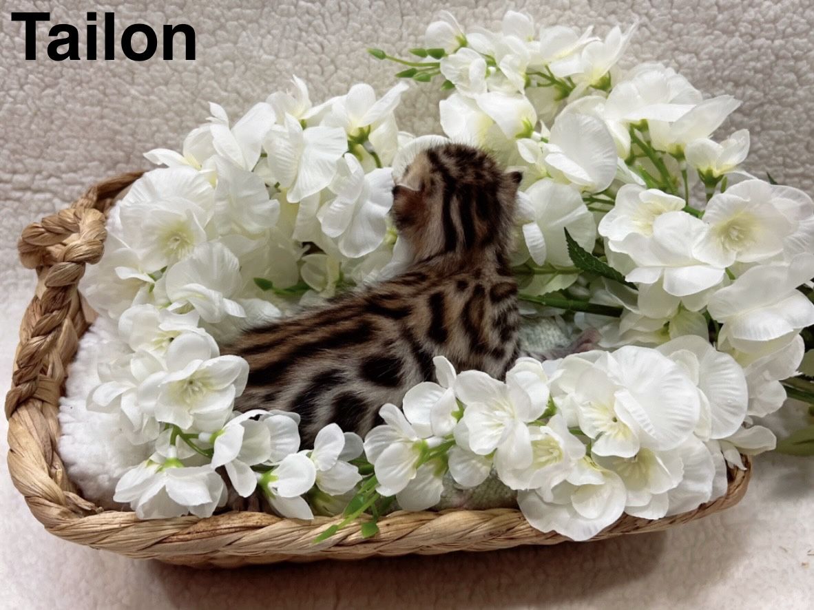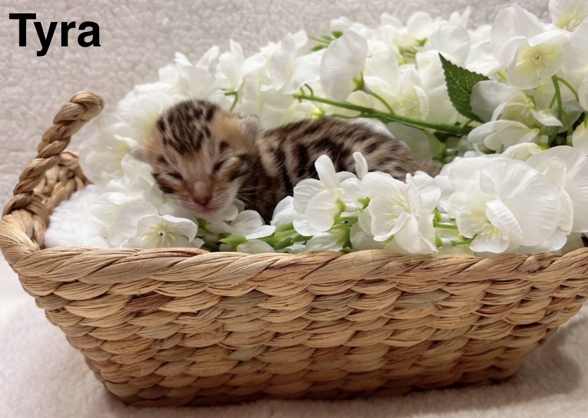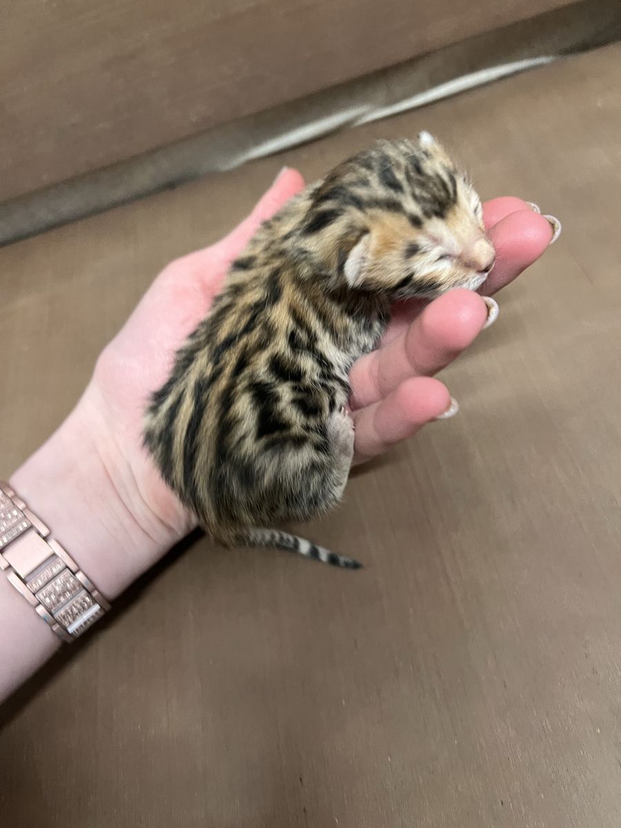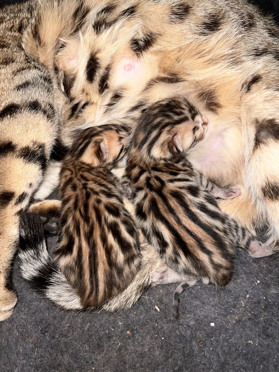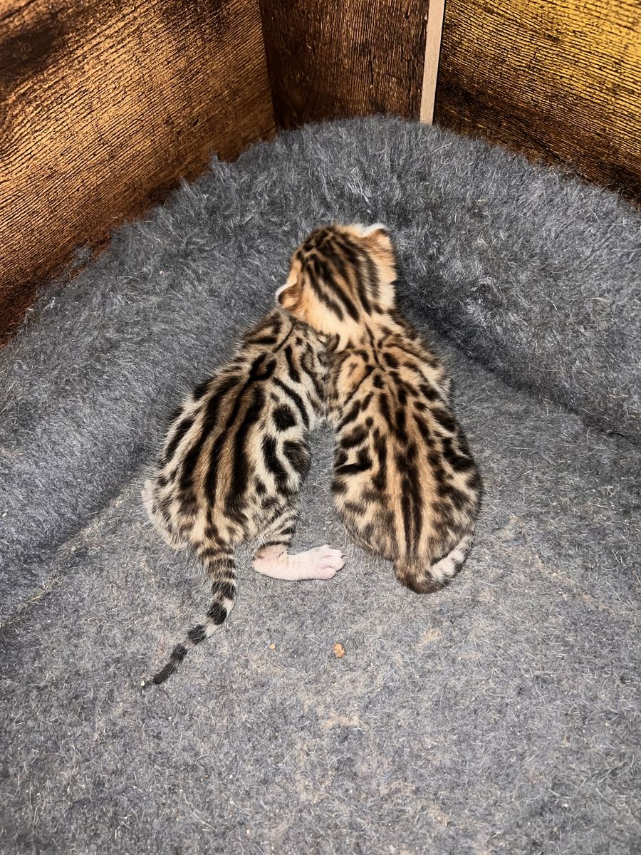 We have 2 purebred bengal kittens available 1 female and 1male. Born 04/07/2026 the females name is Tyra and the males name is Tailon . These are purebred bengal kittens they have a unique pattern simular to jaguar markings, they come in many different colors but these 2 kittens will most likely be red. They are extremely exotic cats if you don't know what a bengal is i encourage you to do your research. Bengals are more active than normal house cats they can jump up to 7ft high just from the ground and they are fast cats, they also can enjoy water. These cats move like jaguars not like normal house cats they are a very rare and unique breed. the last pics are of the parents Rajah & Iris are their names. Iris is their mother she has had many litters and does great with them. The kittens will stay with there mother until they are 10 weeks old. These kittens will be very beautiful and have rare big rosettes they are already so pretty for their age and they will only get prettier as they grow. I will update the photos to show you how they are growing and how much prettier they get by the day. These kittens will come with a gift bag of their essentials some of their toys, food, blanket, ect. if you want to know more about these kittens and my cats you can check us out on Instagram Facebook & Tik Tok @exottic_bengals_society