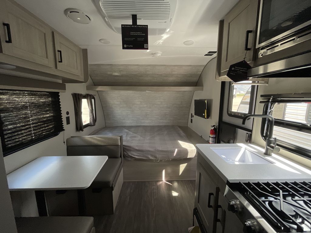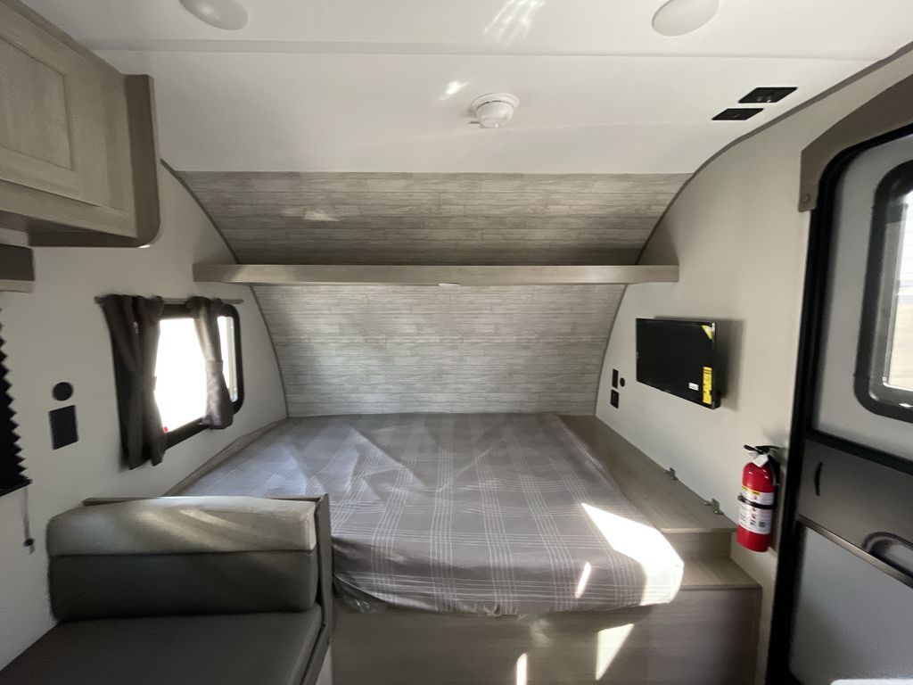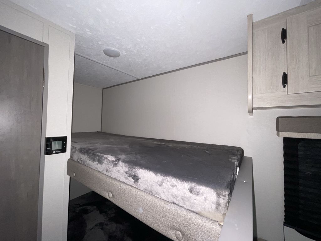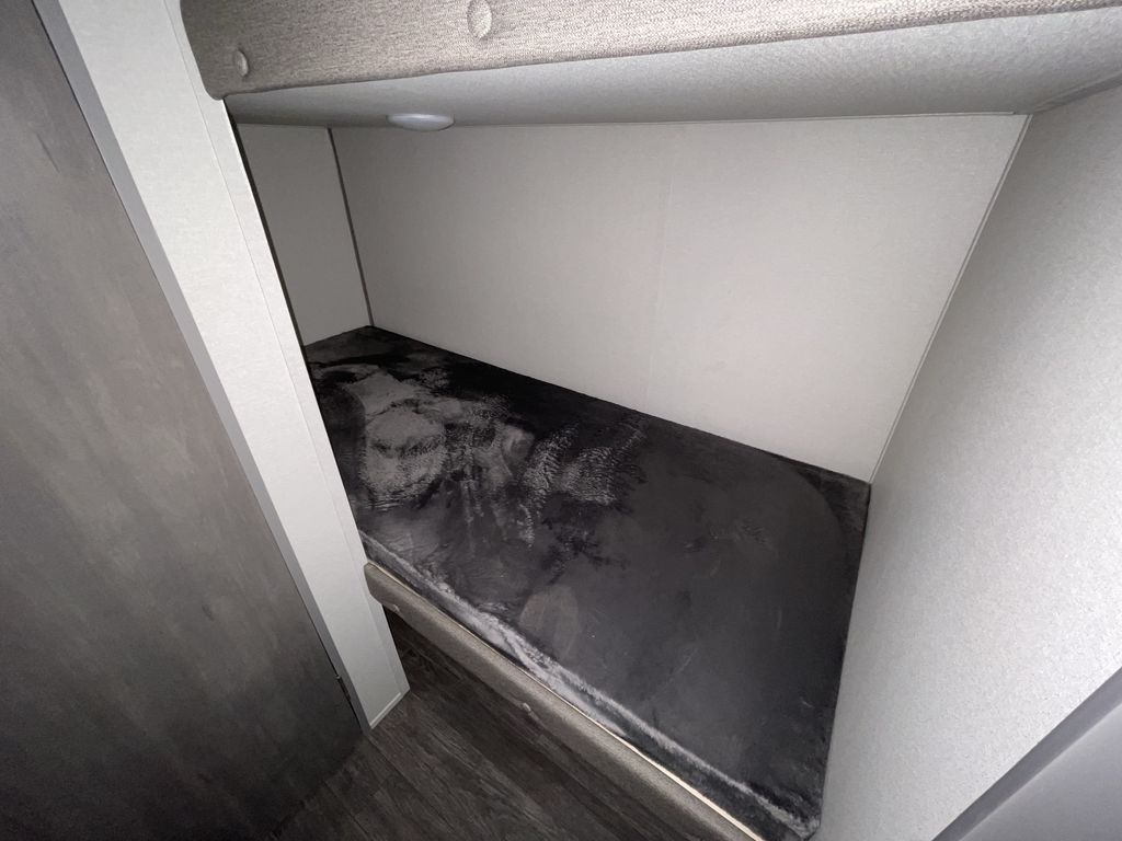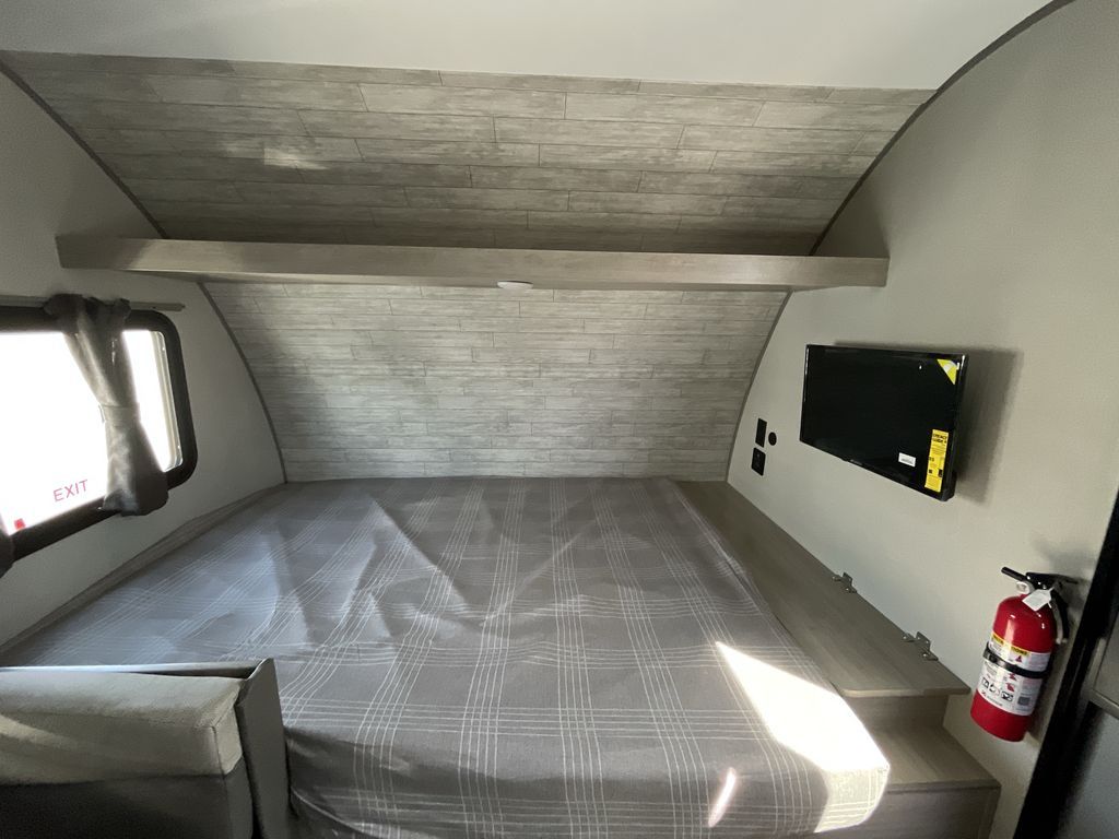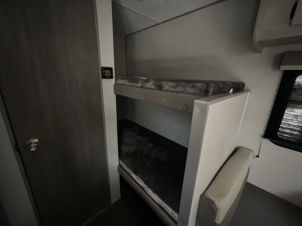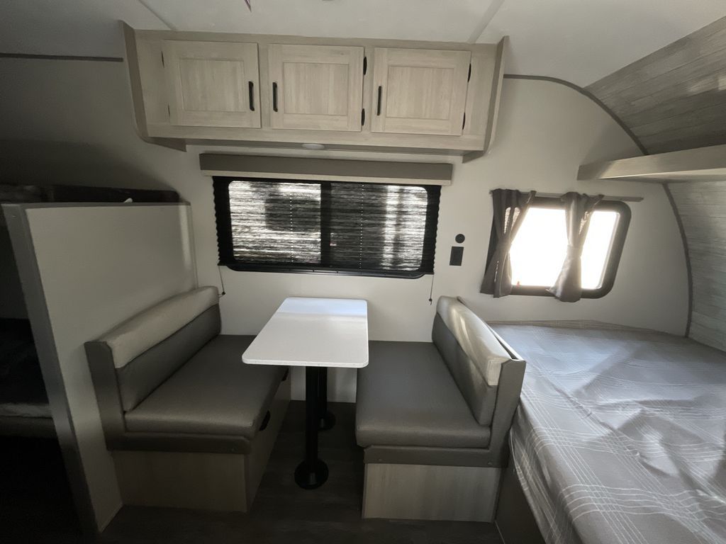 This cozy travel trailer can sleep five, so pack up and head out! You will have a queen bed up front to sleep on each night instead of an air mattress, and the little ones can take the 28" x 70" bunk beds! There is also a booth dinette here that can sleep an additional guest and is perfect for sharing meals during the day. The two burner cooktop and microwave oven means you won't have to cook over a campfire, and the private toilet and shower lets you clean up after a day outdoors. This model includes plenty of storage space, including bedroom storage, an exterior pass-through, plus additional outside storage beneath the bunks for hiking gear!