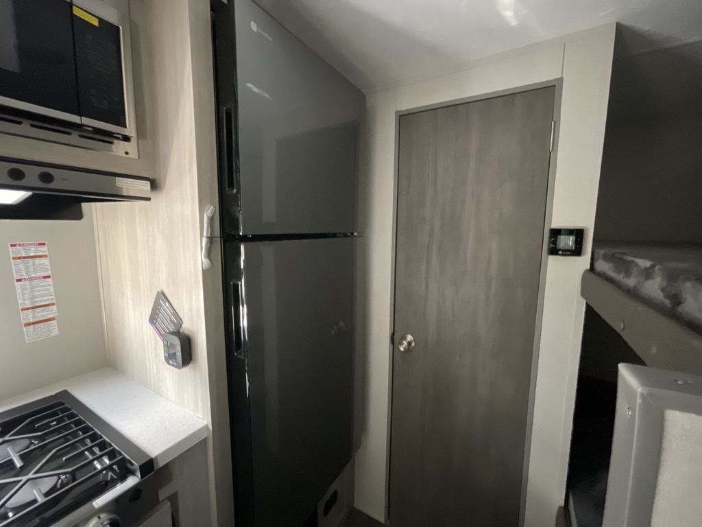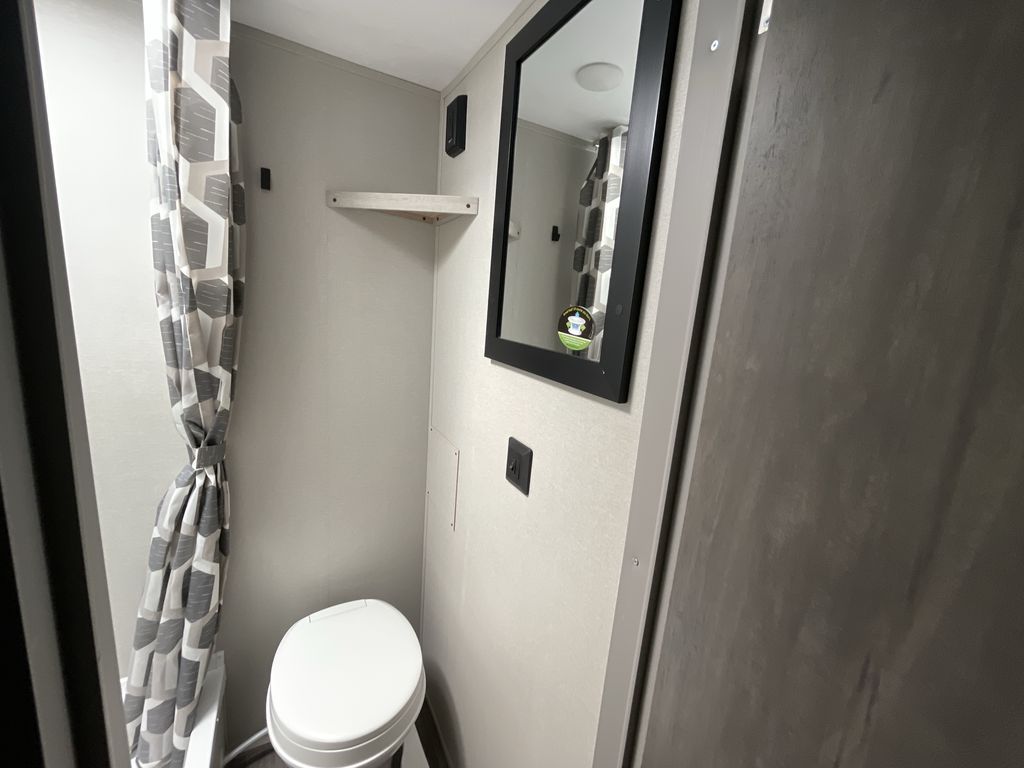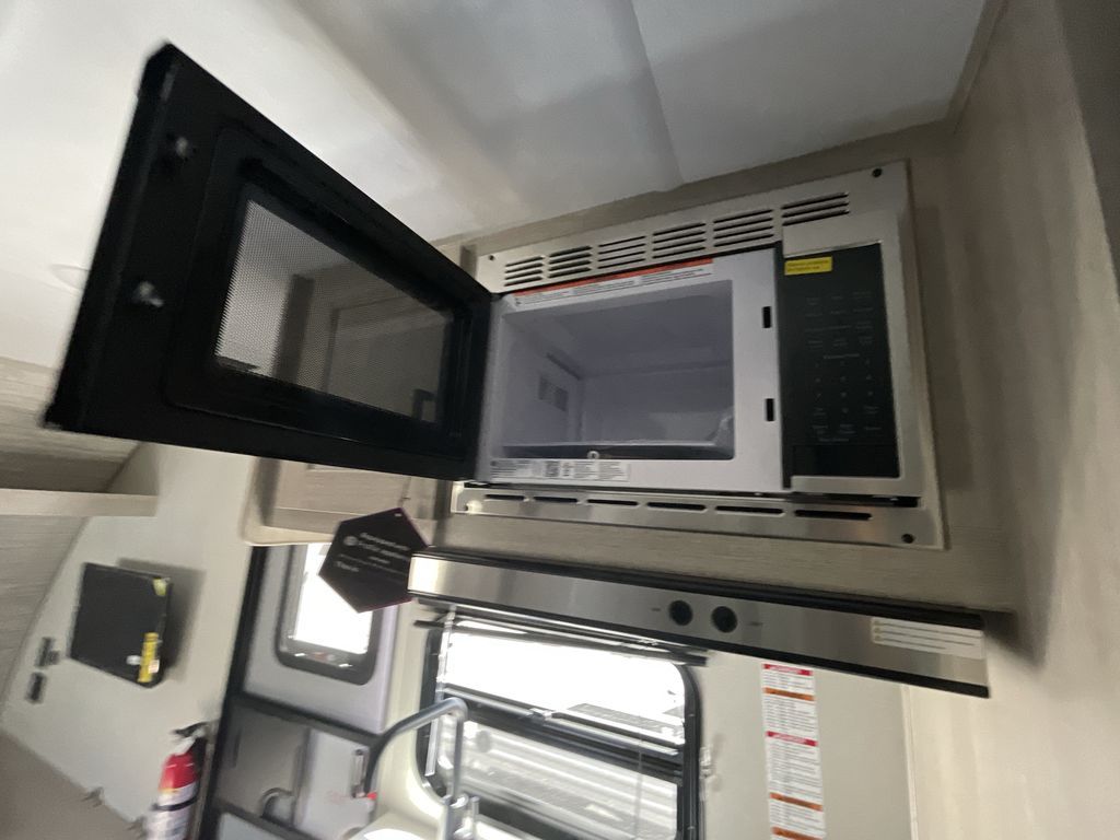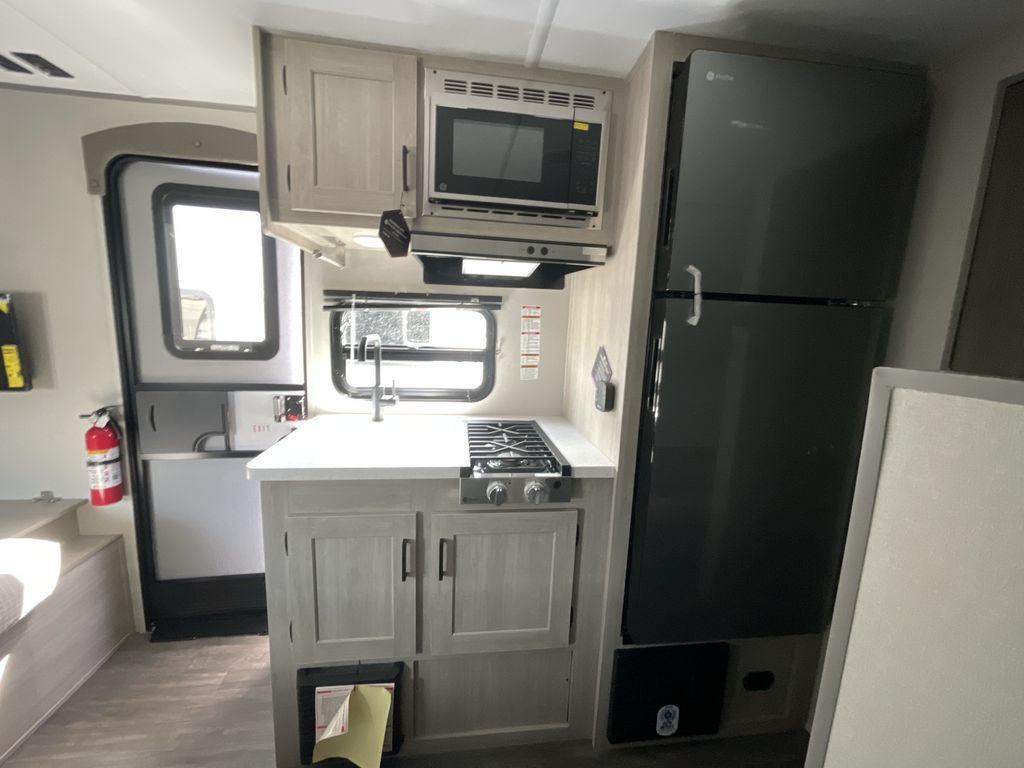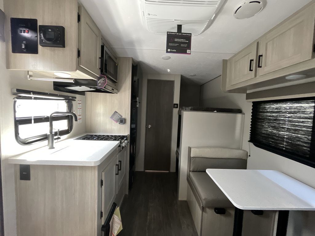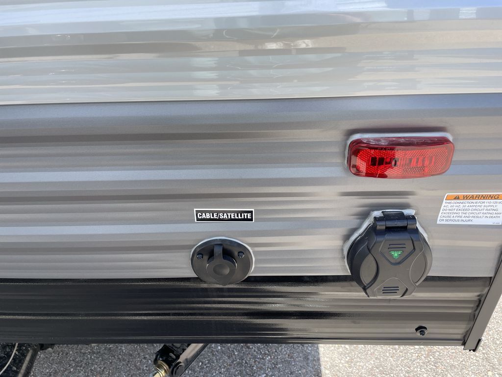 This cozy travel trailer can sleep five, so pack up and head out! You will have a queen bed up front to sleep on each night instead of an air mattress, and the little ones can take the 28" x 70" bunk beds! There is also a booth dinette here that can sleep an additional guest and is perfect for sharing meals during the day. The two burner cooktop and microwave oven means you won't have to cook over a campfire, and the private toilet and shower lets you clean up after a day outdoors. This model includes plenty of storage space, including bedroom storage, an exterior pass-through, plus additional outside storage beneath the bunks for hiking gear!