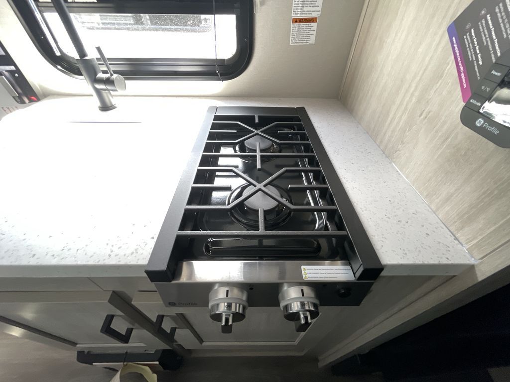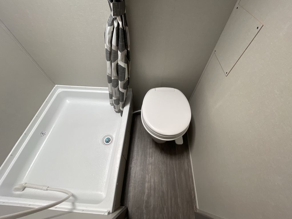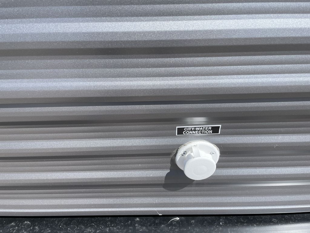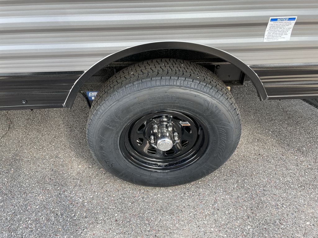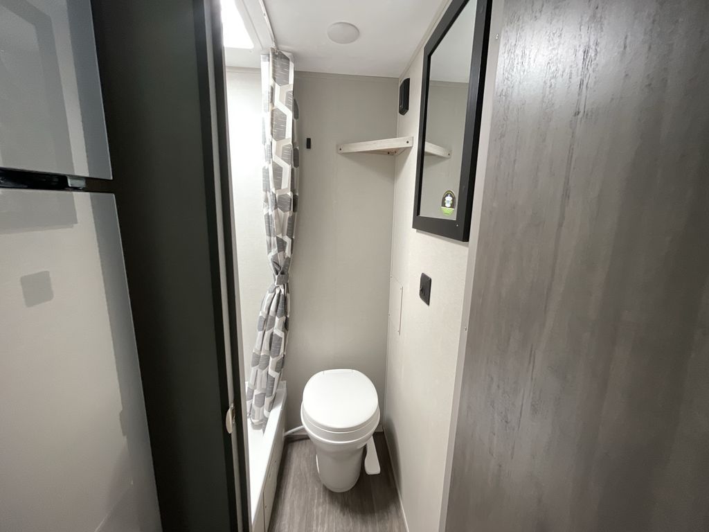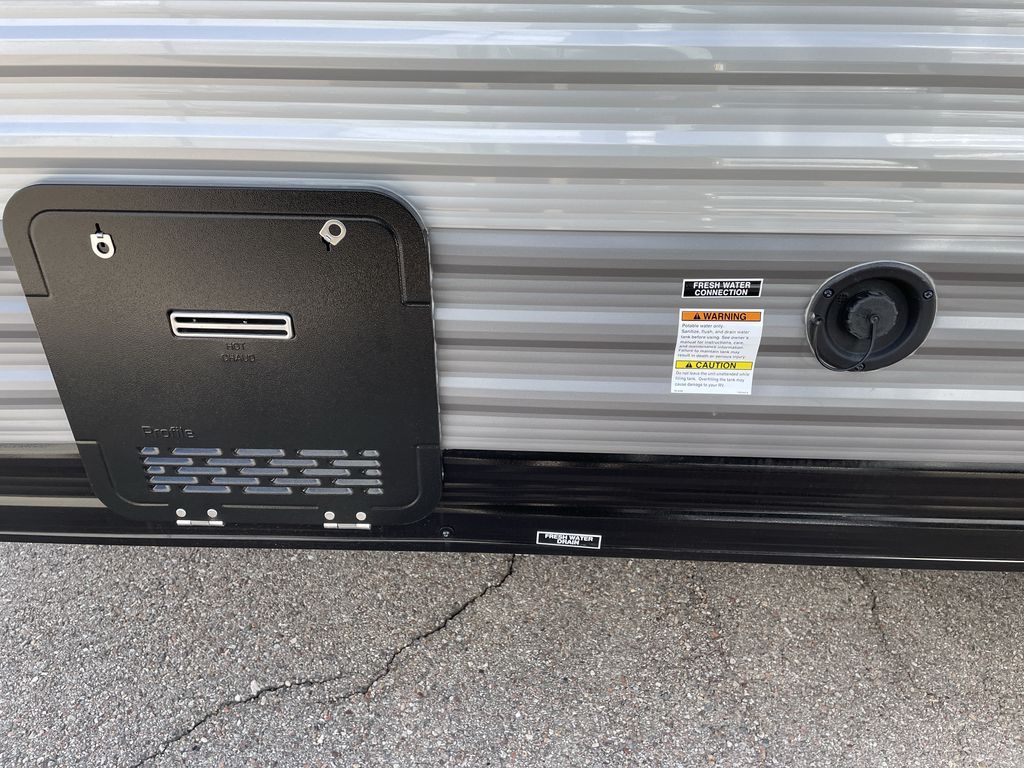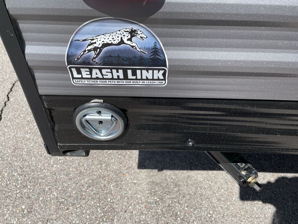 This cozy travel trailer can sleep five, so pack up and head out! You will have a queen bed up front to sleep on each night instead of an air mattress, and the little ones can take the 28" x 70" bunk beds! There is also a booth dinette here that can sleep an additional guest and is perfect for sharing meals during the day. The two burner cooktop and microwave oven means you won't have to cook over a campfire, and the private toilet and shower lets you clean up after a day outdoors. This model includes plenty of storage space, including bedroom storage, an exterior pass-through, plus additional outside storage beneath the bunks for hiking gear!