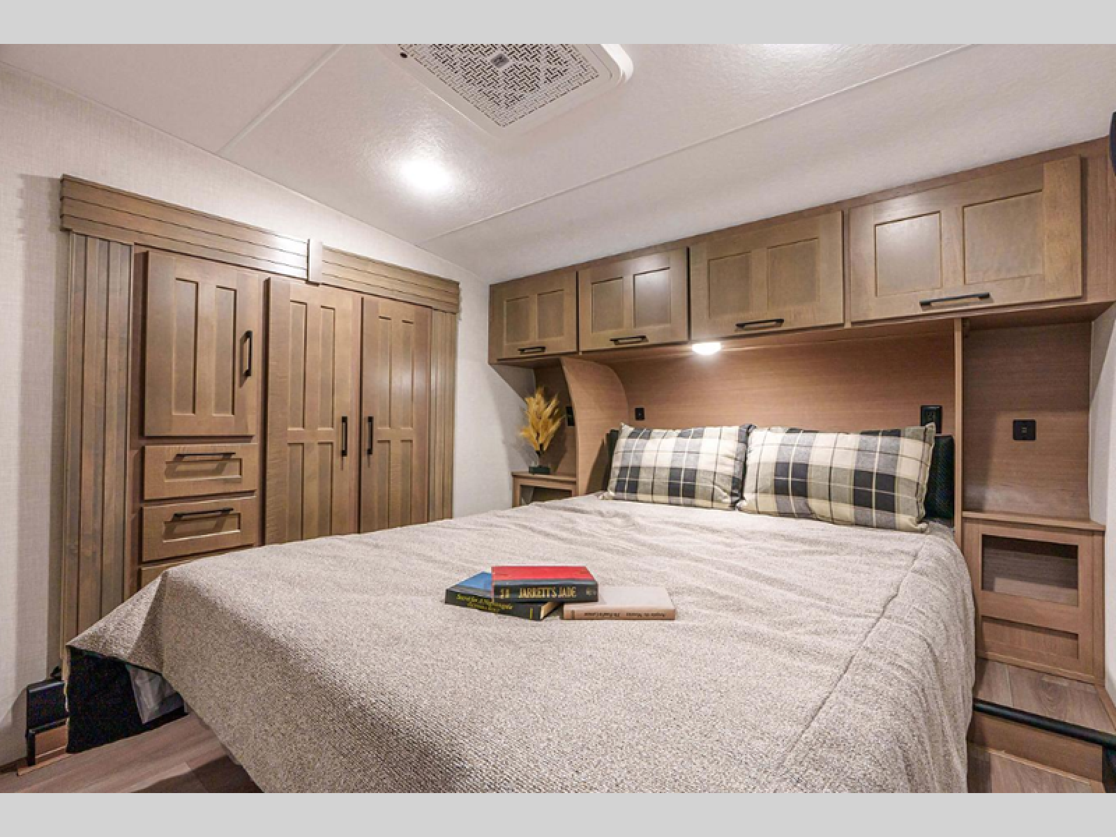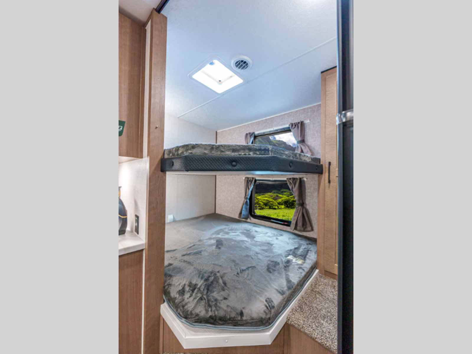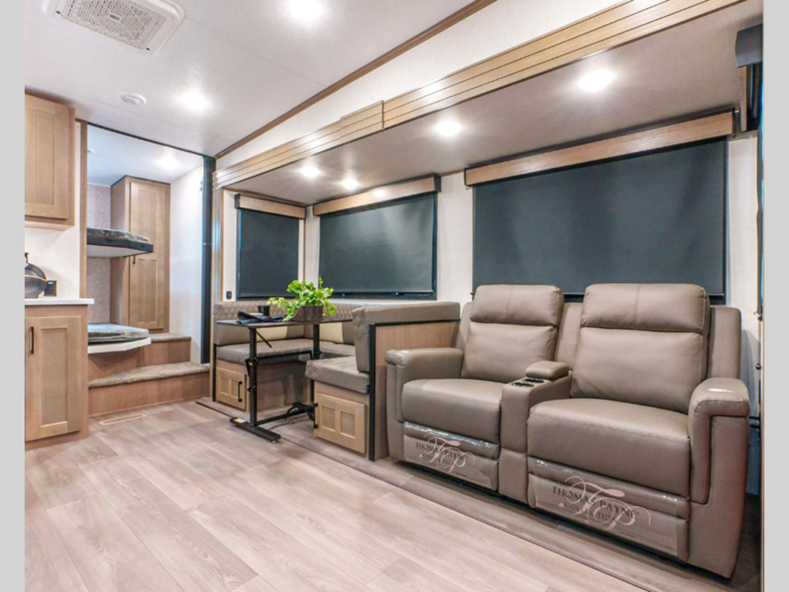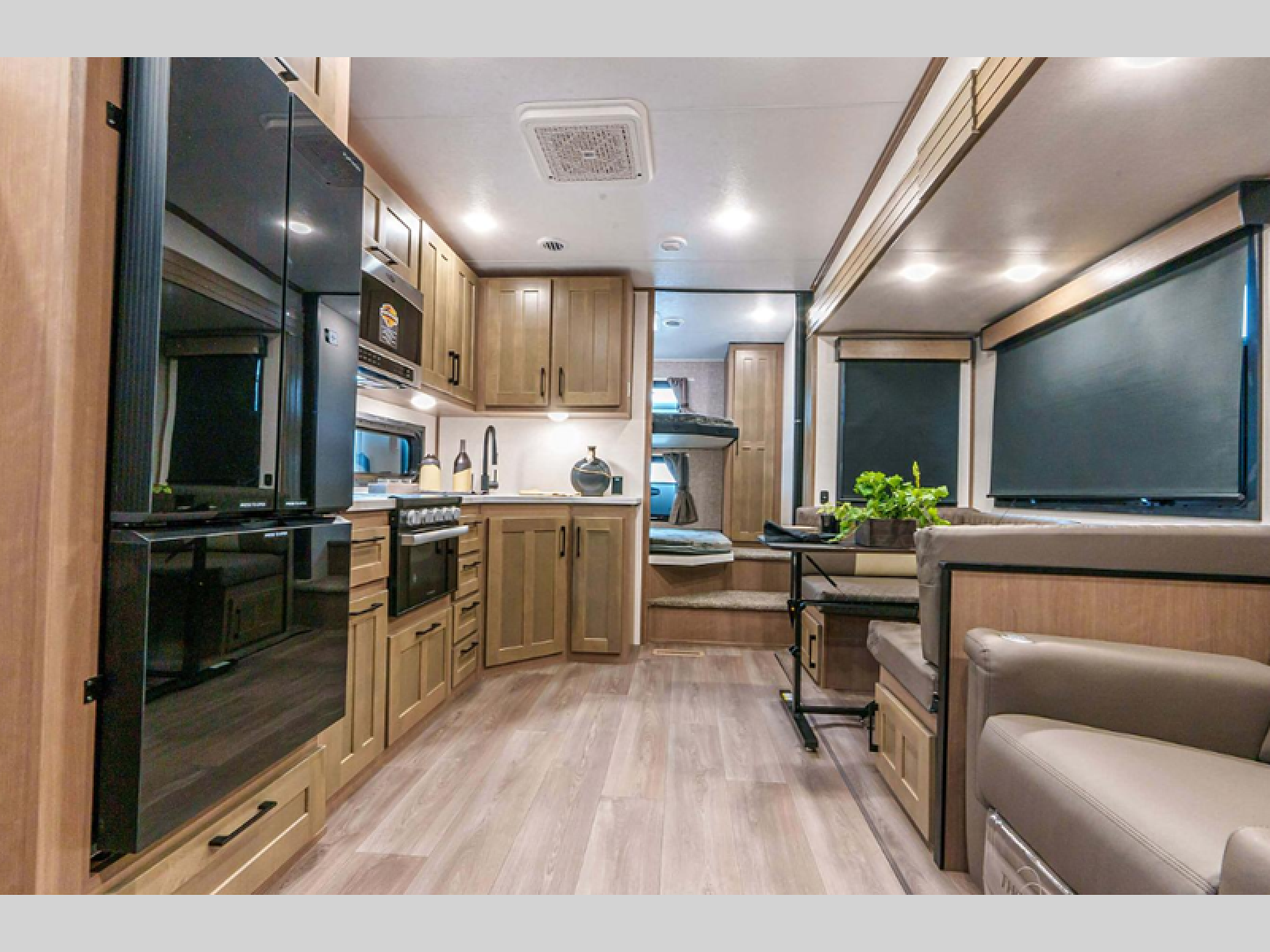 This fifth wheel is perfect for camping with a large group or family since it can sleep ten people each night! There are queen-size bunks, a U-shaped dinette, a hide-a-bed sofa, plus a queen bed in the front private bedroom. And if you'd rather have theater seating in place of the sofa, you can choose that option! The chef will have their choice to cook indoors on the three burner drop-in cooktop or outdoors on the outside griddle, plus there are two power awnings here for maximum shade. Don't let this fifth wheel slip away!