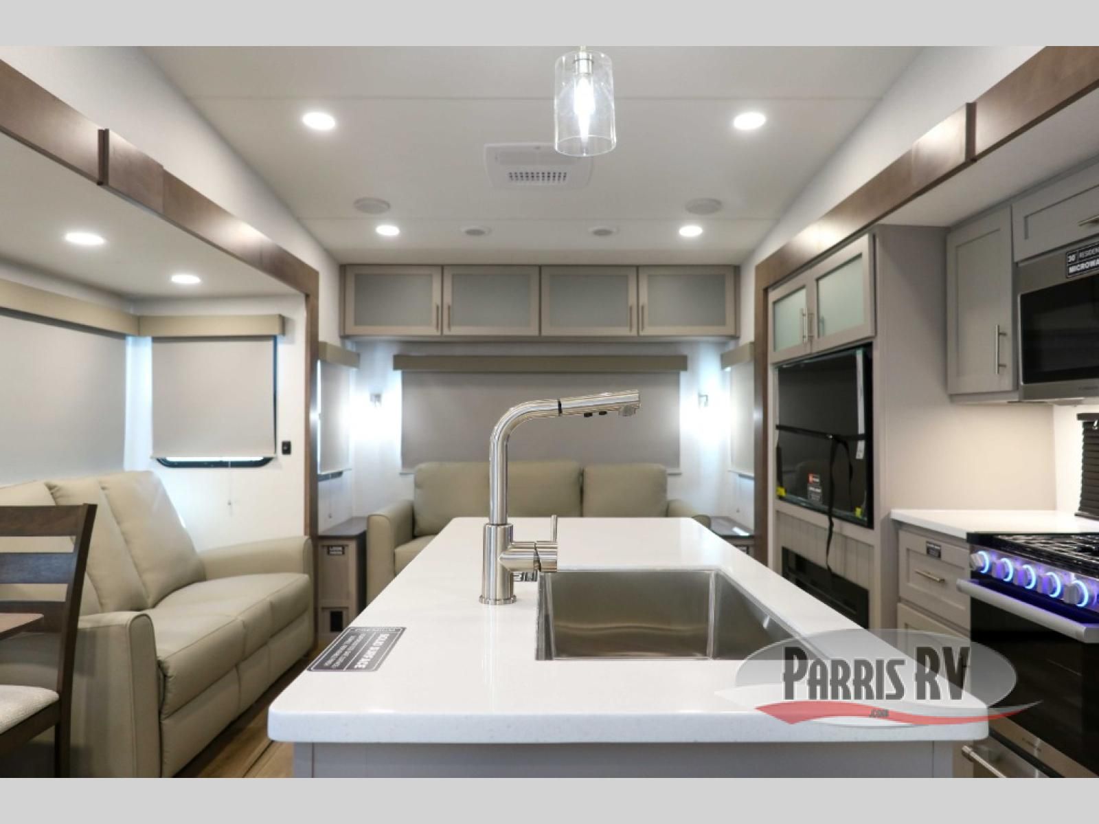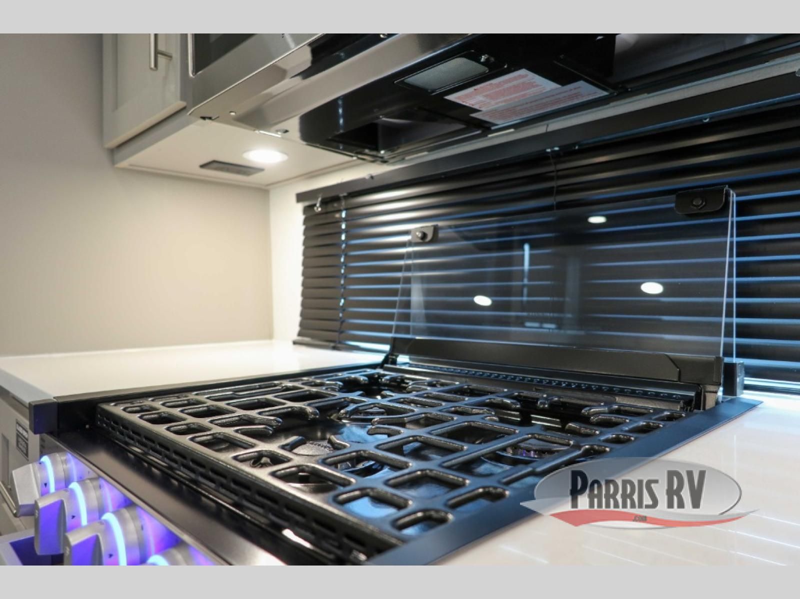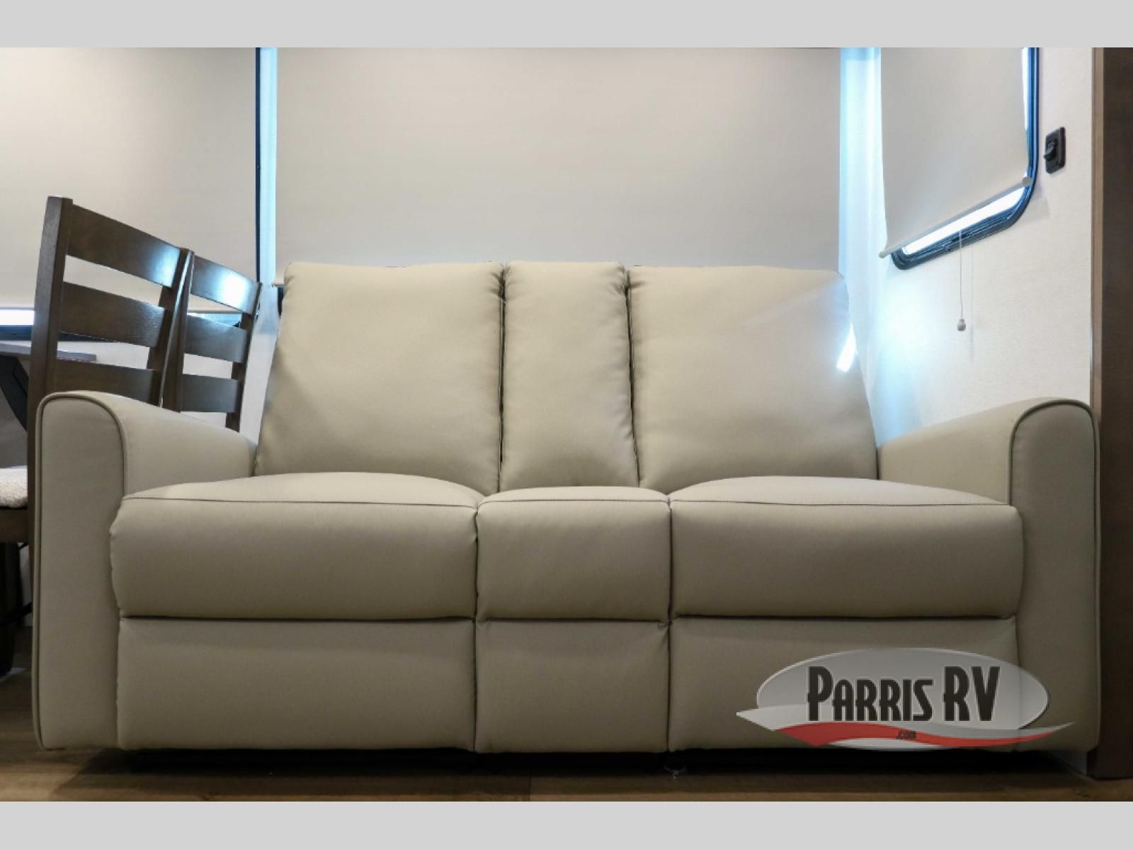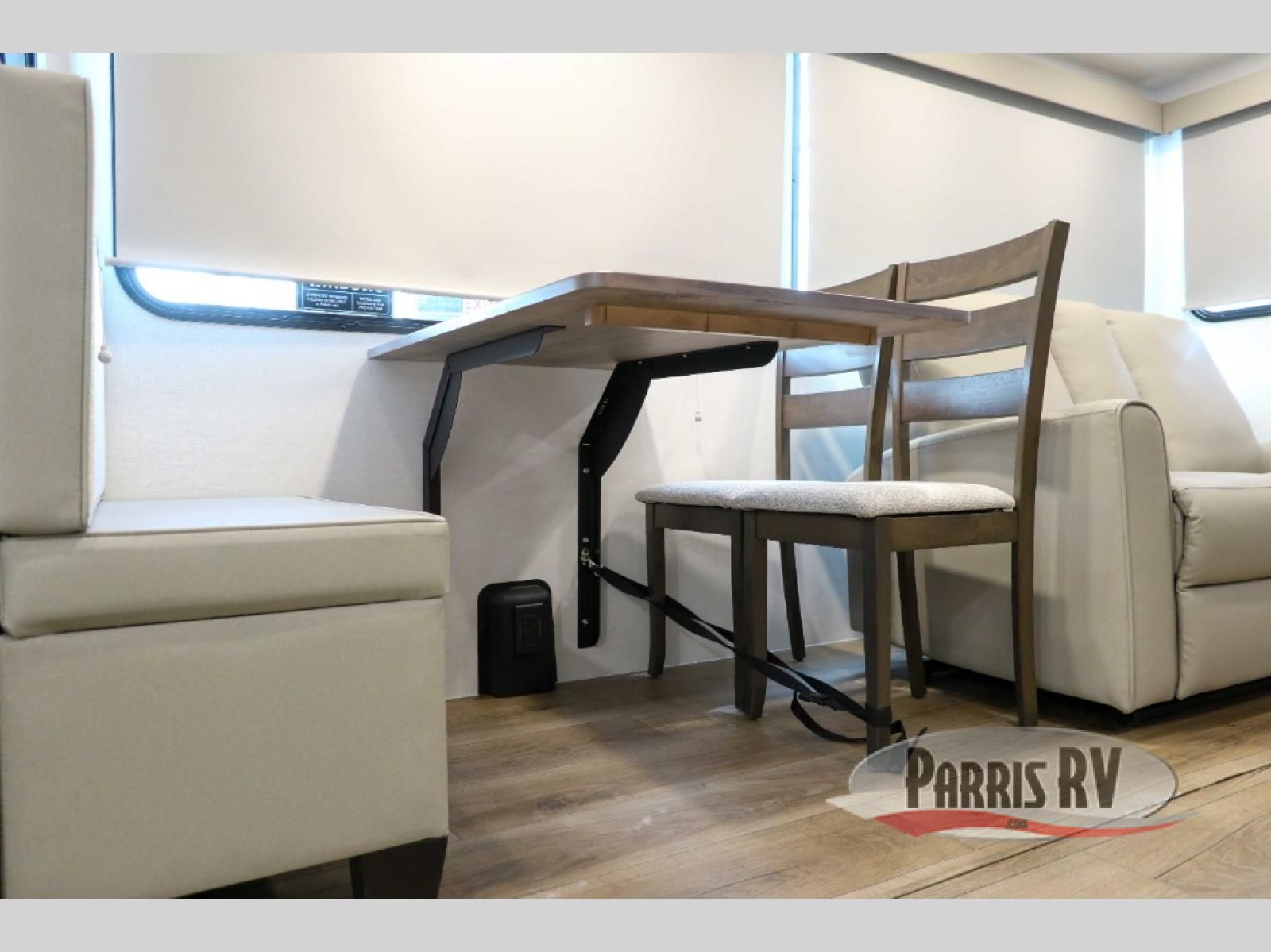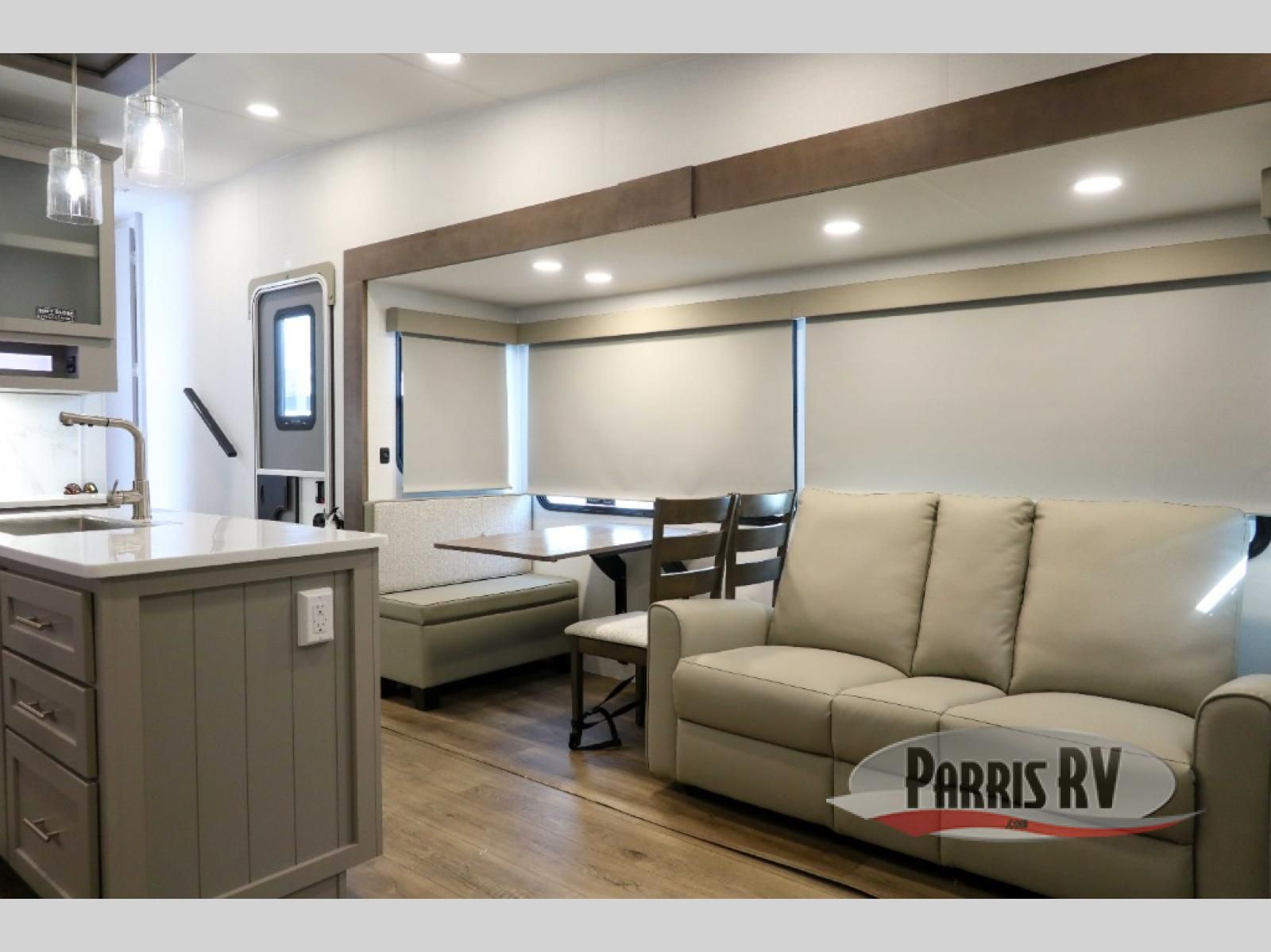 For the couple that enjoys adventures, this rear living coach has everything you need to travel comfortably and take along a couple of friends! The front private bedroom has a queen bed with nightstands on either side for your personal belongings, and a wardrobe to keep your clothes looking nice. Freshen up each morning in the full bathroom with a 30" x 36" shower, and grab a towel stored close by in the linen closet. Now that you're ready for the day, you can head to the kitchen and create a hearty breakfast with the full kitchen amenities. You will appreciate having a 10 cu. ft. 12V refrigerator and three burner cooktop, plus there is a center island with plenty of counter space and a sink to make food prep even easier. Spend your evenings in true relaxation in the dual recliner theater seats across from the swing mount 50" HDTV with hidden storage behind. You will also love the pantry and hutch in the kitchen area for storing all of your dishes and non-perishables. Dine at the floating table with two chairs along with a moveable ottoman featuring storage.