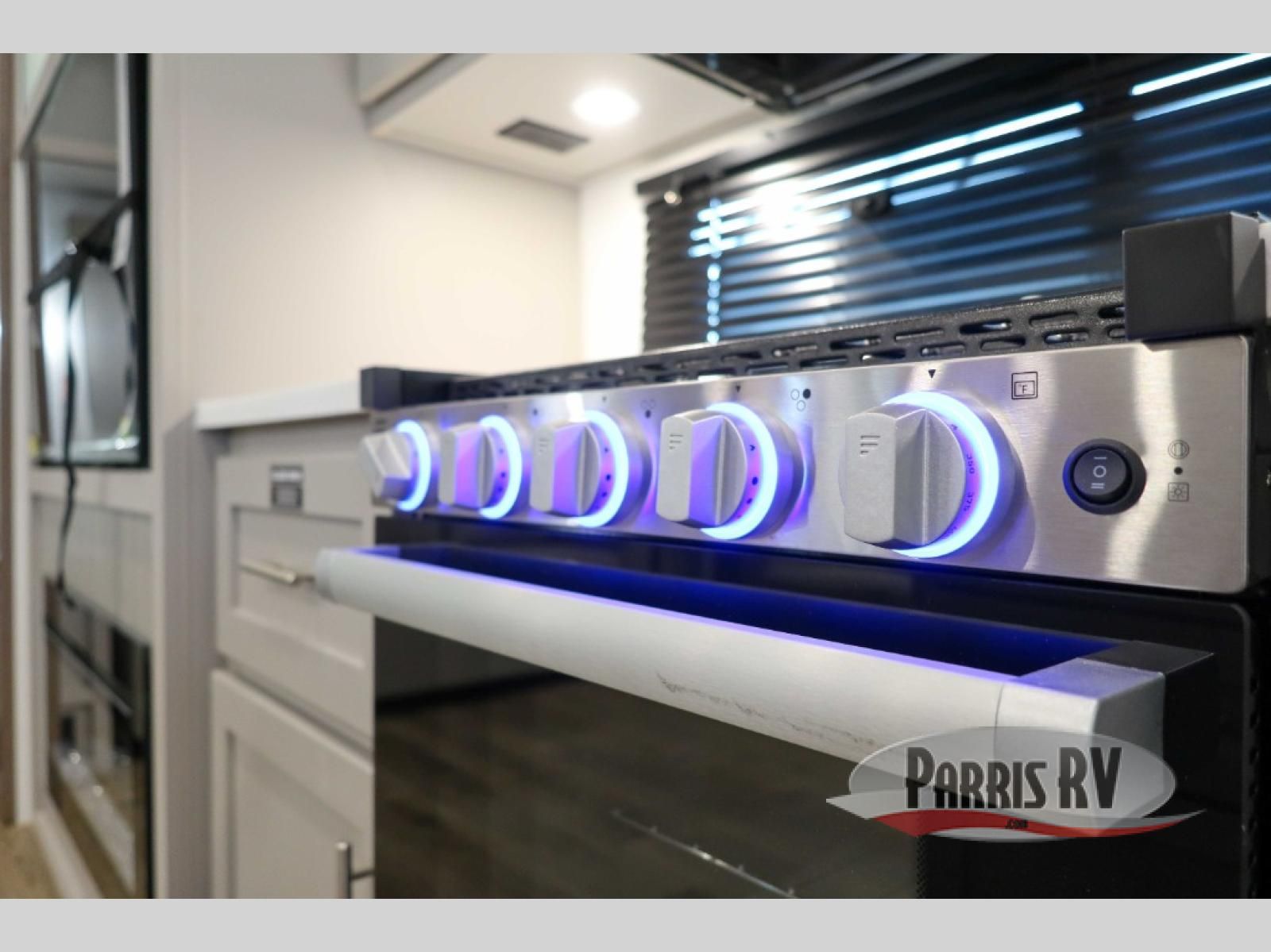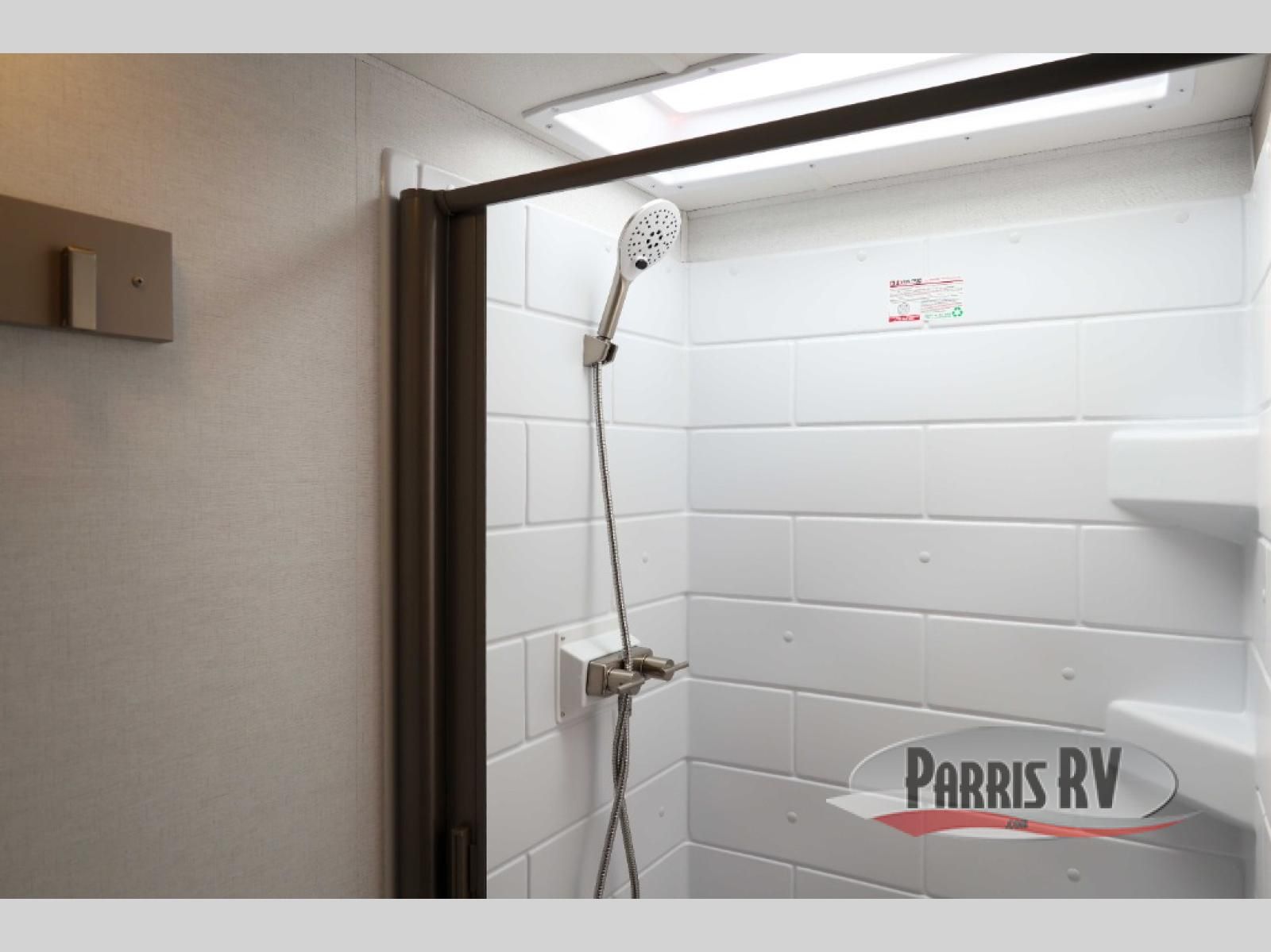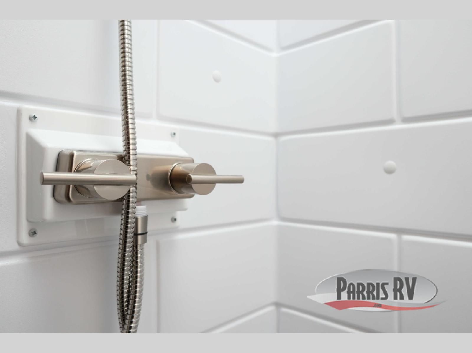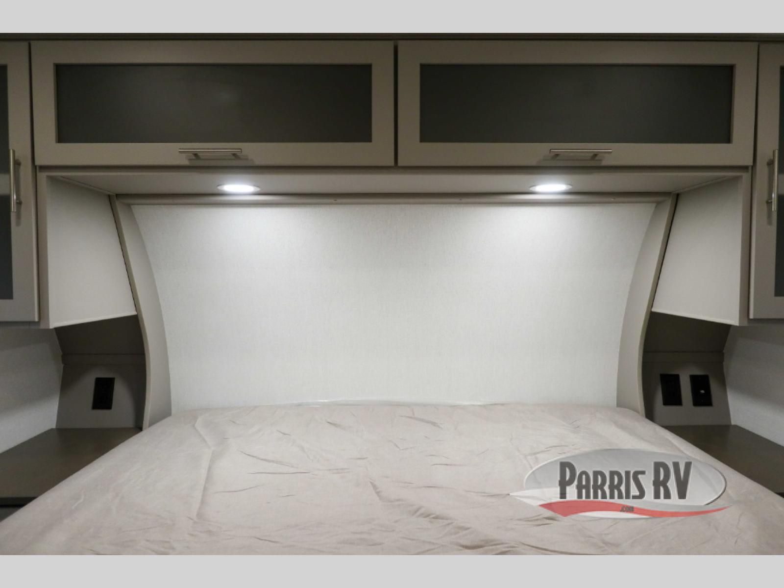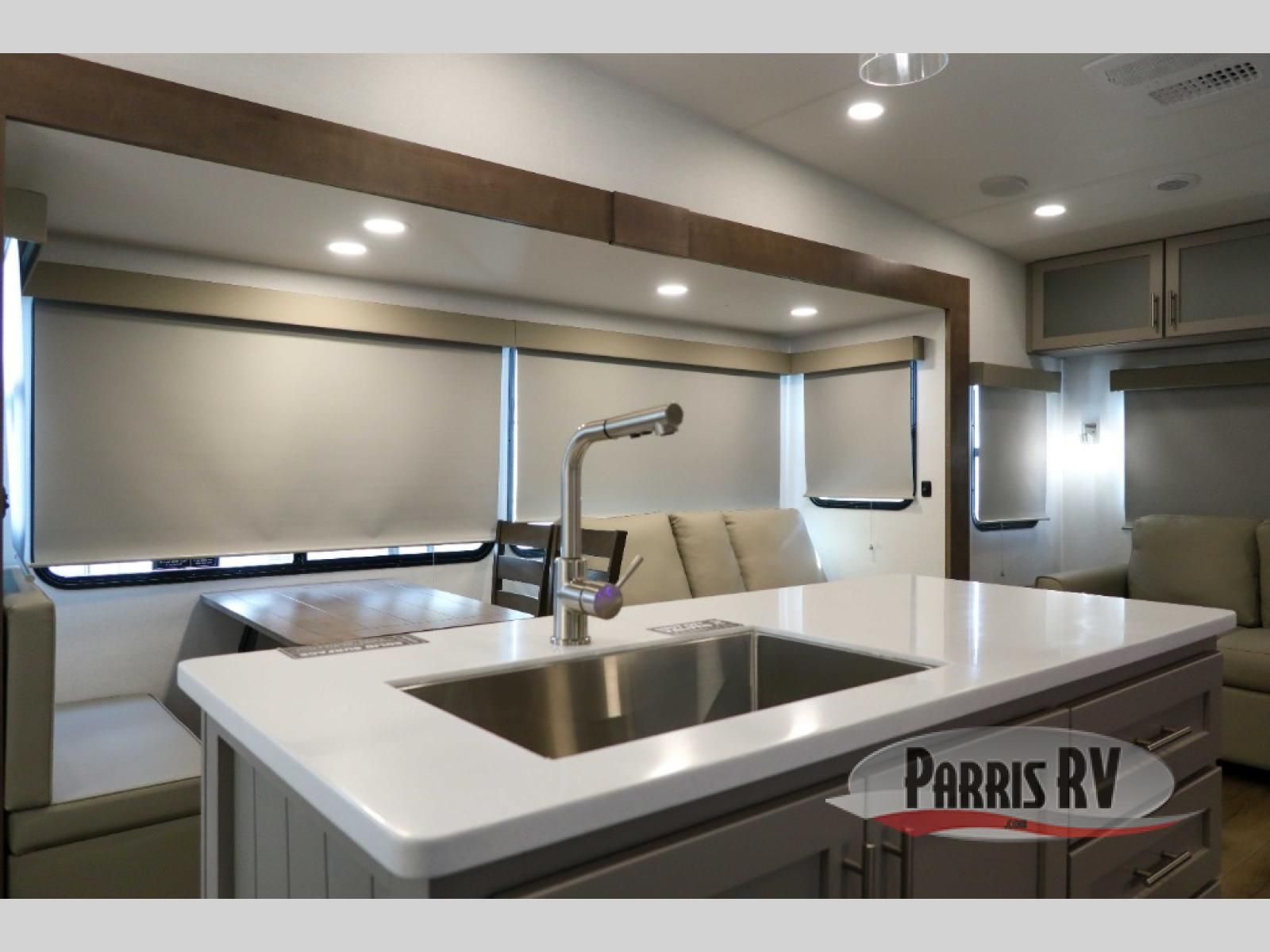 For the couple that enjoys adventures, this rear living coach has everything you need to travel comfortably and take along a couple of friends! The front private bedroom has a queen bed with nightstands on either side for your personal belongings, and a wardrobe to keep your clothes looking nice. Freshen up each morning in the full bathroom with a 30" x 36" shower, and grab a towel stored close by in the linen closet. Now that you're ready for the day, you can head to the kitchen and create a hearty breakfast with the full kitchen amenities. You will appreciate having a 10 cu. ft. 12V refrigerator and three burner cooktop, plus there is a center island with plenty of counter space and a sink to make food prep even easier. Spend your evenings in true relaxation in the dual recliner theater seats across from the swing mount 50" HDTV with hidden storage behind. You will also love the pantry and hutch in the kitchen area for storing all of your dishes and non-perishables. Dine at the floating table with two chairs along with a moveable ottoman featuring storage.