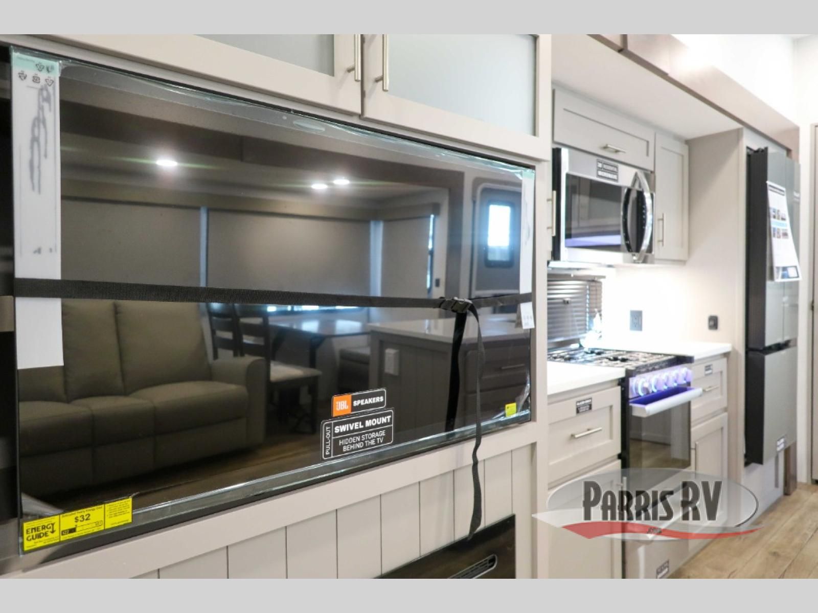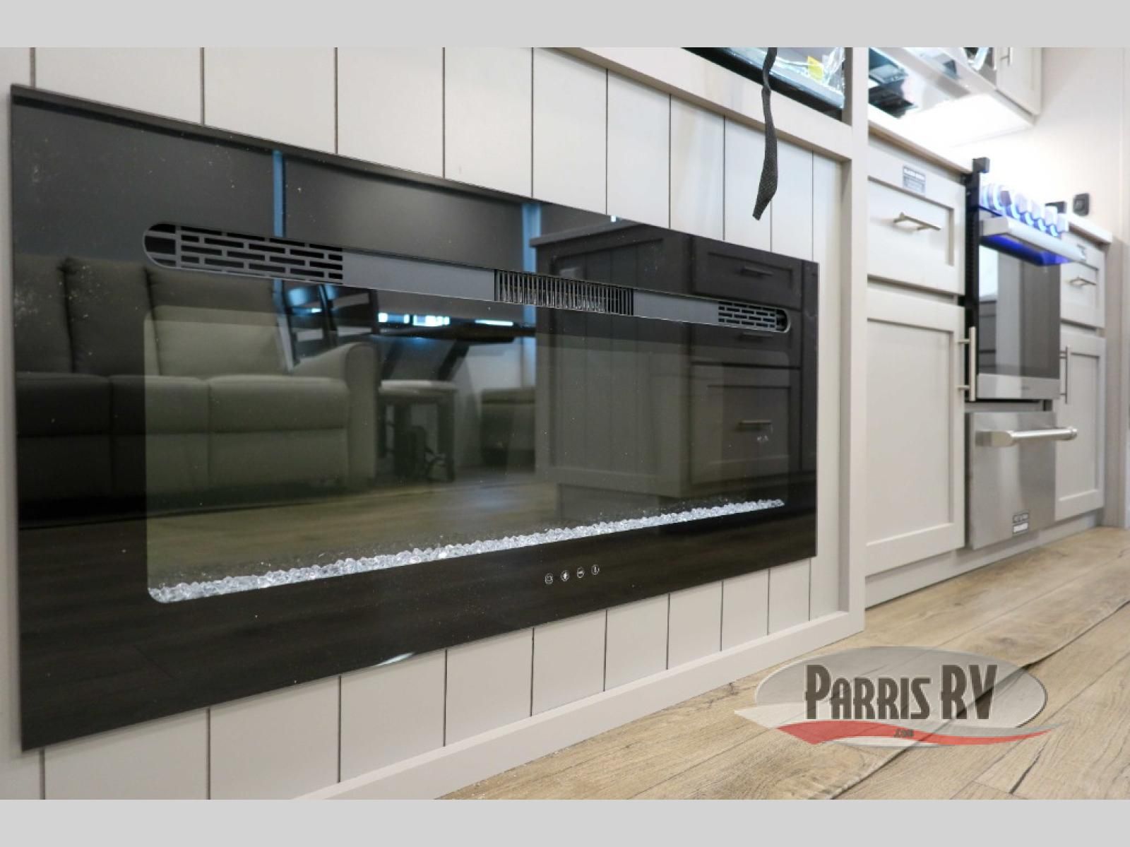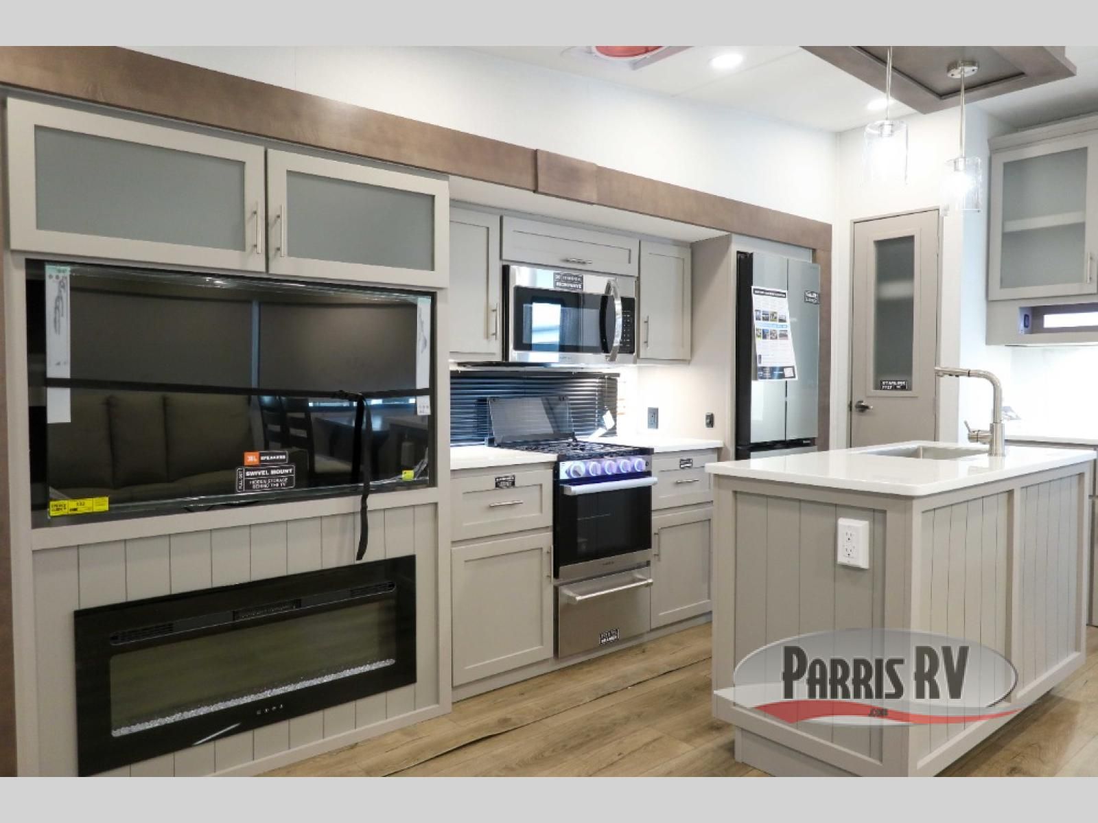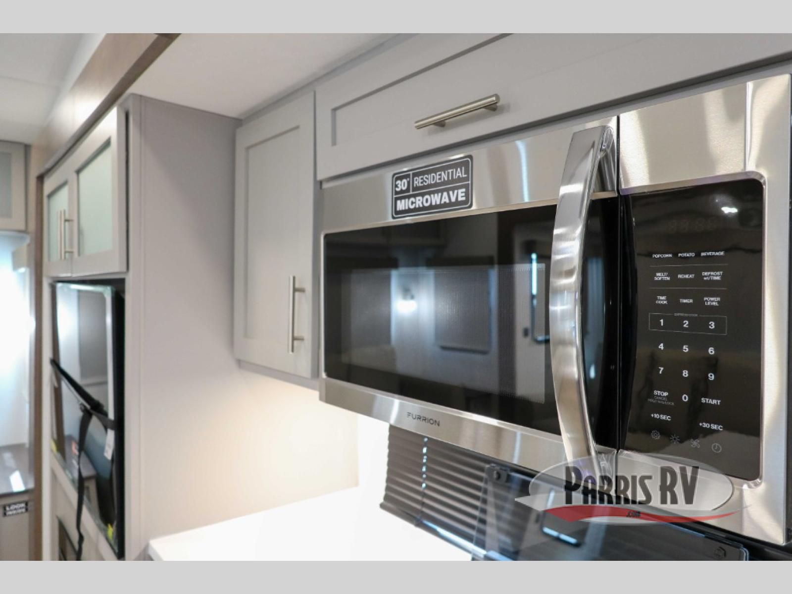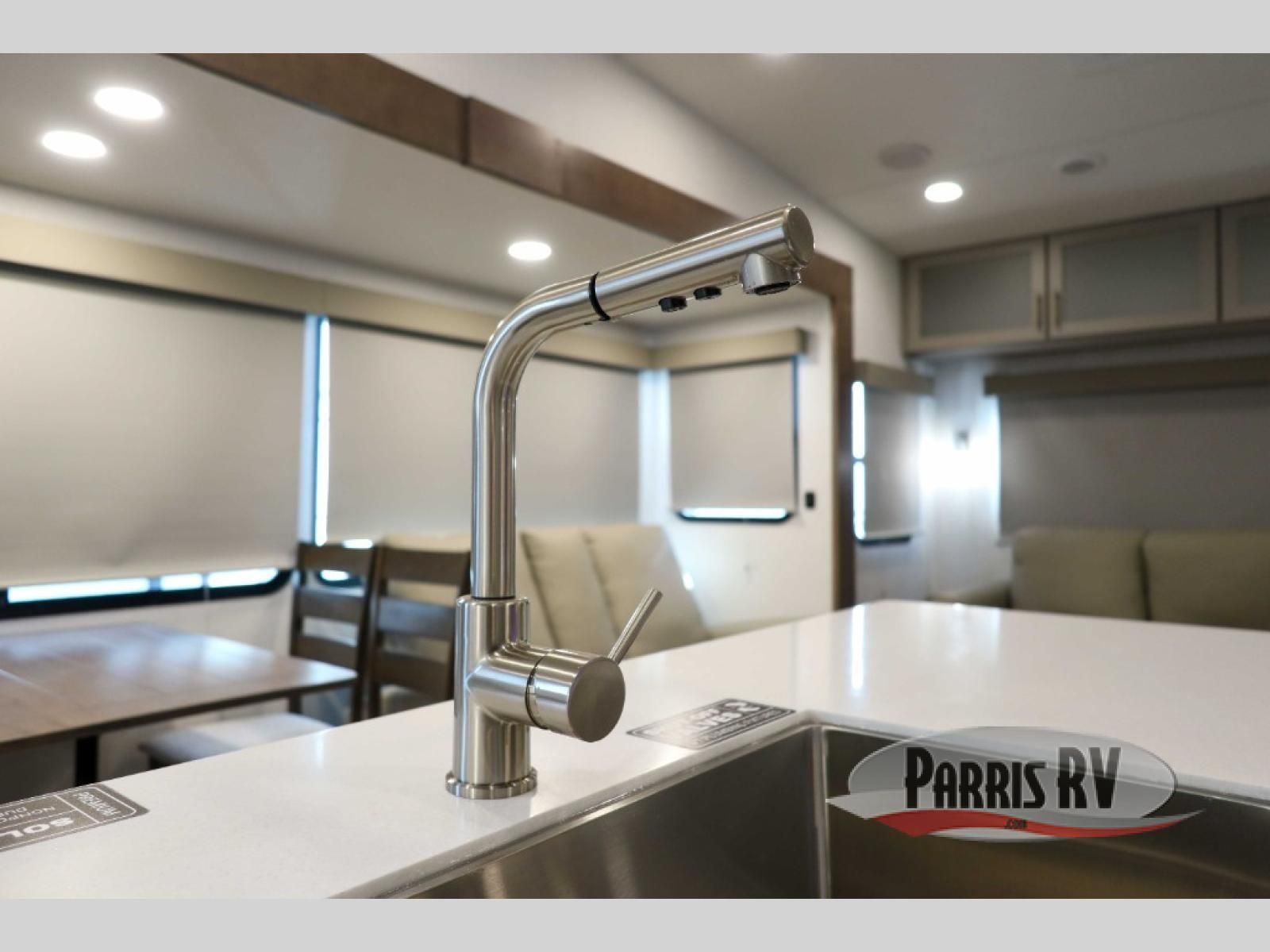 For the couple that enjoys adventures, this rear living coach has everything you need to travel comfortably and take along a couple of friends! The front private bedroom has a queen bed with nightstands on either side for your personal belongings, and a wardrobe to keep your clothes looking nice. Freshen up each morning in the full bathroom with a 30" x 36" shower, and grab a towel stored close by in the linen closet. Now that you're ready for the day, you can head to the kitchen and create a hearty breakfast with the full kitchen amenities. You will appreciate having a 10 cu. ft. 12V refrigerator and three burner cooktop, plus there is a center island with plenty of counter space and a sink to make food prep even easier. Spend your evenings in true relaxation in the dual recliner theater seats across from the swing mount 50" HDTV with hidden storage behind. You will also love the pantry and hutch in the kitchen area for storing all of your dishes and non-perishables. Dine at the floating table with two chairs along with a moveable ottoman featuring storage.