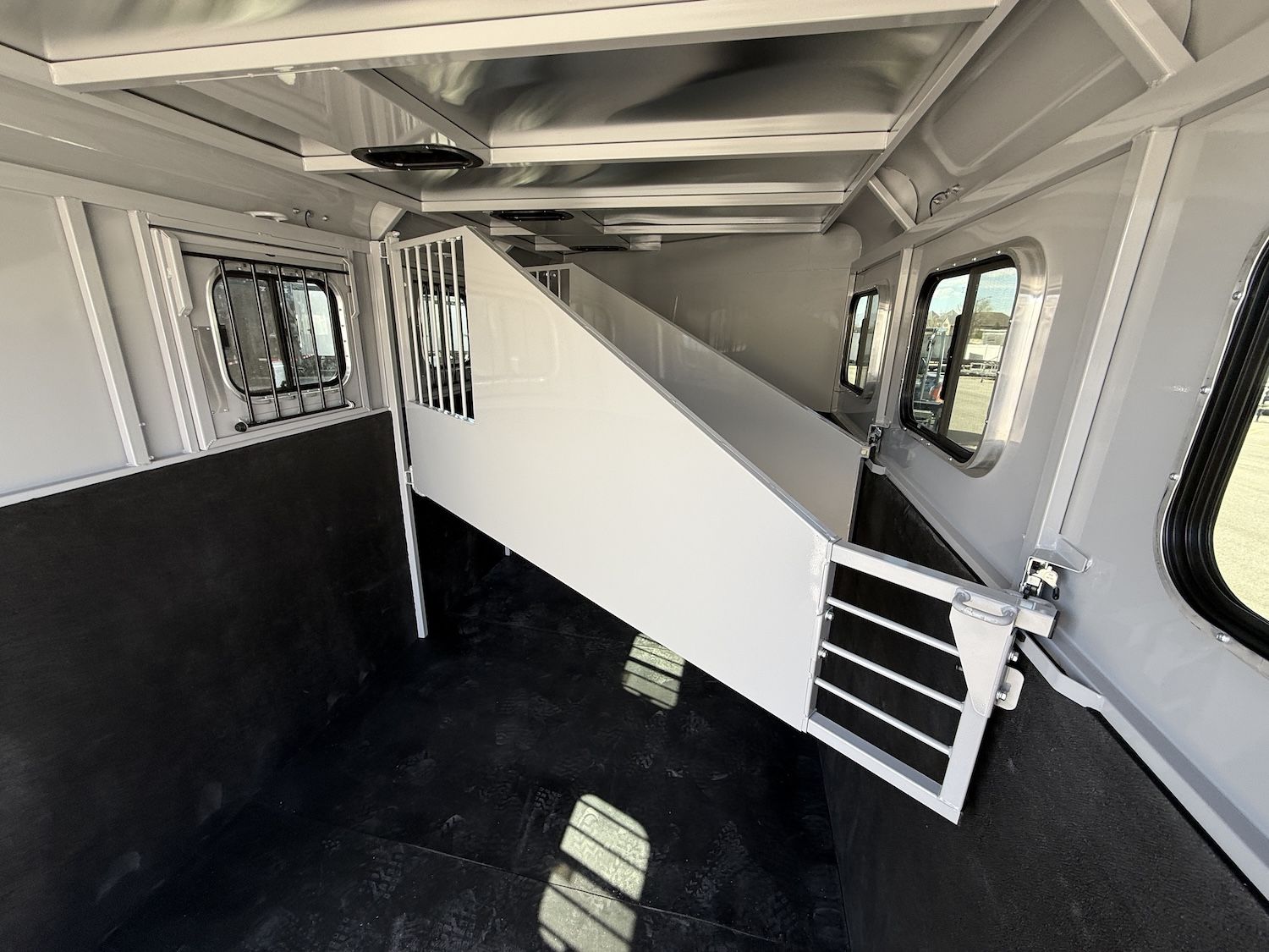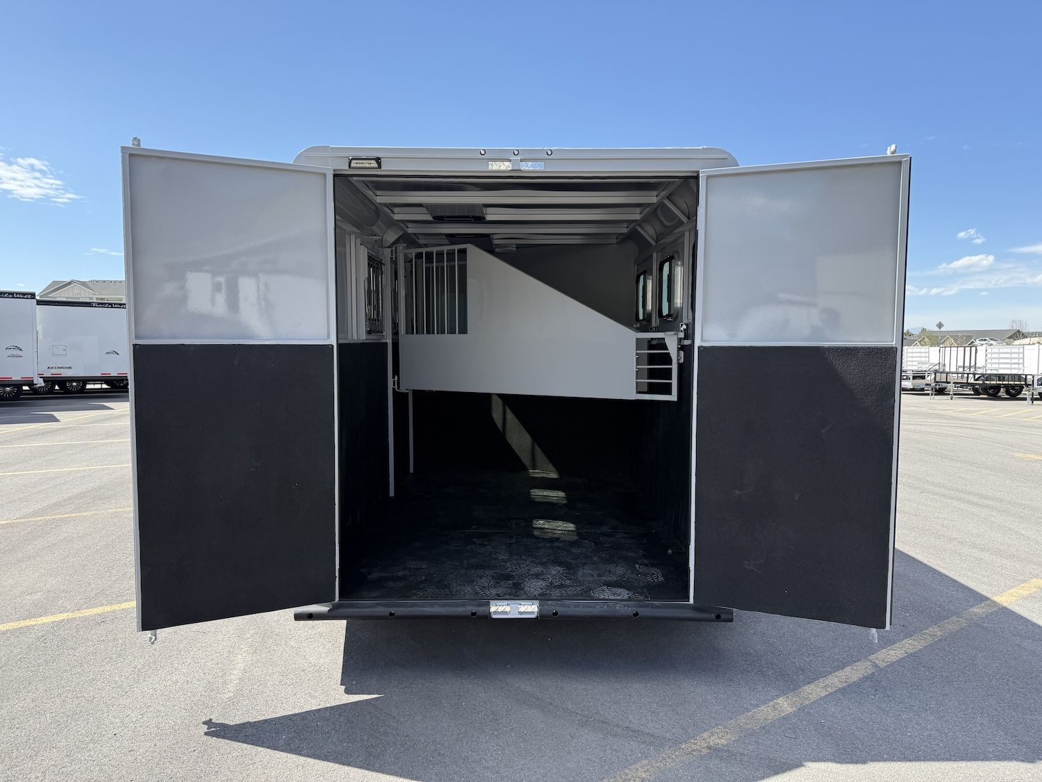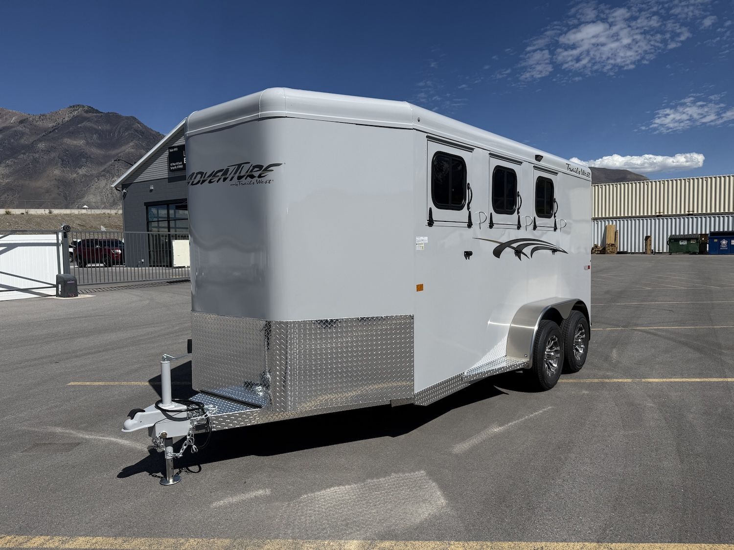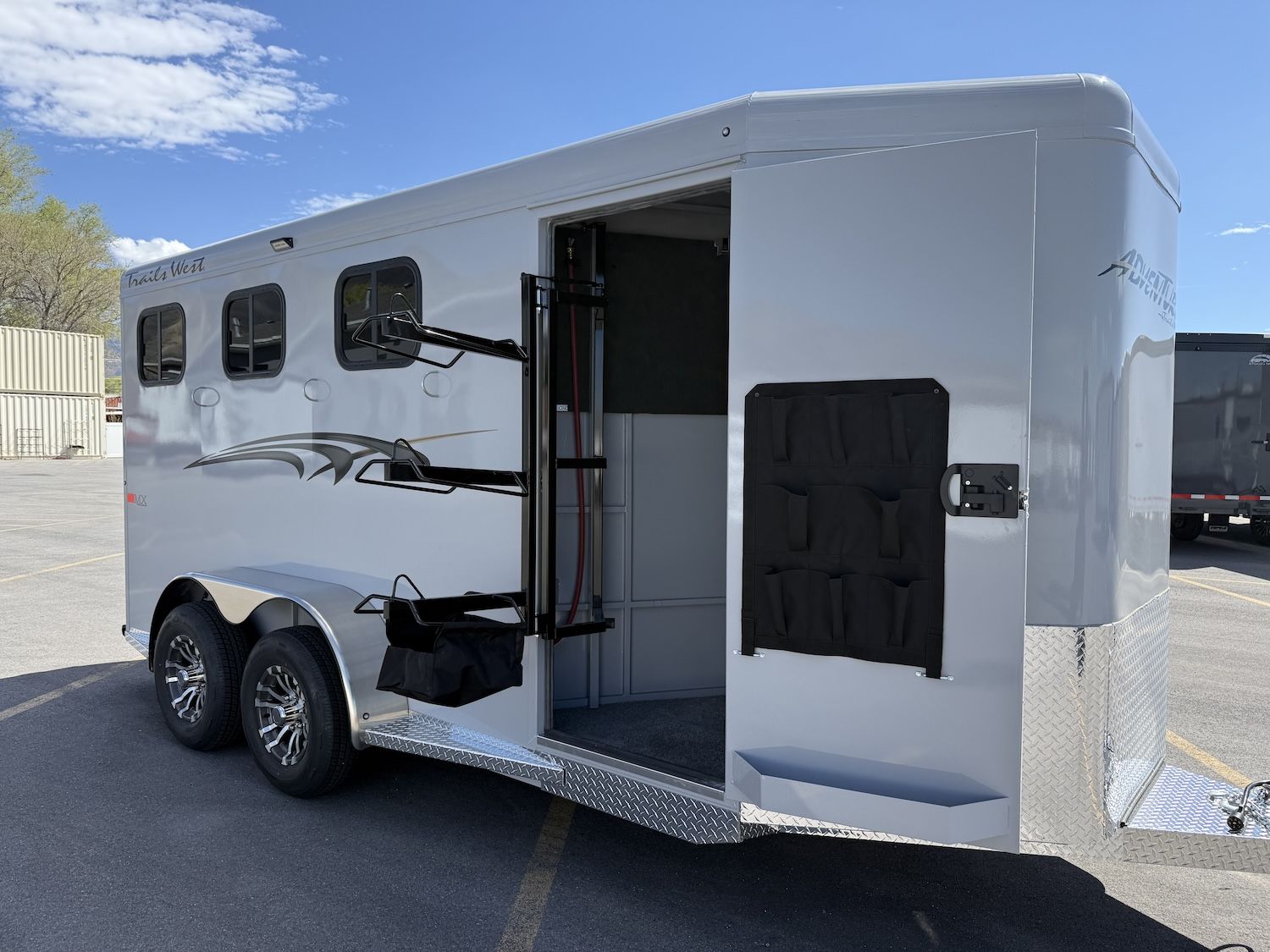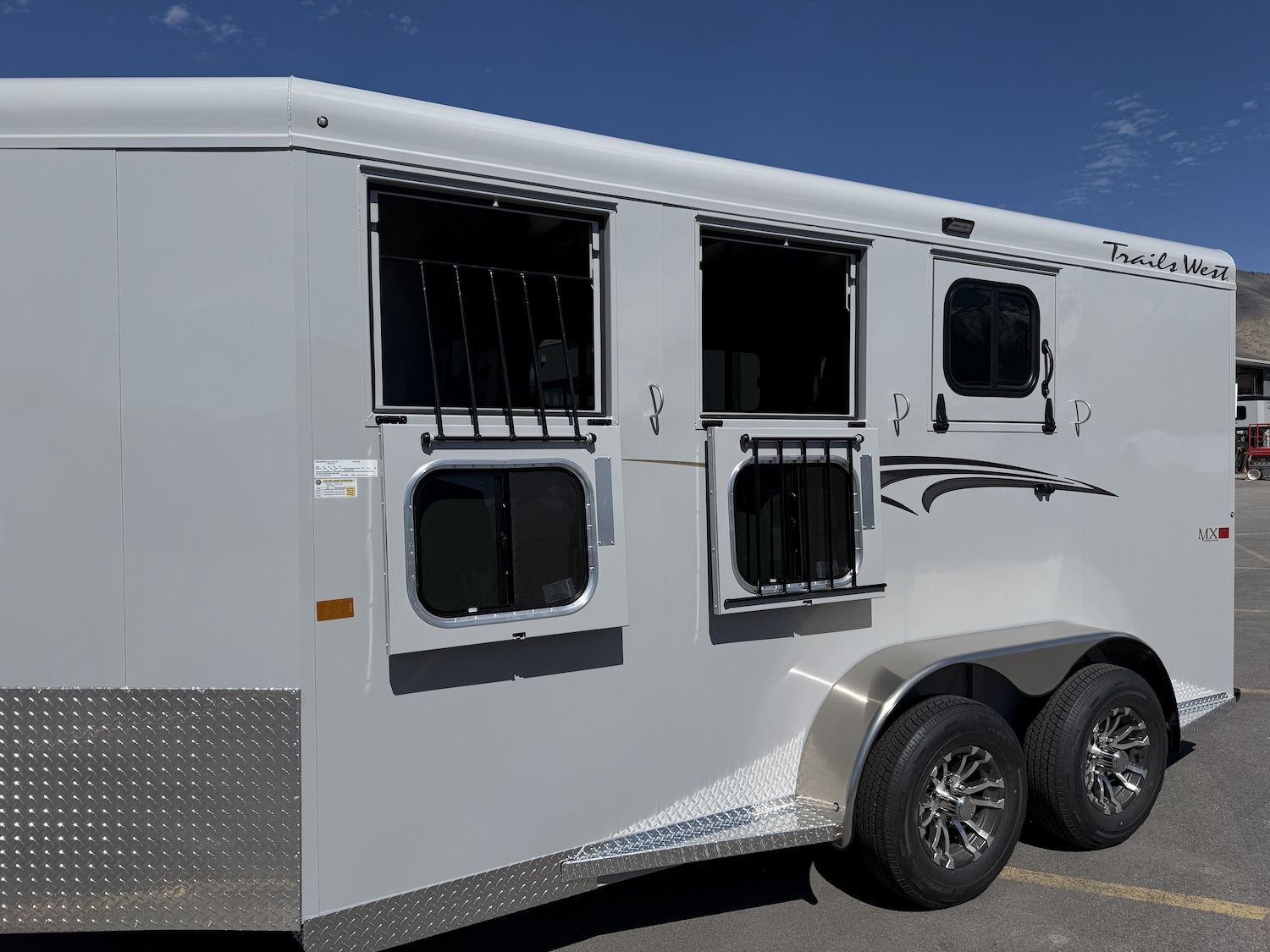 The newly redesigned Adventure MX is here! The Adventure MX trailer from Trails West is the best priced steel framed aluminum skinned trailer in the industry. It has the perfect combination of style, user friendly features, and value. This trailer has newly designed aerodynamic front, head side drop down feed windows, tail side sliding windows and rubber wall mats all the way around the horse compartment making it the best equipped trailer in its class.