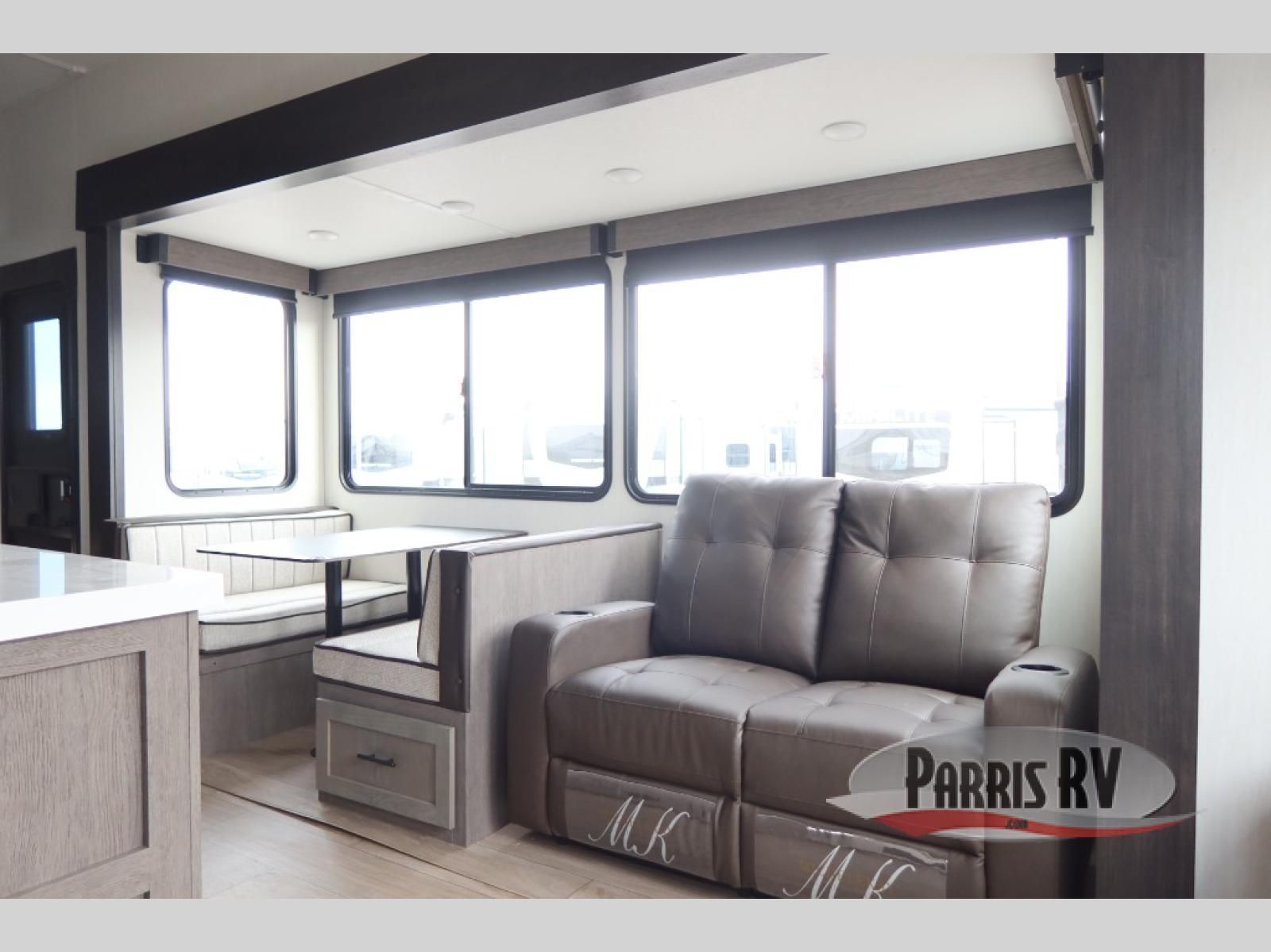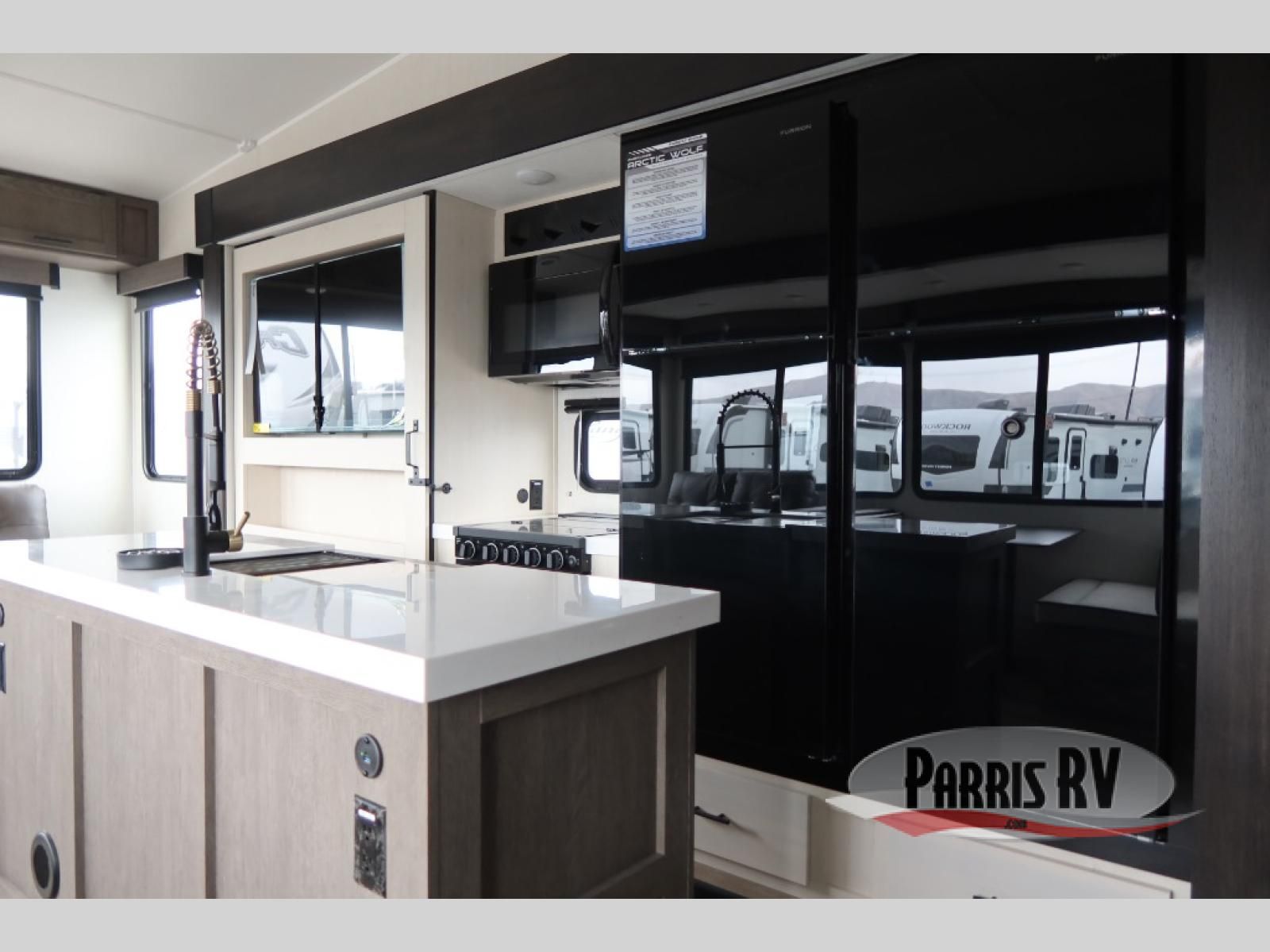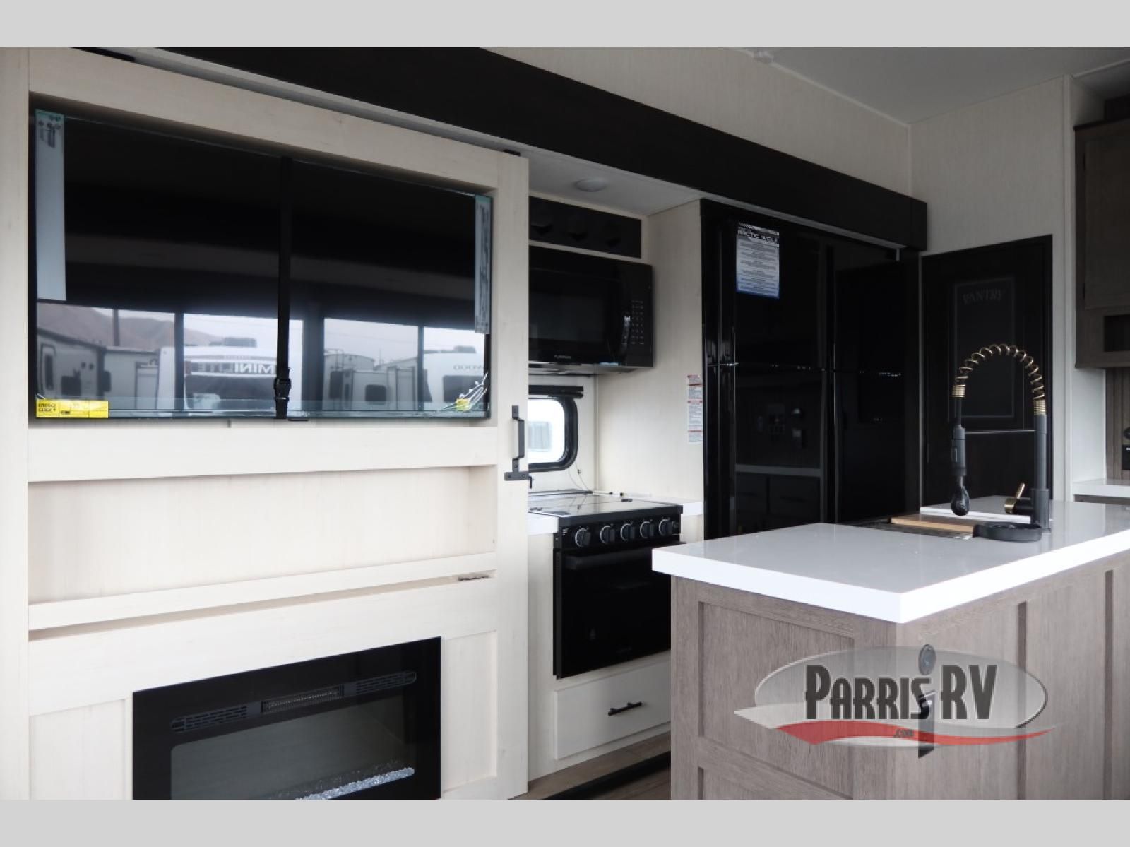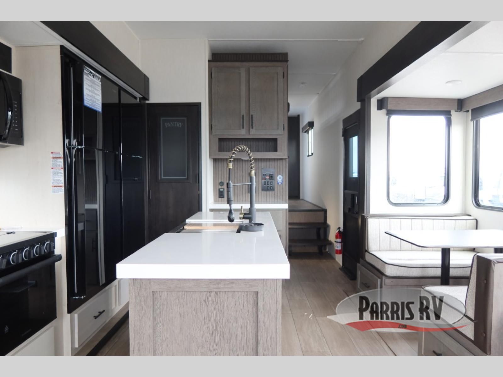 You have excellent sleeping accommodations on this Cherokee Arctic Wolf fifth wheel! There is a private bedroom with a king-size bed at the front for you, and the second bedroom contains two 28" x 72" bunks and a jack knife sofa with trundle for any kids or friends you have traveling with you. A desk provides space to work or study. And it doesn't stop there. There is also a tri-fold sofa in the living area that you can use as a sleeping space. The kitchen is ready for you to make meals on the three-burner range, and you have plenty of work space with a spacious kitchen island. You can enjoy your meals at the dinette, and after dinner relax on the jack knife sofa across from the fireplace.