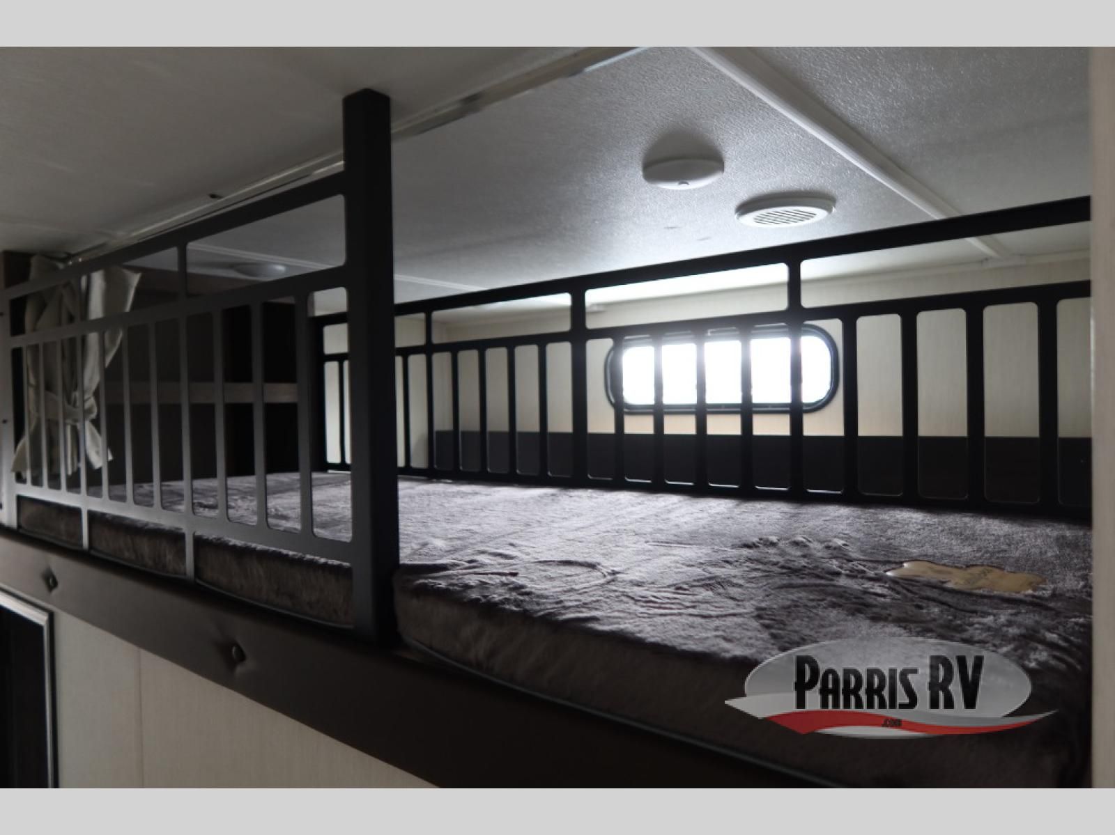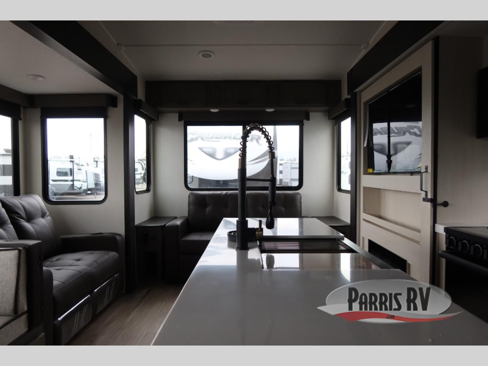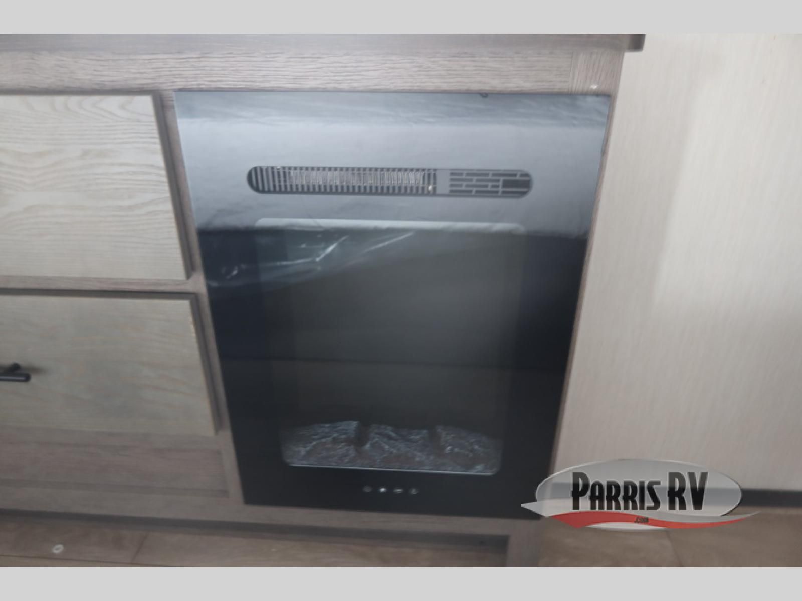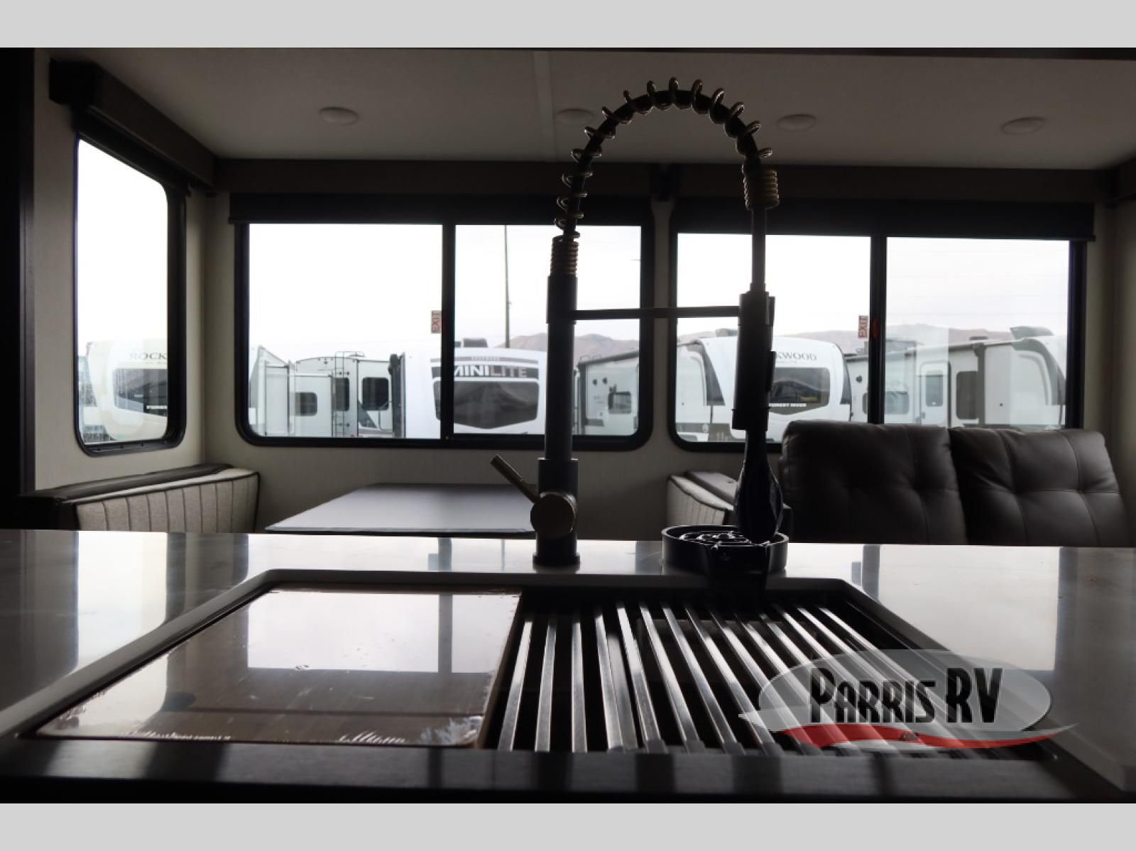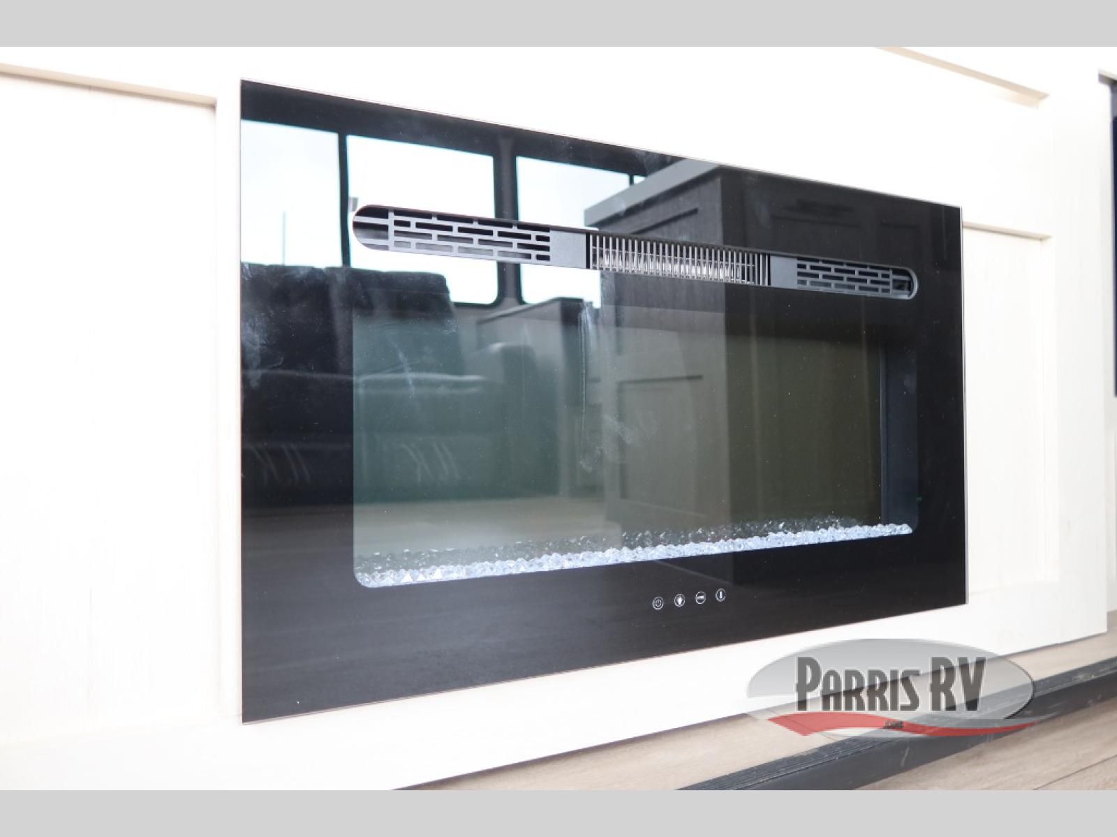 You have excellent sleeping accommodations on this Cherokee Arctic Wolf fifth wheel! There is a private bedroom with a king-size bed at the front for you, and the second bedroom contains two 28" x 72" bunks and a jack knife sofa with trundle for any kids or friends you have traveling with you. A desk provides space to work or study. And it doesn't stop there. There is also a tri-fold sofa in the living area that you can use as a sleeping space. The kitchen is ready for you to make meals on the three-burner range, and you have plenty of work space with a spacious kitchen island. You can enjoy your meals at the dinette, and after dinner relax on the jack knife sofa across from the fireplace.