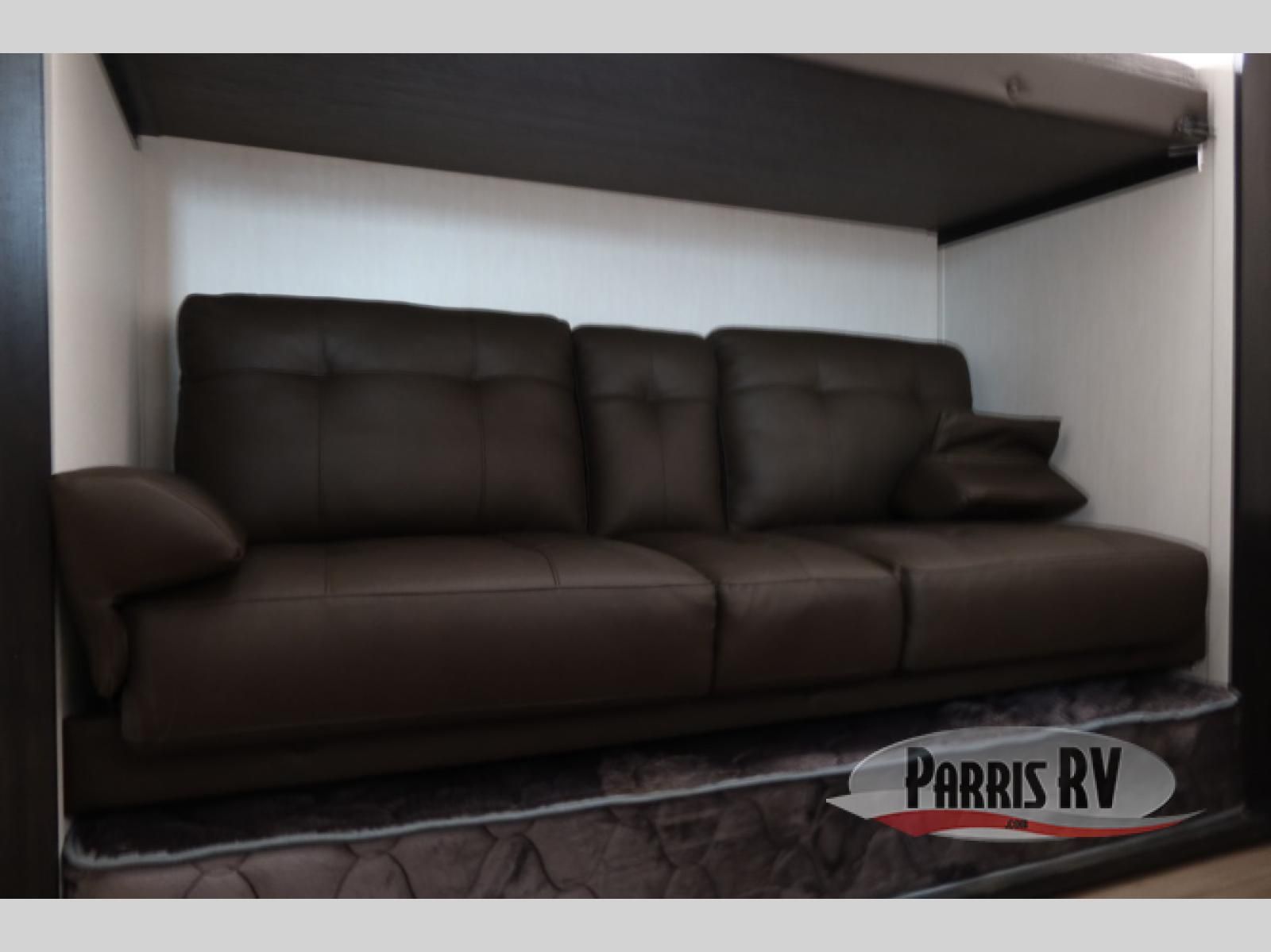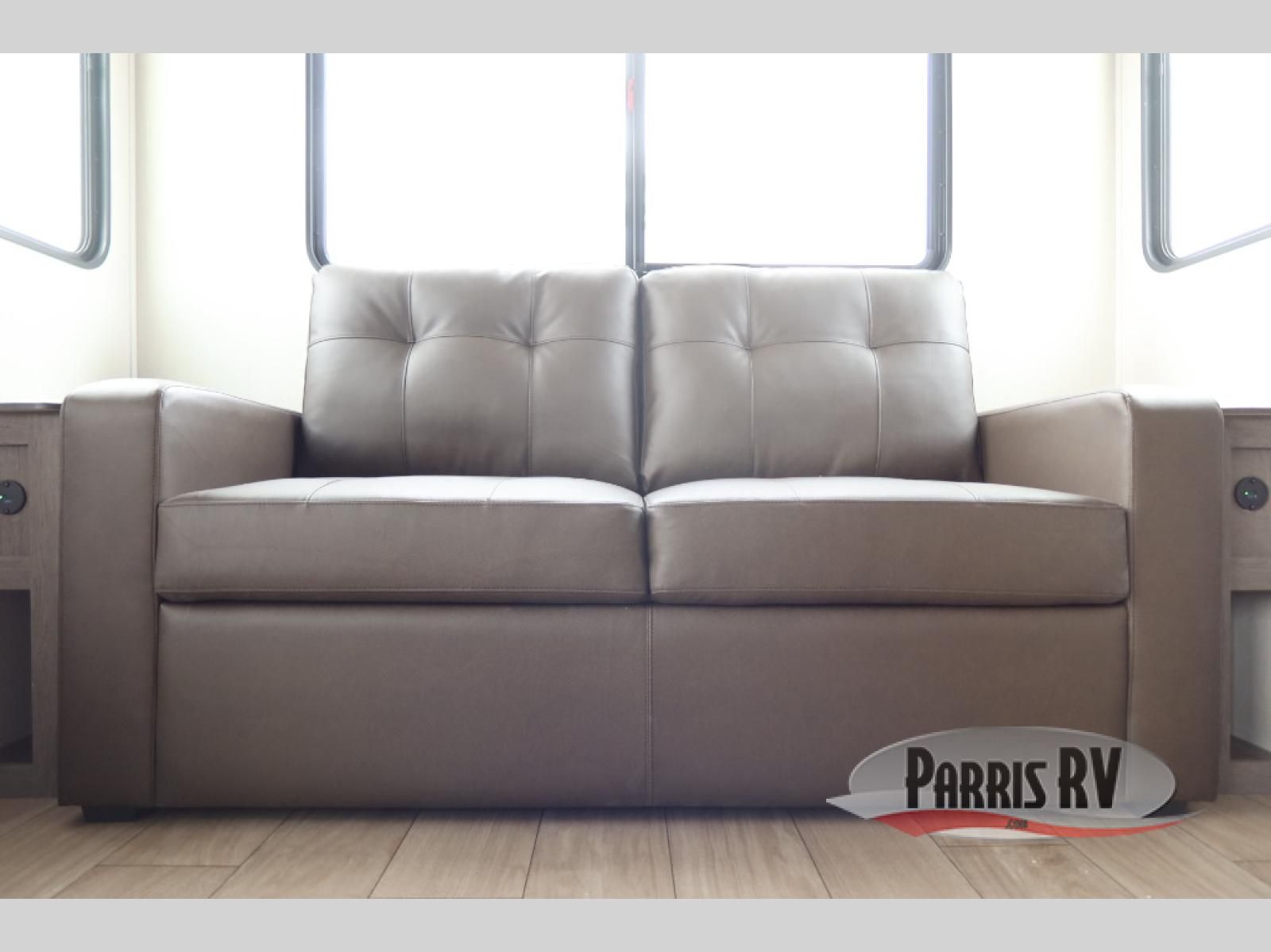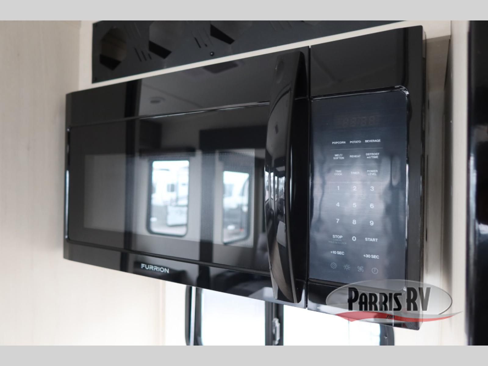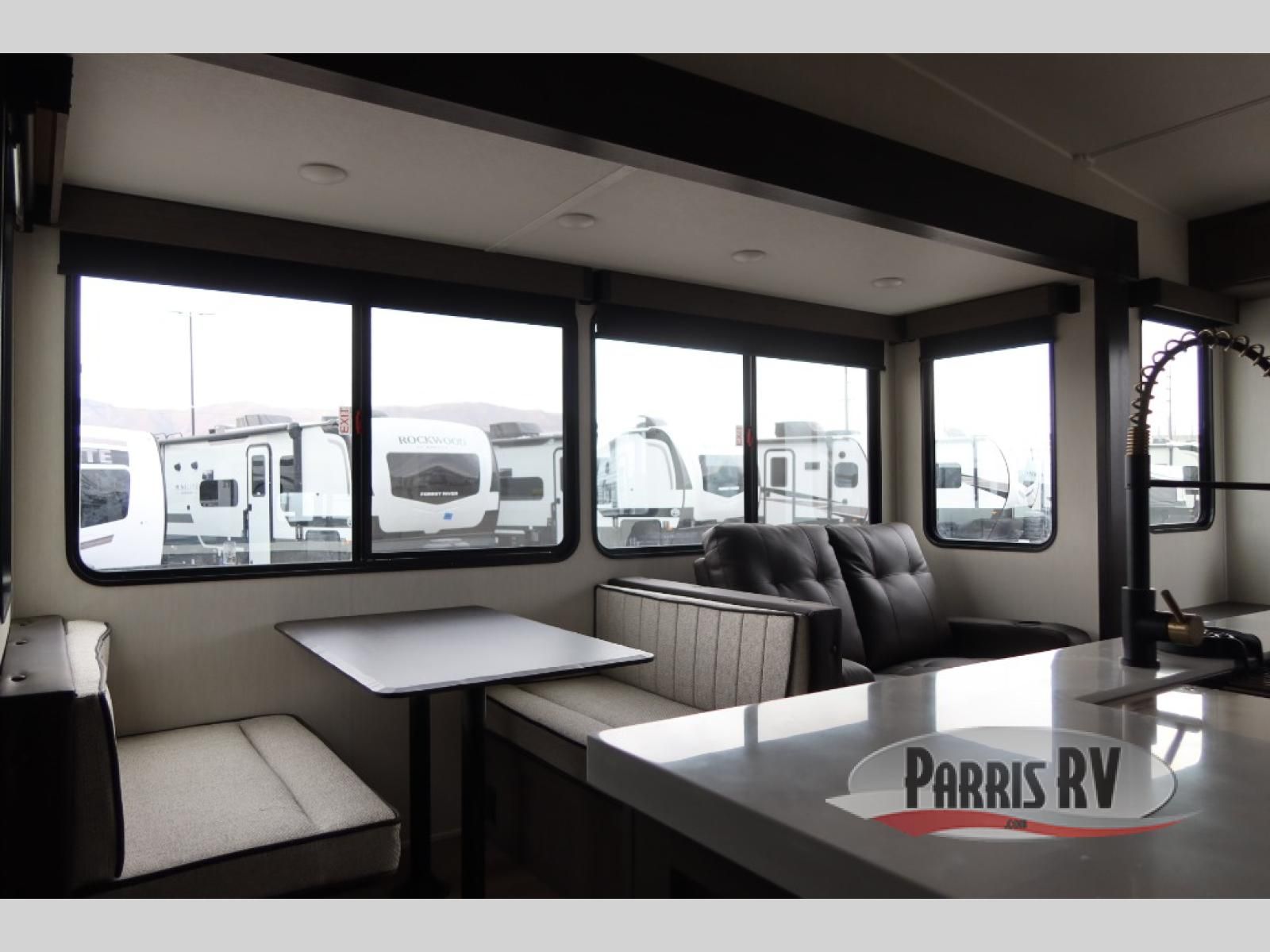 You have excellent sleeping accommodations on this Cherokee Arctic Wolf fifth wheel! There is a private bedroom with a king-size bed at the front for you, and the second bedroom contains two 28" x 72" bunks and a jack knife sofa with trundle for any kids or friends you have traveling with you. A desk provides space to work or study. And it doesn't stop there. There is also a tri-fold sofa in the living area that you can use as a sleeping space. The kitchen is ready for you to make meals on the three-burner range, and you have plenty of work space with a spacious kitchen island. You can enjoy your meals at the dinette, and after dinner relax on the jack knife sofa across from the fireplace.