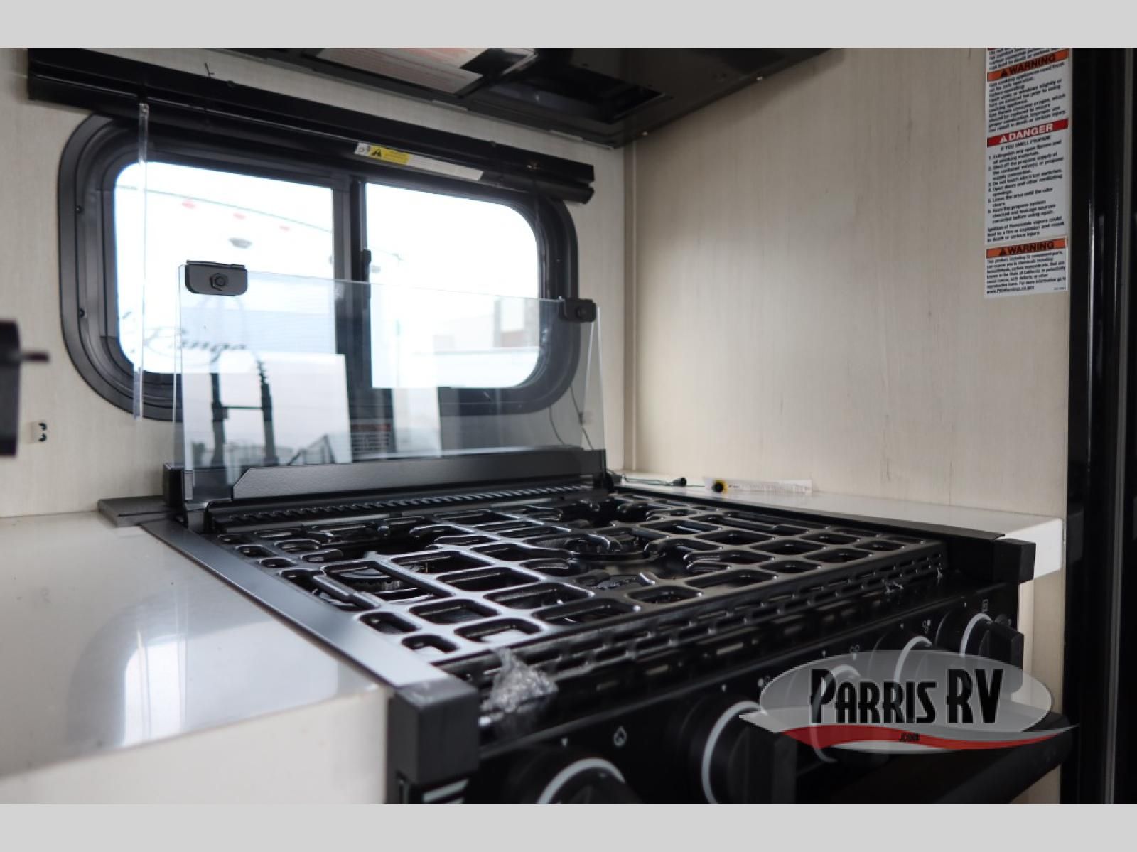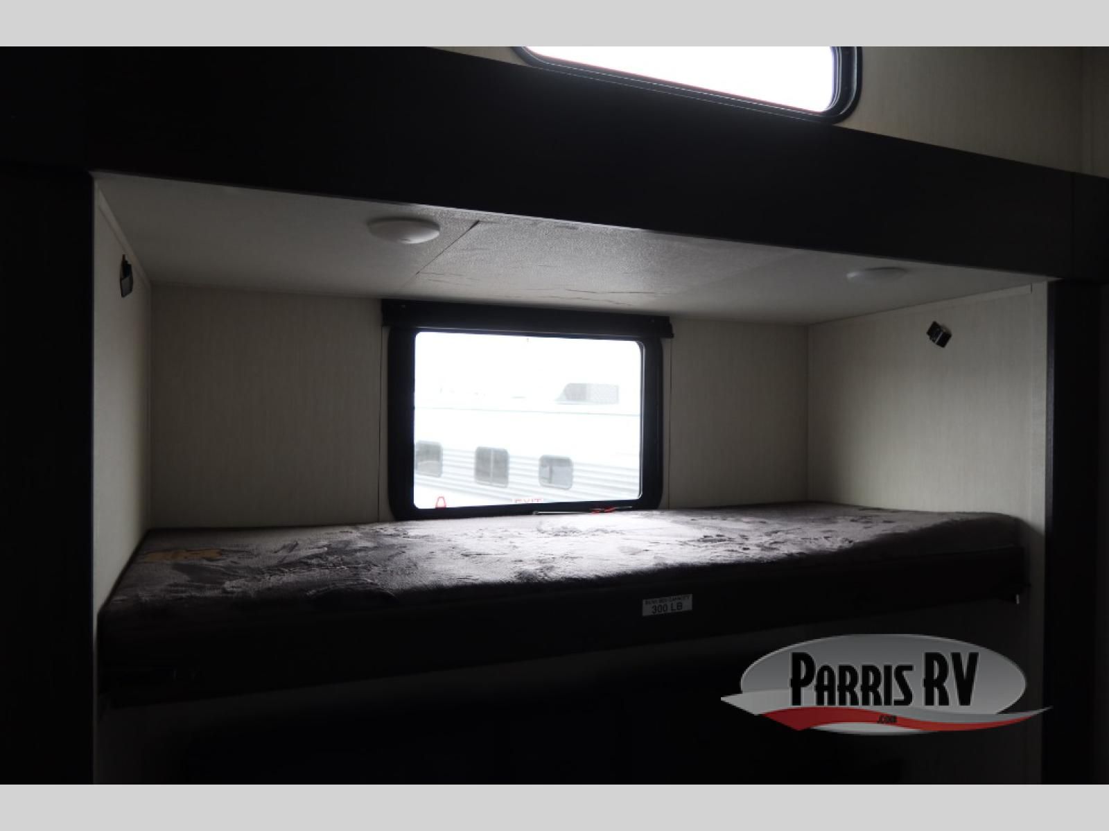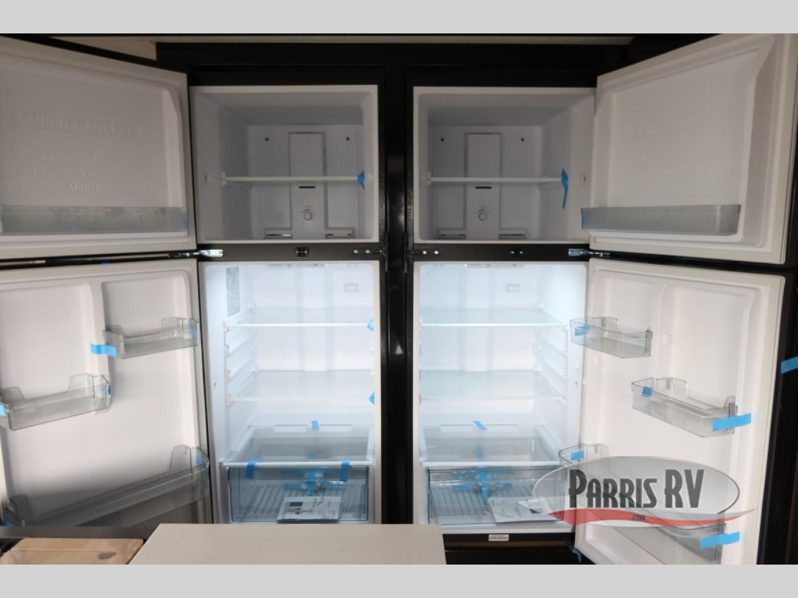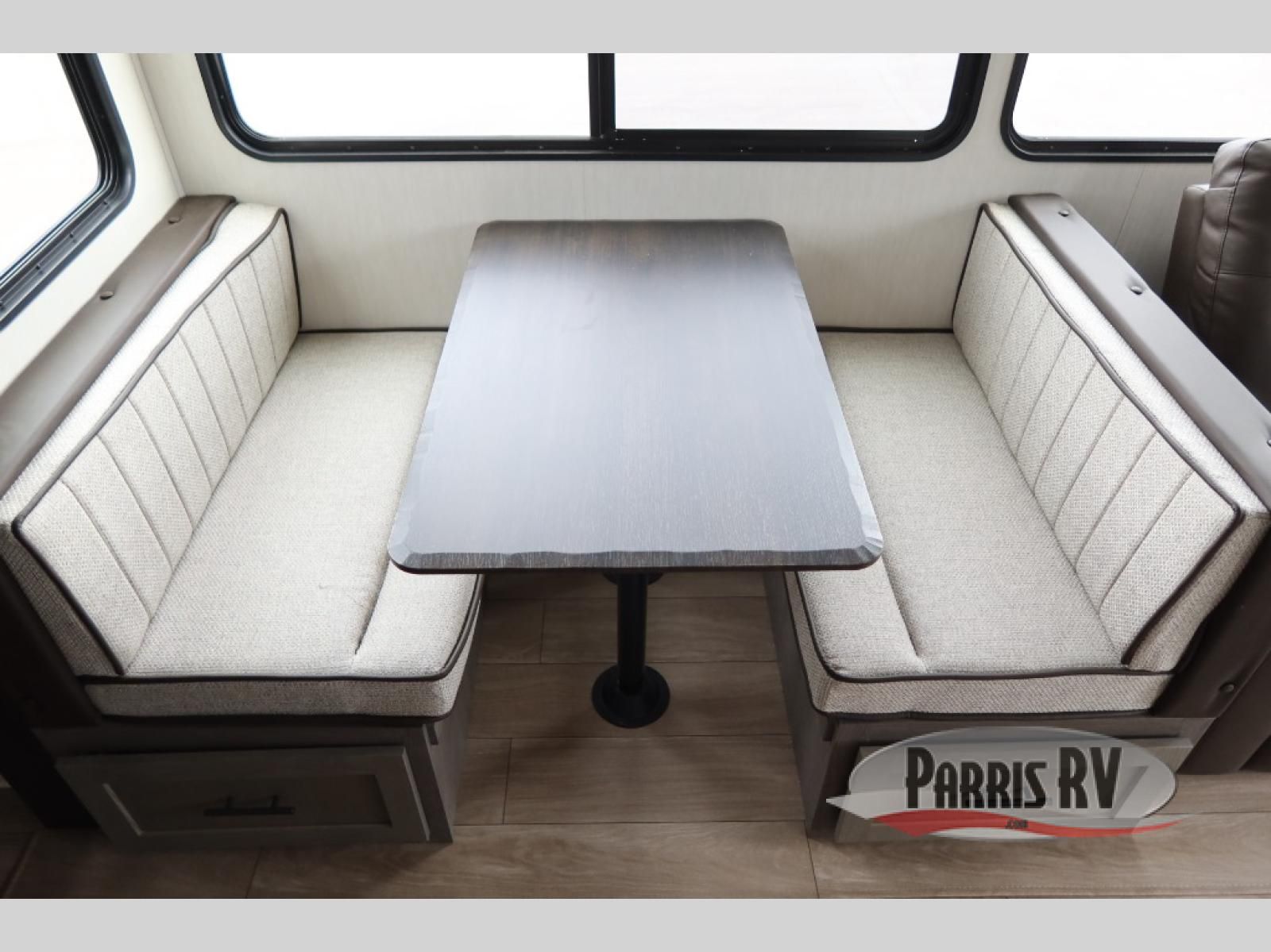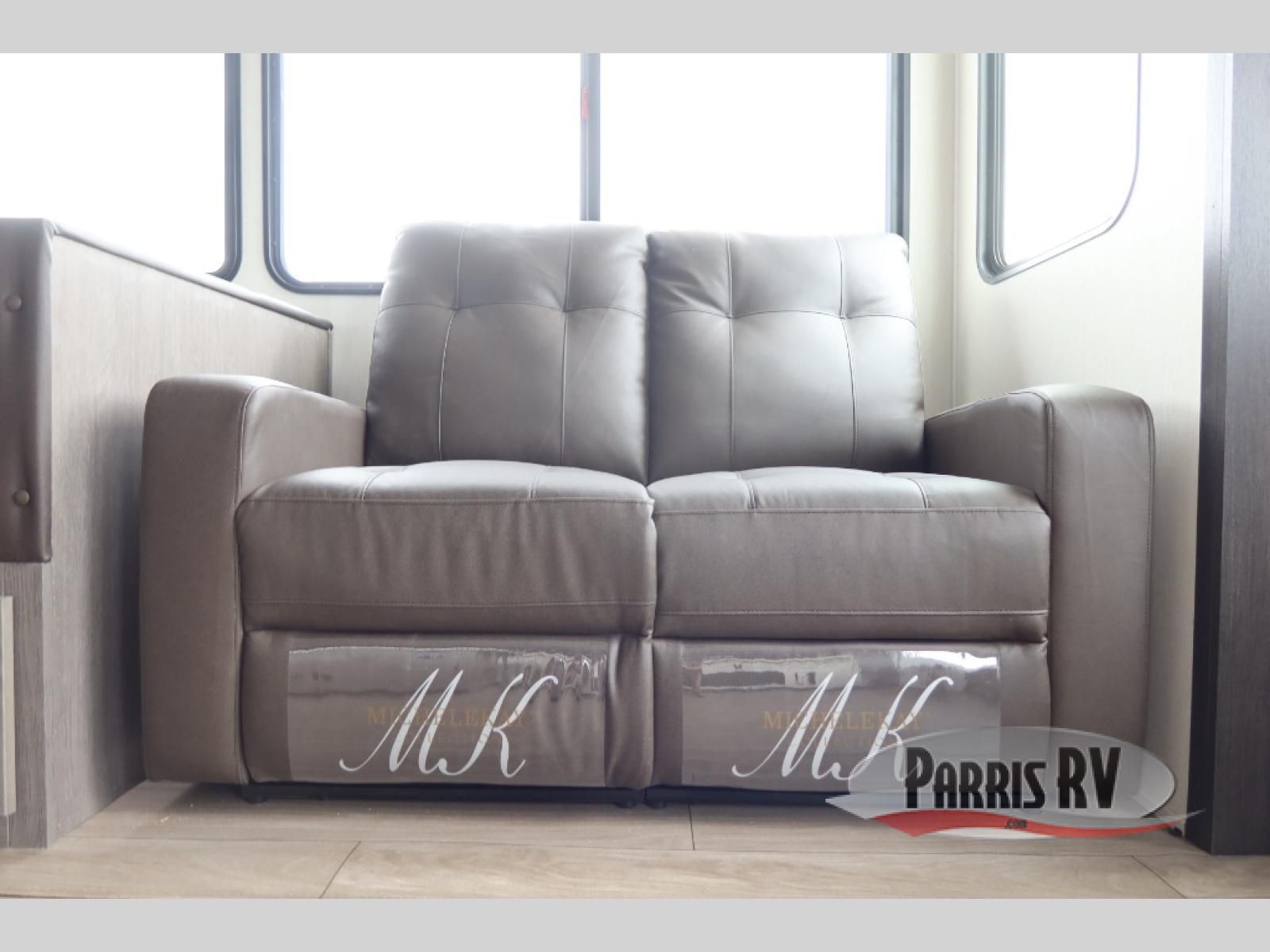 You have excellent sleeping accommodations on this Cherokee Arctic Wolf fifth wheel! There is a private bedroom with a king-size bed at the front for you, and the second bedroom contains two 28" x 72" bunks and a jack knife sofa with trundle for any kids or friends you have traveling with you. A desk provides space to work or study. And it doesn't stop there. There is also a tri-fold sofa in the living area that you can use as a sleeping space. The kitchen is ready for you to make meals on the three-burner range, and you have plenty of work space with a spacious kitchen island. You can enjoy your meals at the dinette, and after dinner relax on the jack knife sofa across from the fireplace.