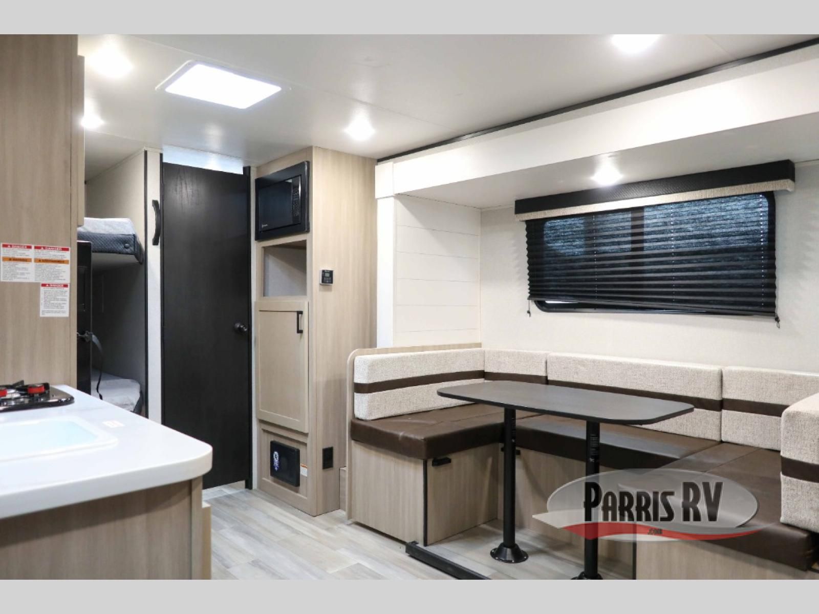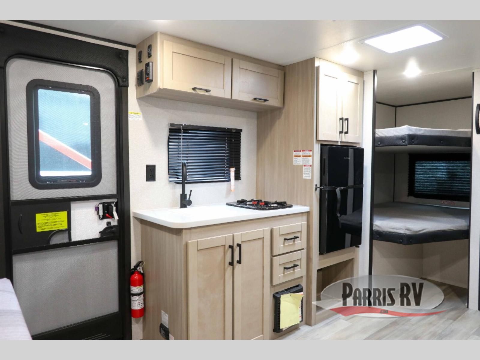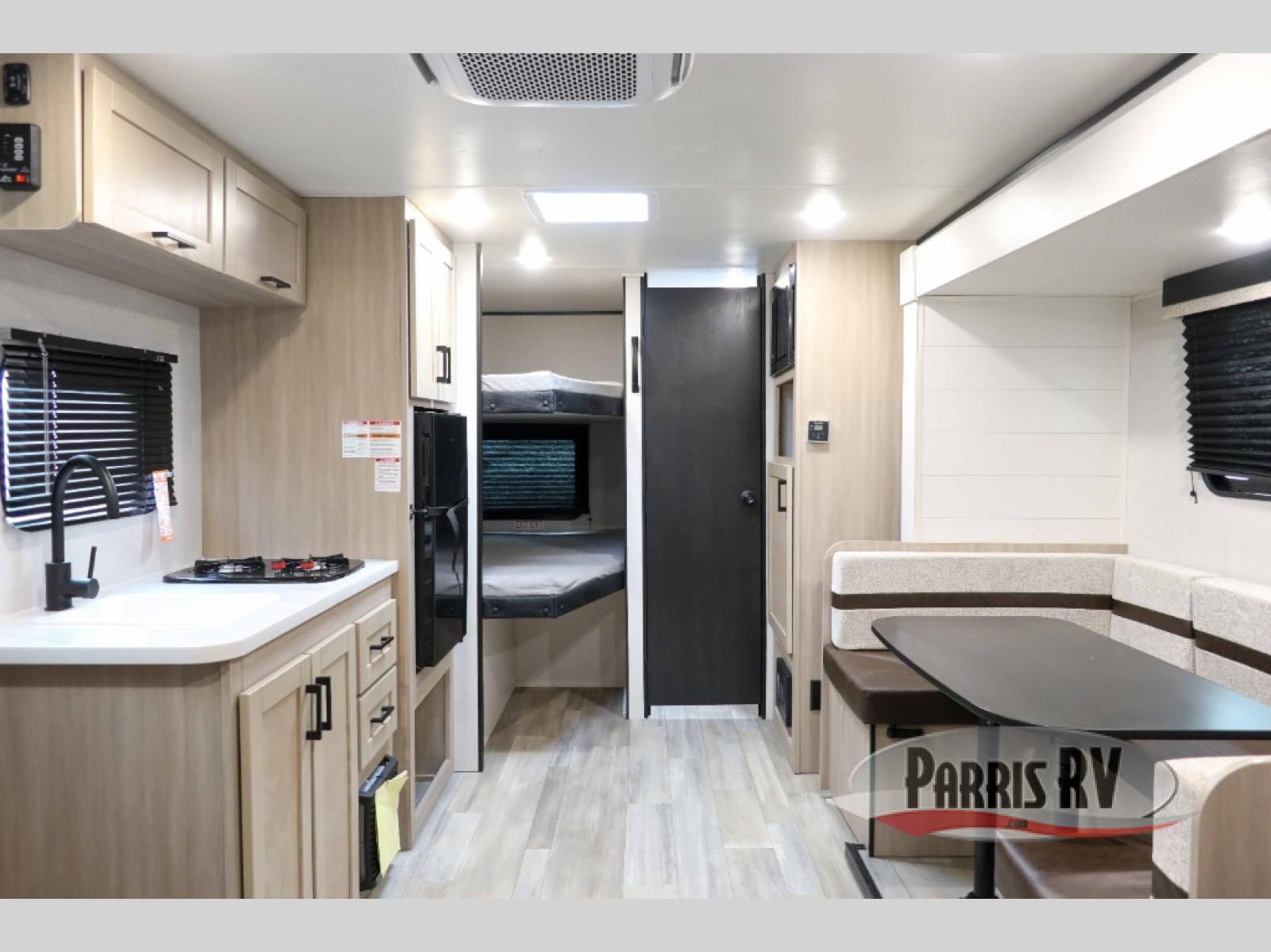 Camping trips are made easy in this Lynx Edition travel trailer with double-size bunk beds for guests or little ones. You'll find the front queen bed for a great night's rest, along with an overhead shelf and a wardrobe to keep your things tidy. The rear corner private bath includes a foot-flush toilet and a 24" x 40" shower, so you won't have to leave the camper in the middle of the night. A two-burner cooktop and microwave oven will let you make meals each day, and you can dine around the U-shaped dinette, which is also within a slide out for more space!