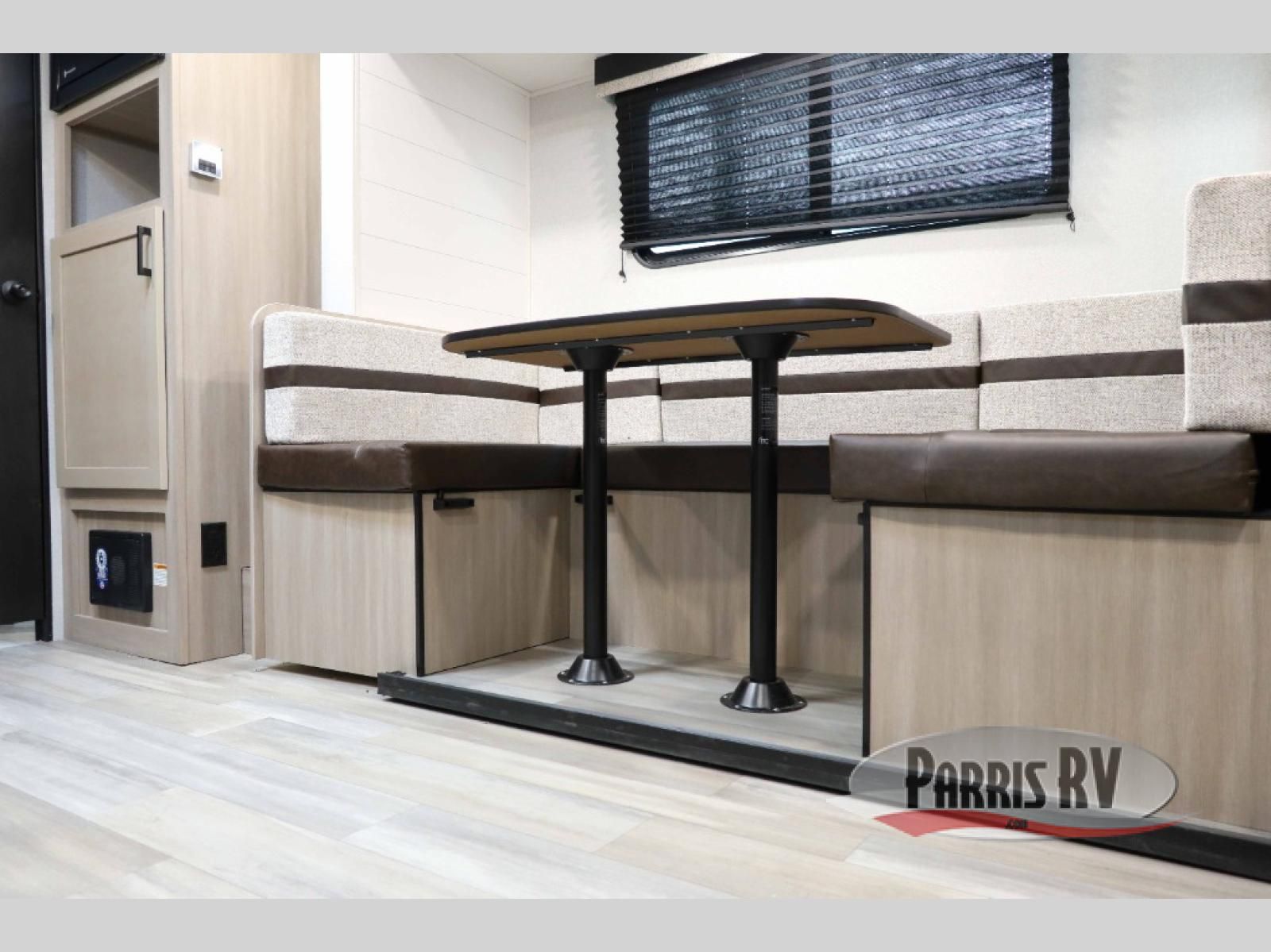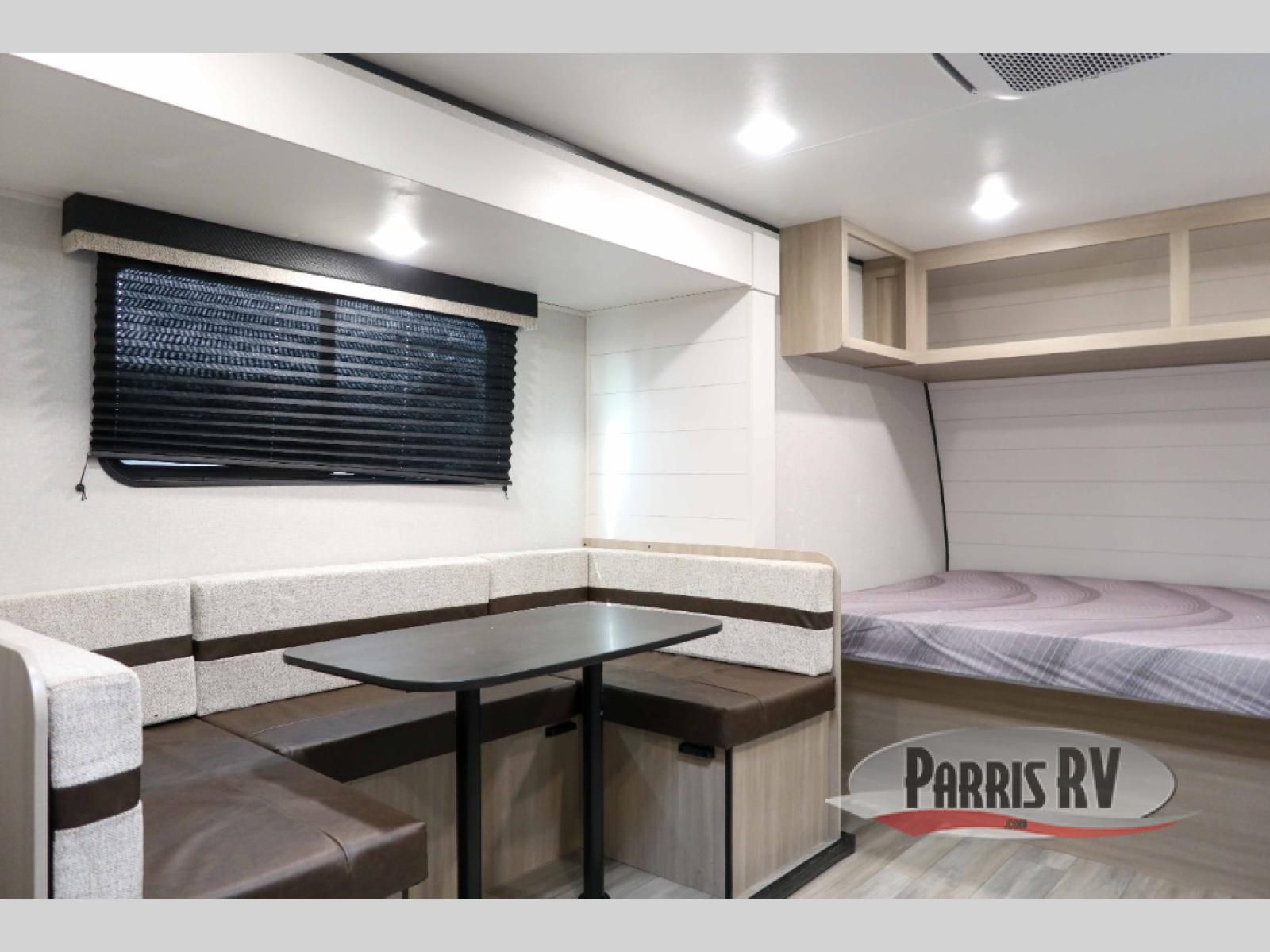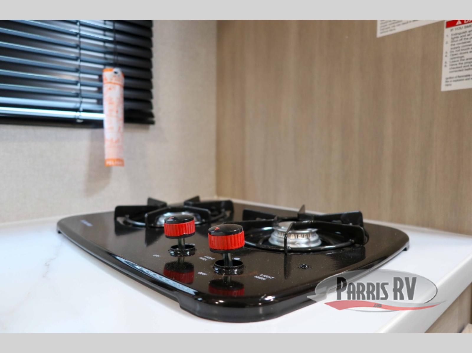 Camping trips are made easy in this Lynx Edition travel trailer with double-size bunk beds for guests or little ones. You'll find the front queen bed for a great night's rest, along with an overhead shelf and a wardrobe to keep your things tidy. The rear corner private bath includes a foot-flush toilet and a 24" x 40" shower, so you won't have to leave the camper in the middle of the night. A two-burner cooktop and microwave oven will let you make meals each day, and you can dine around the U-shaped dinette, which is also within a slide out for more space!
