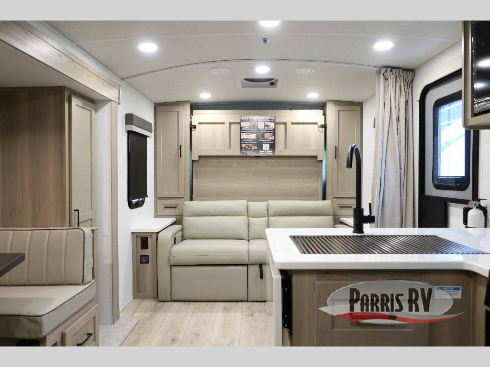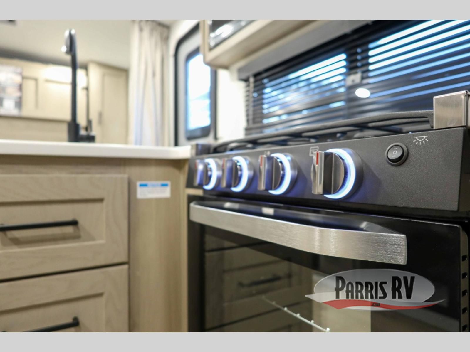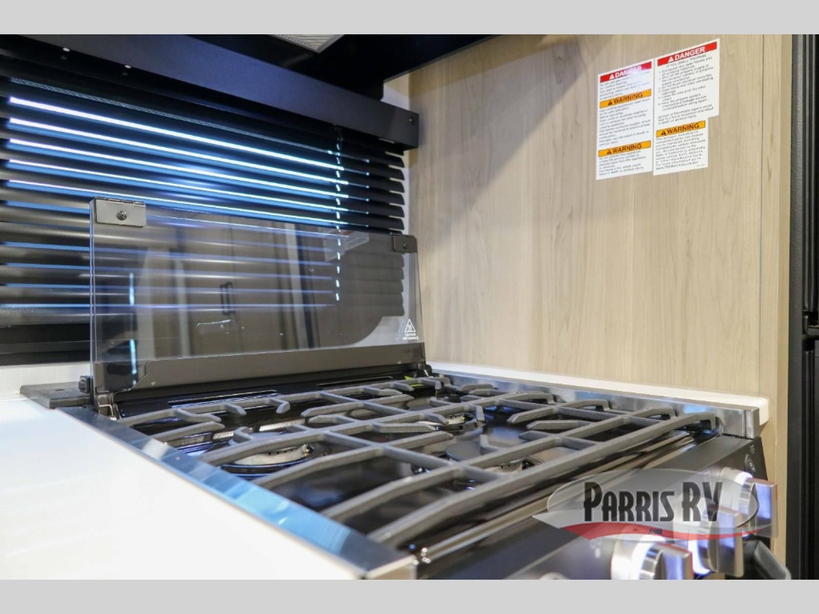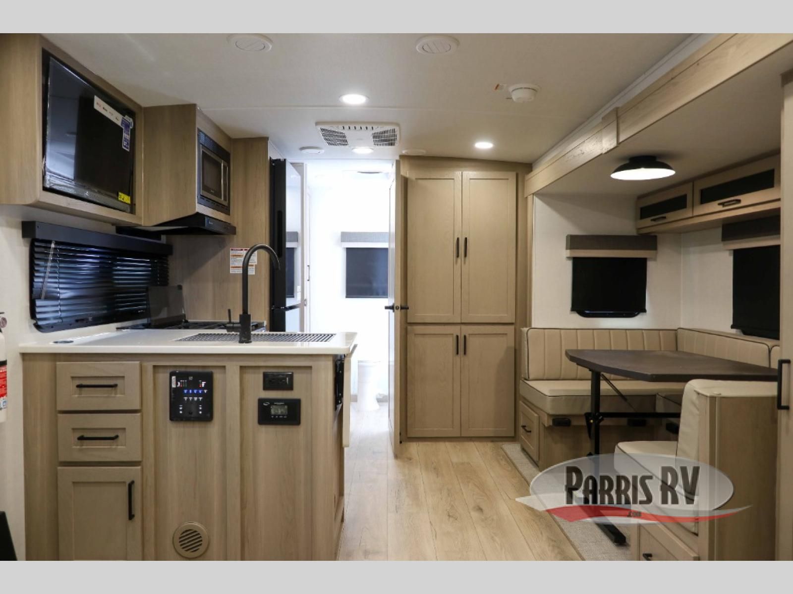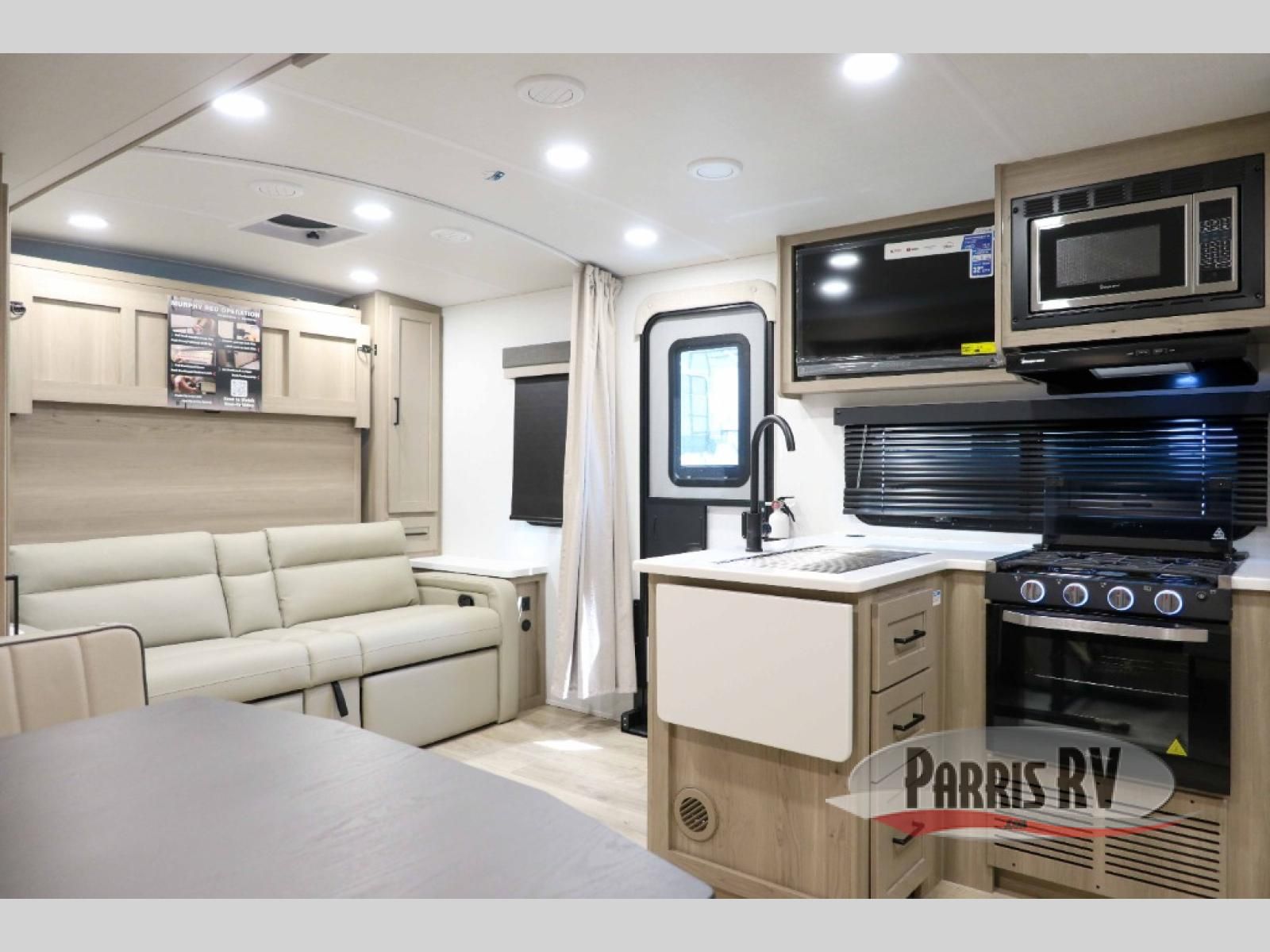 This versatile and cozy travel trailer will be perfect for weekend trips to the lake. Once you arrive at your campground, you can unload the water toys from the pass-thru storage, put out the 15' power awning, then make lunch on the exterior griddle. The U-shaped dinette slide inside will provide a place to dine, play board games, and let a guest or two sleep over, while you take the RV queen-size Murphy bed up front. In the morning, just fold up the bed to expose the 74" sofa! There is a three burner cooktop and microwave oven in the kitchen to make meals each day, along with a 12V refrigerator to keep leftovers fresh.