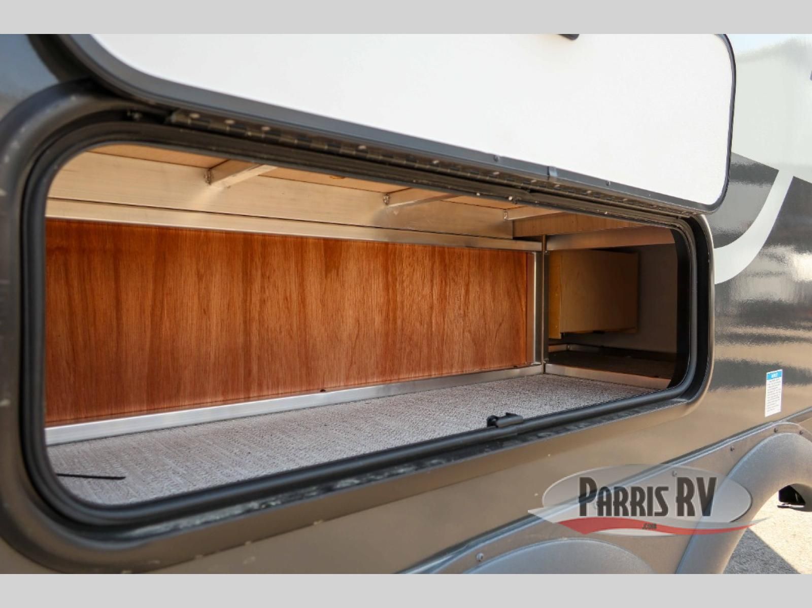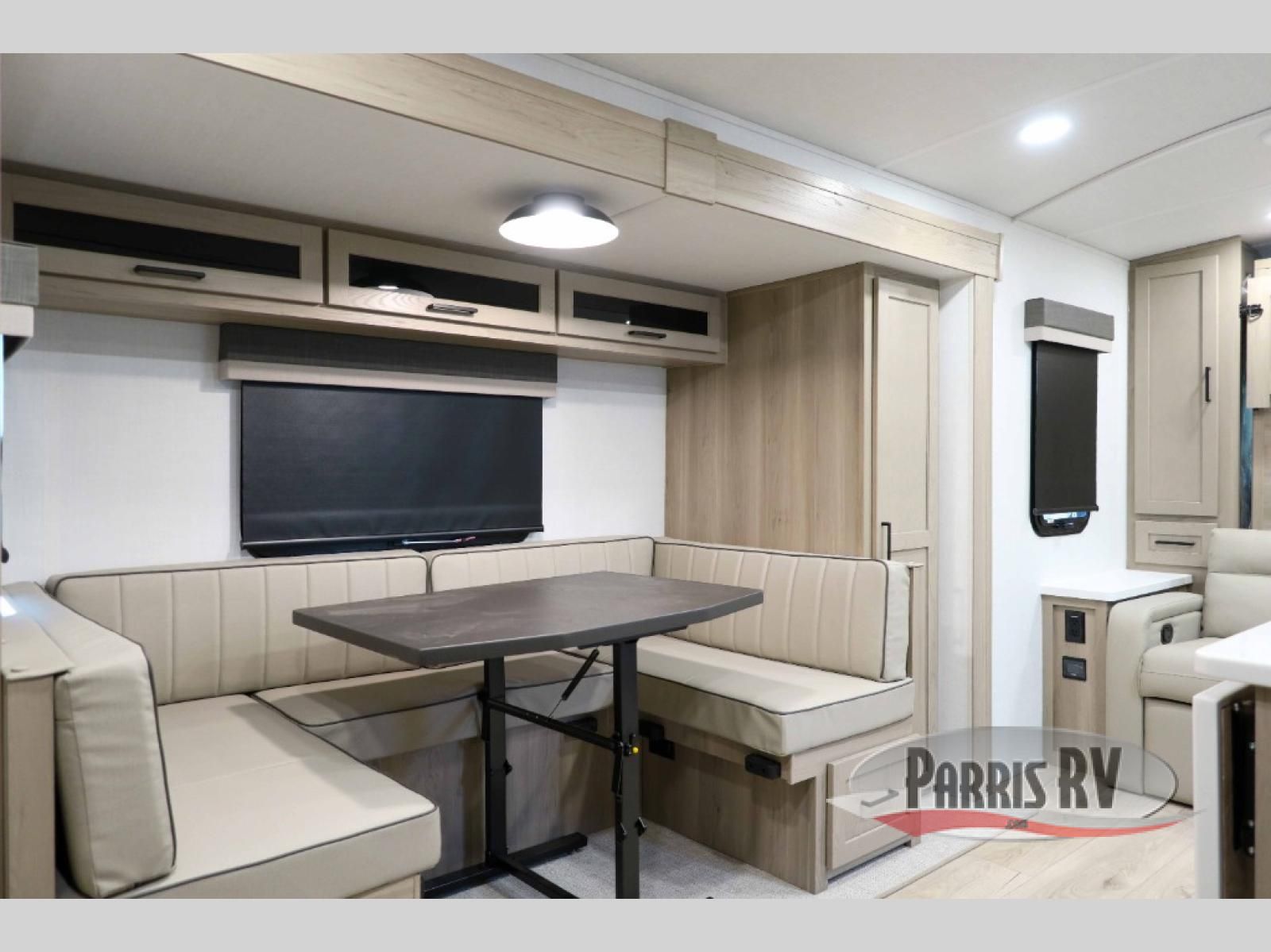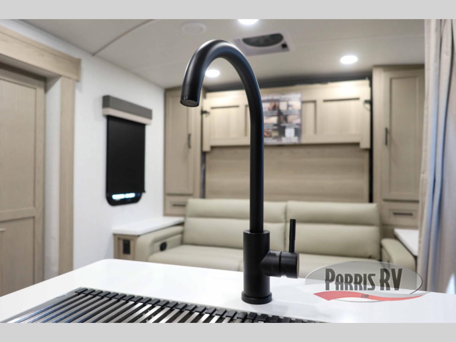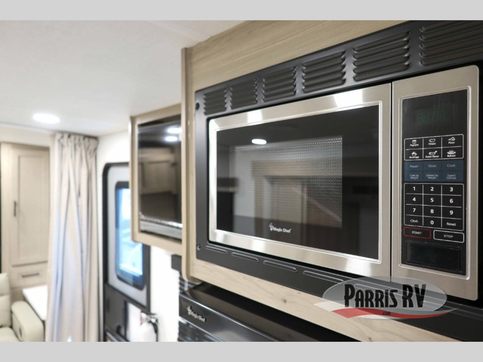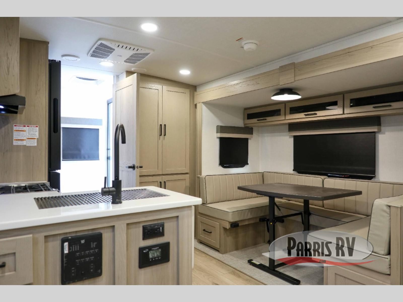 This versatile and cozy travel trailer will be perfect for weekend trips to the lake. Once you arrive at your campground, you can unload the water toys from the pass-thru storage, put out the 15' power awning, then make lunch on the exterior griddle. The U-shaped dinette slide inside will provide a place to dine, play board games, and let a guest or two sleep over, while you take the RV queen-size Murphy bed up front. In the morning, just fold up the bed to expose the 74" sofa! There is a three burner cooktop and microwave oven in the kitchen to make meals each day, along with a 12V refrigerator to keep leftovers fresh.
