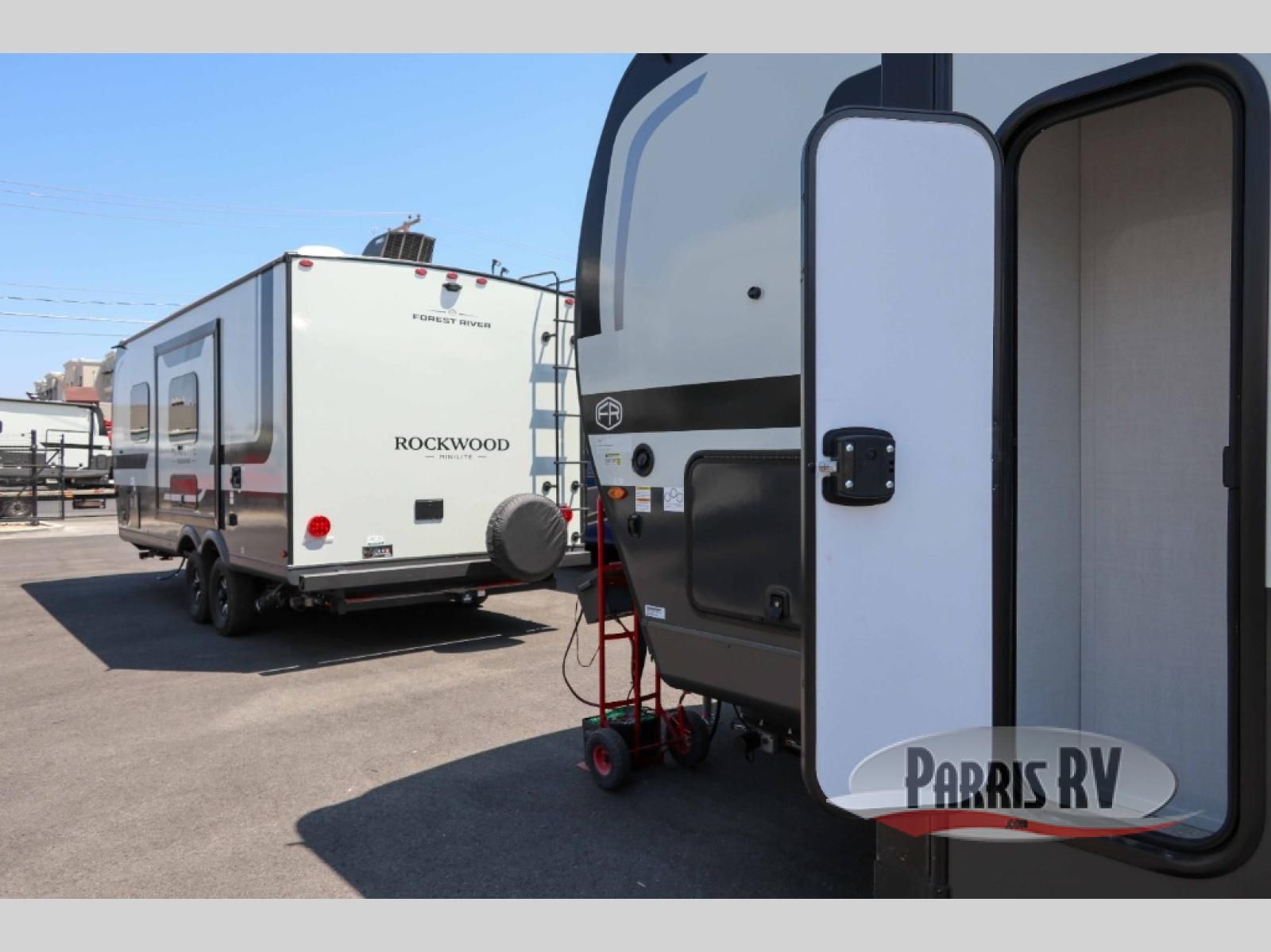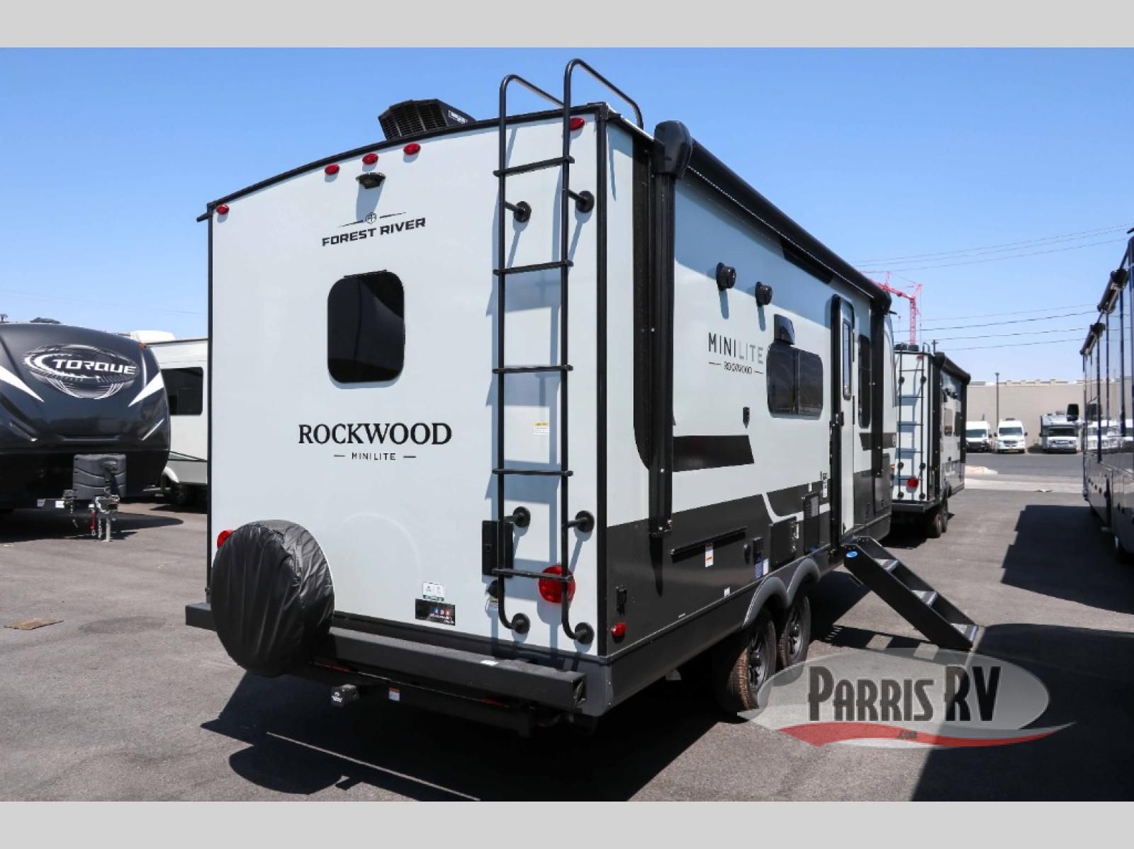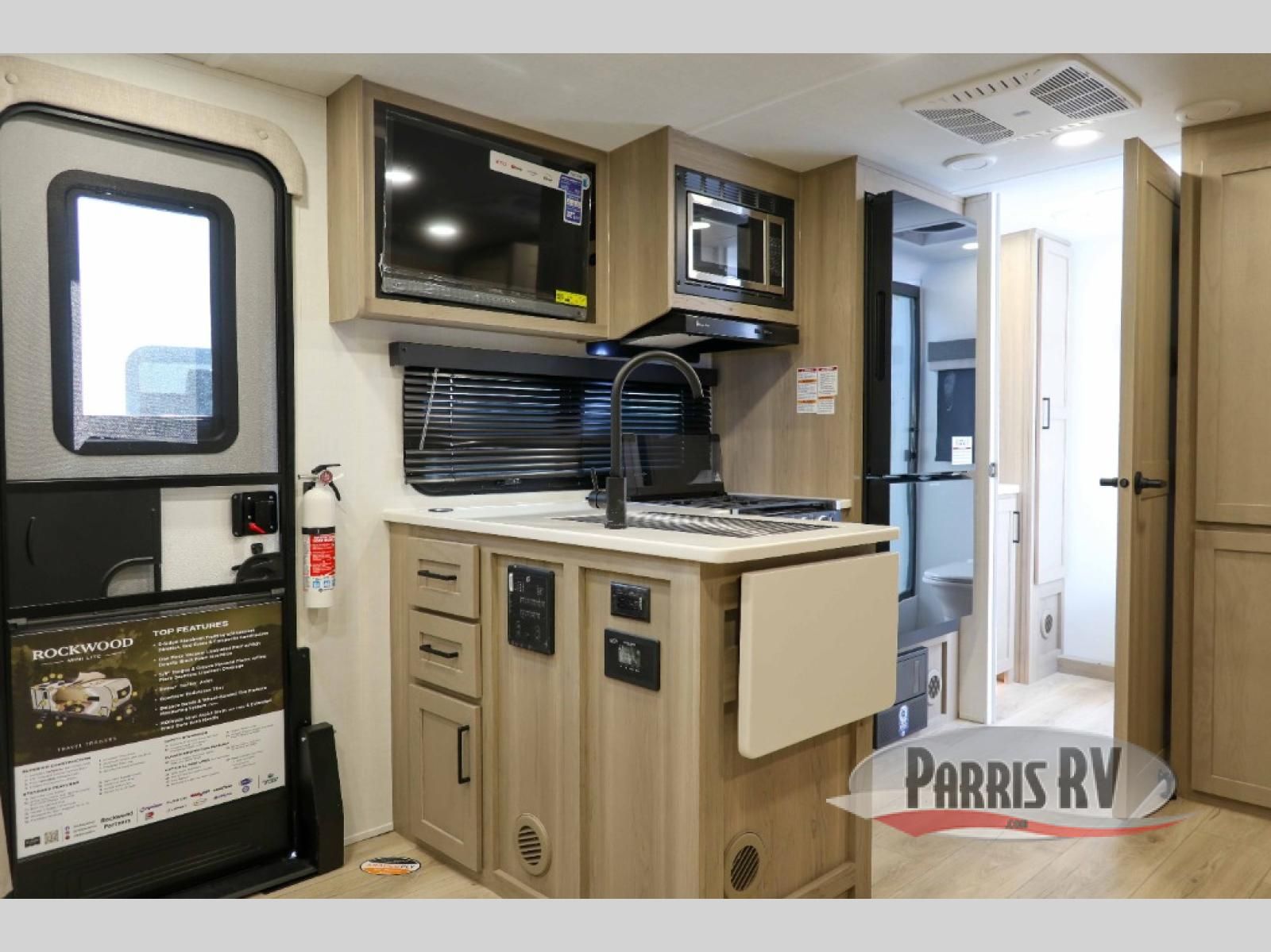 Each Rockwood Mini Lite travel trailer by Forest River is constructed with a fully laminated one-piece walkable roof, sleek frameless windows, and a six-sided full aluminum frame for strength and durability. The 12V thermostatically controlled heated tanks, plus radiant foil in the underbelly will allow you to camp well into the colder months, and the 200W roof solar panel will be perfect for a little off-gridding. Each model includes solid surface kitchen countertops, hidden hinge cabinet doors, roller shades, plus many more interior features. Having an AIR 360+ omnidirectional antenna with WiFi prep on board gives you the option to get some work done if it's needed, and the power tongue jack provides hassle-free set up, so you can enjoy more time relaxing!