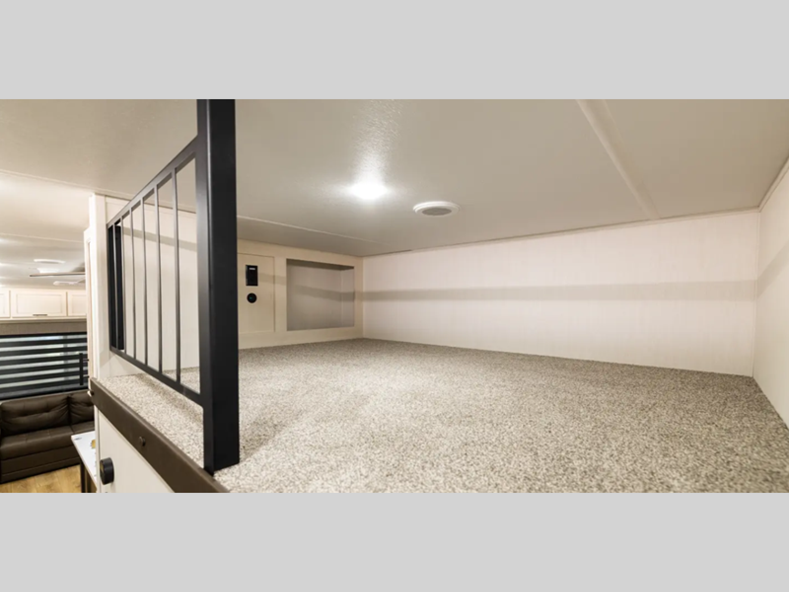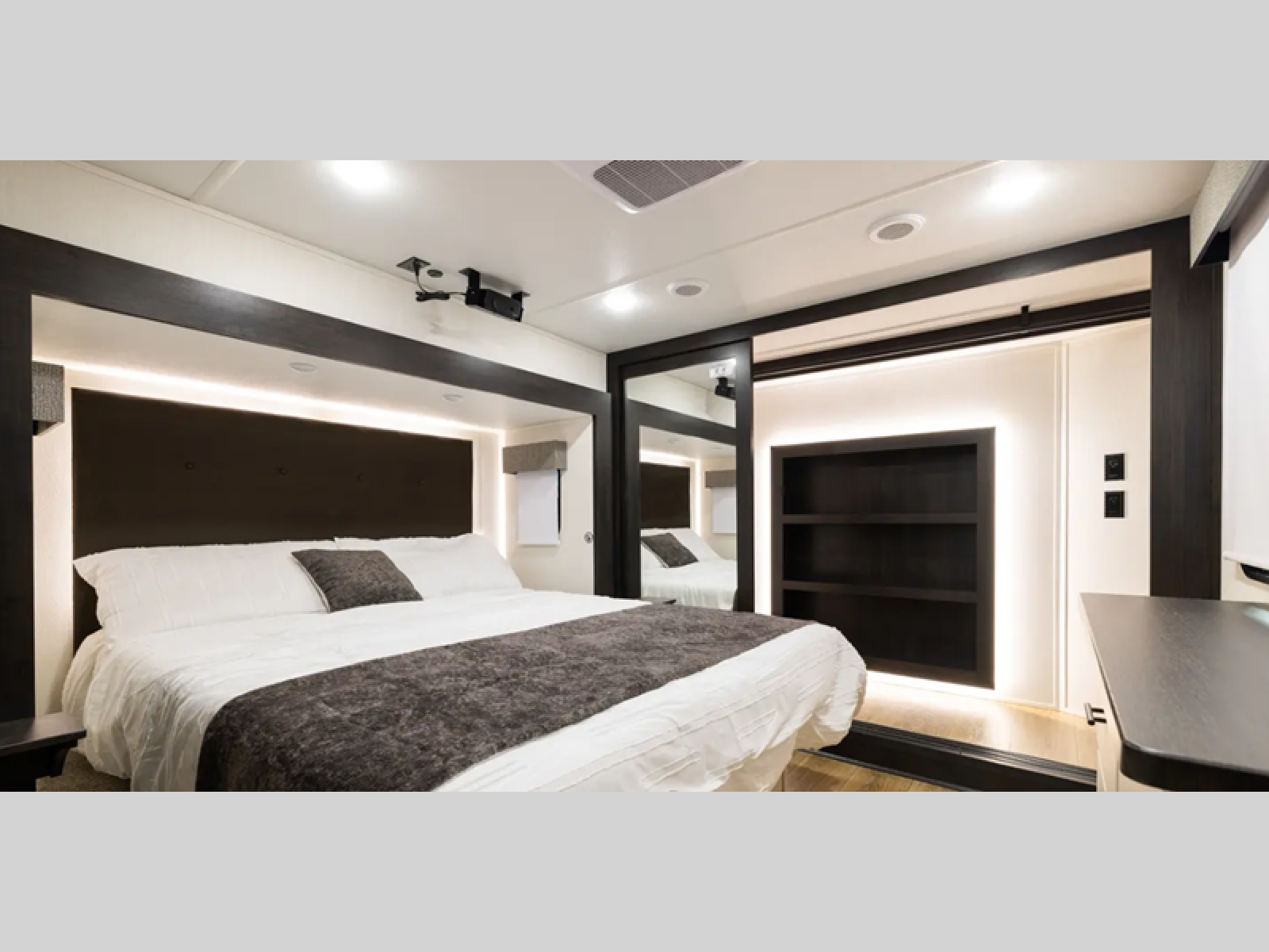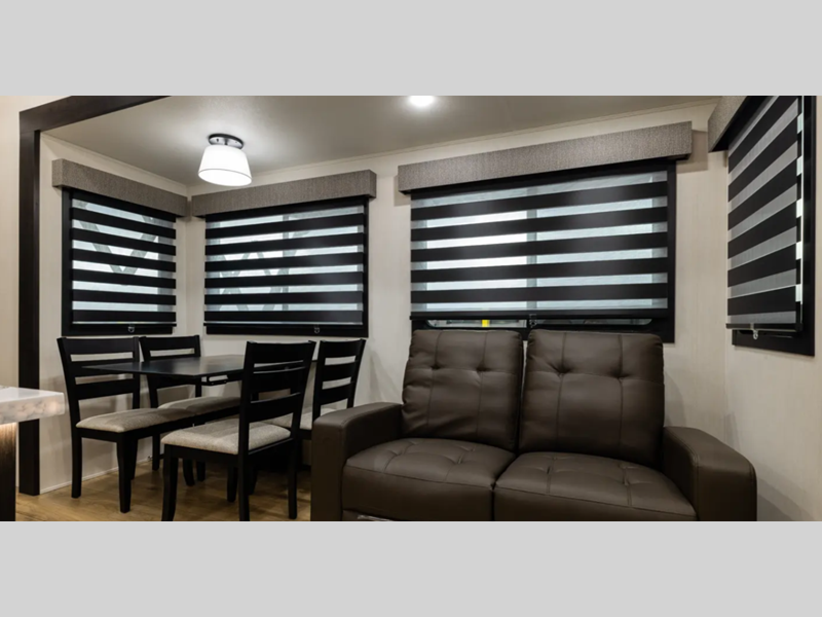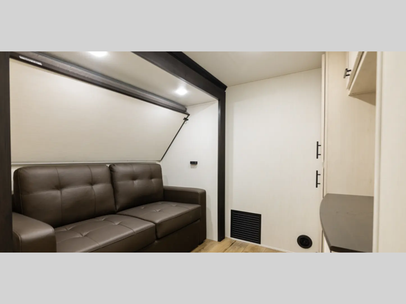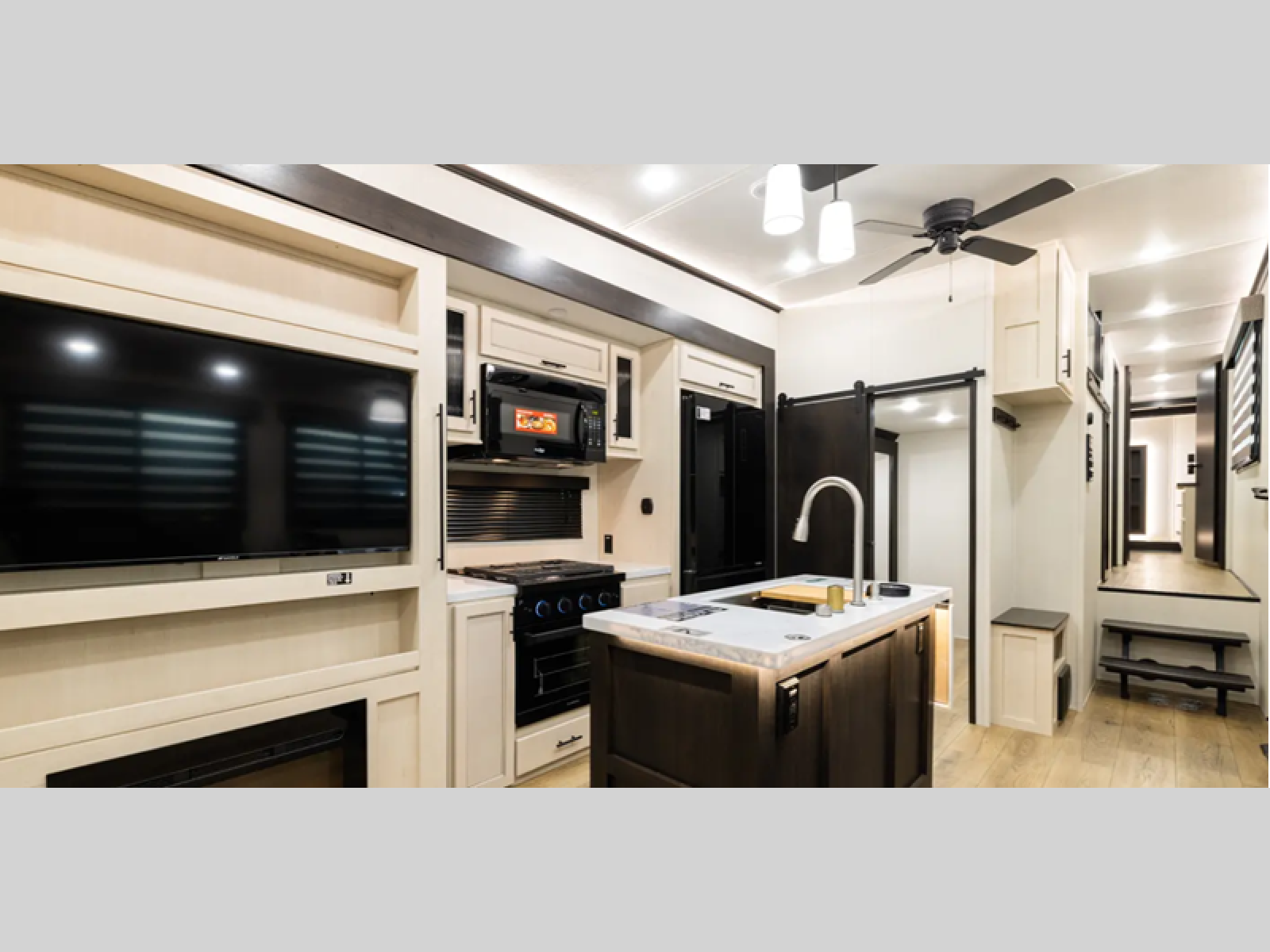 There is much to love in this fifth wheel! Starting with the second bedroom which has a slide that houses a flip-up bunk above a tri-fold sofa across from a desk with drawers, a drop zone, and a wardrobe, plus above all of that is a storage/bunk loft. The rear living area includes a tri-fold sofa, a TV with a hidden pantry behind, and theater seating for two making this space another area at night for guests. In the morning, you can prepare breakfast on the kitchen island, then dine together at the versatile dinette/desk. The full bath will allow you to stay clean throughout your trip, and you'll feel right at home in the front private bedroom with a camper king bed, a dresser, and front wardrobe. Outside, a kitchen and two power awnings create an inviting space!