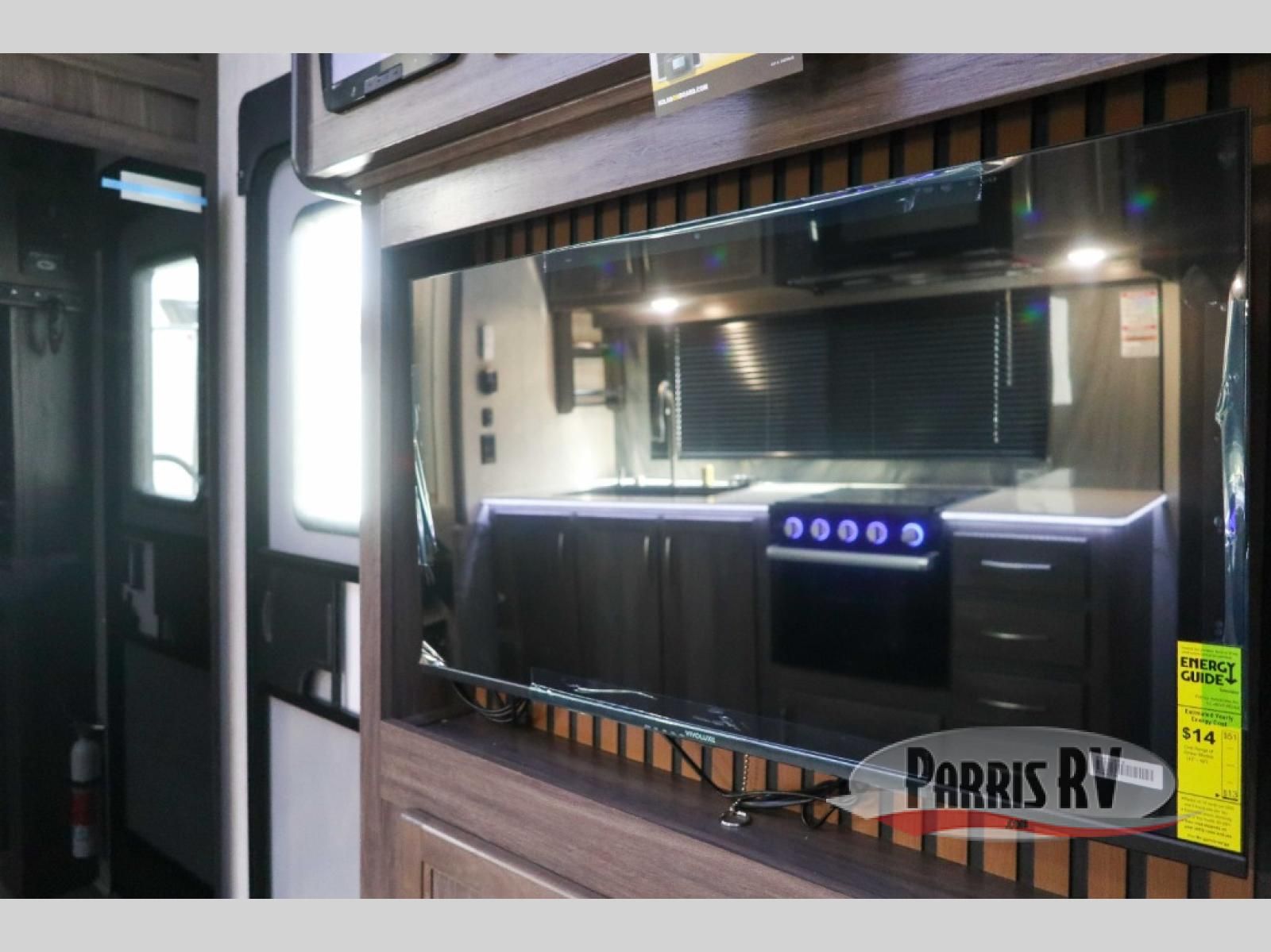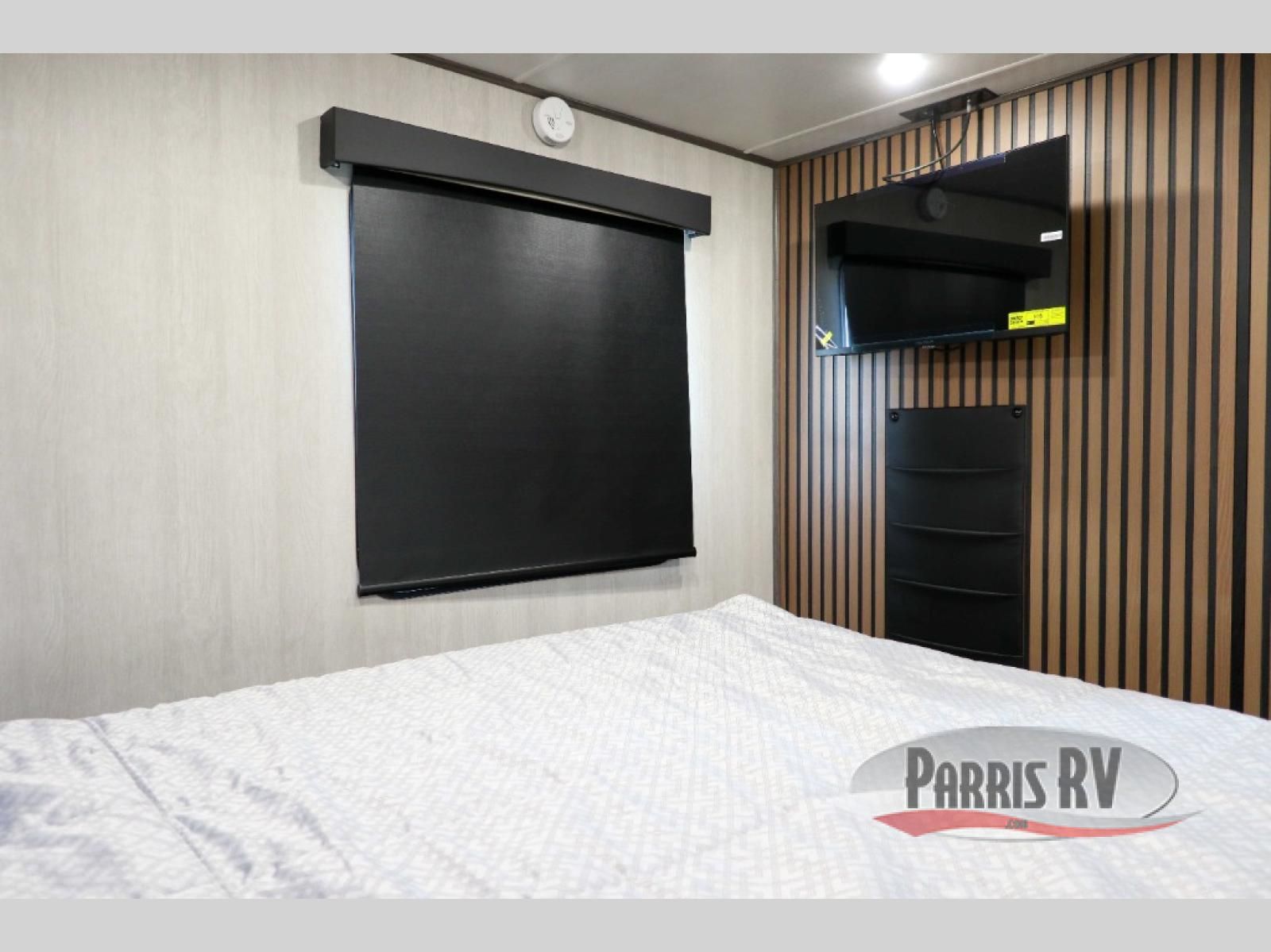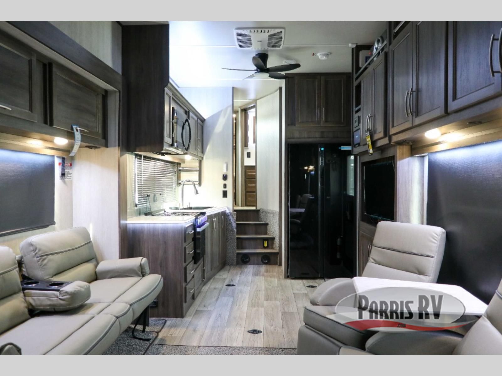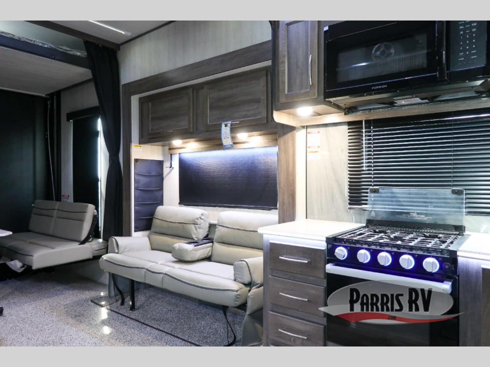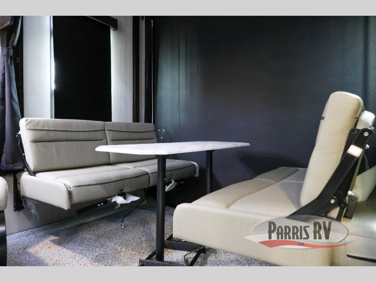 Sit back in one of the two lounge chairs on this Vortex toy hauler after exerting all of your energy out on the trails for the day! If you need to replenish your energy, grab some food from the 8-cubic foot refrigerator or heat up some leftovers in the XL residential microwave. The sofa table is good for eating meals or catching up with friends over dessert, and the full bathroom has a linen closet to store your towels. The private bedroom has a wardrobe slide to add space for moving about and storing your clothes, and you can also add another optional slide in the main living area.