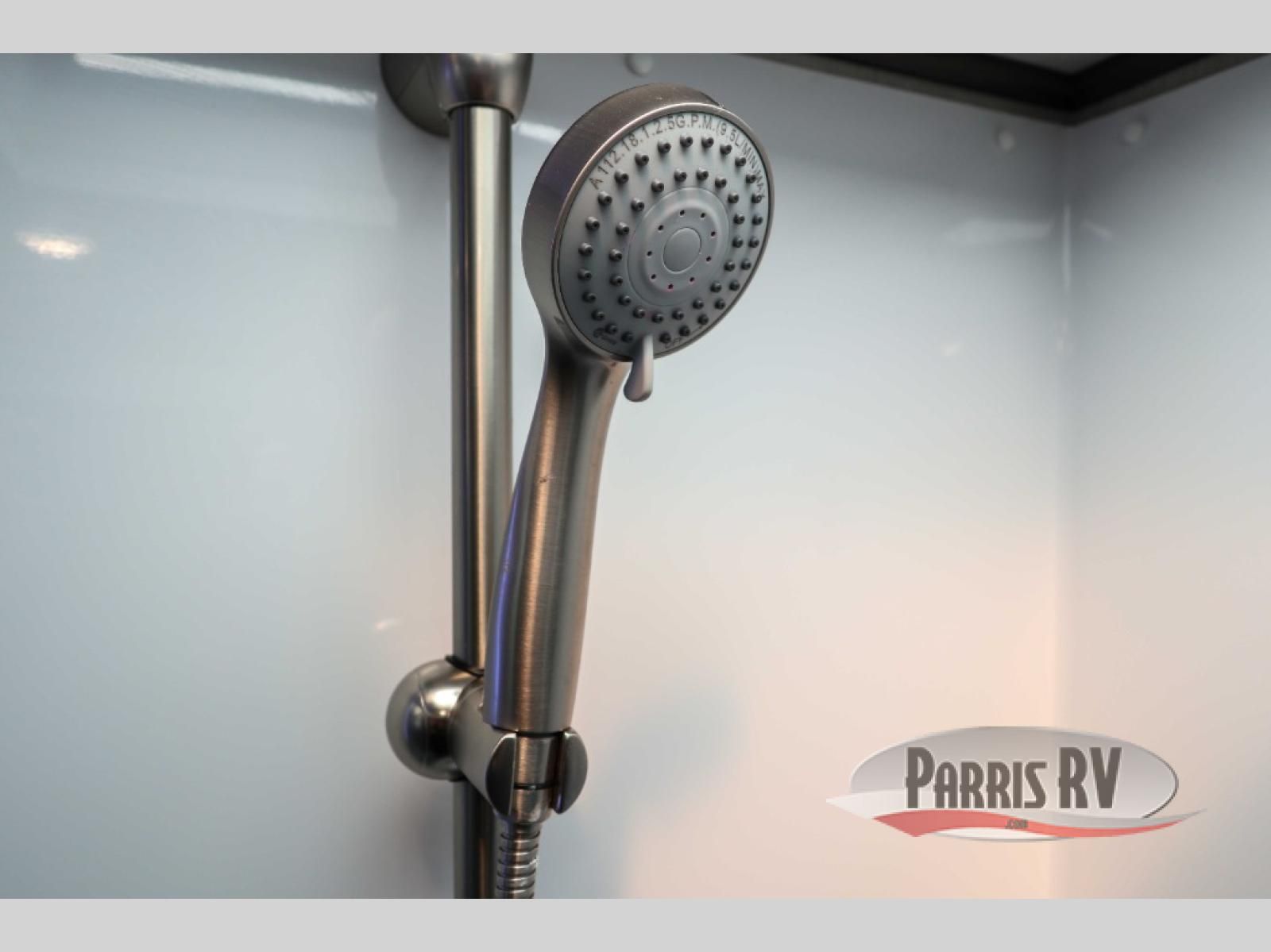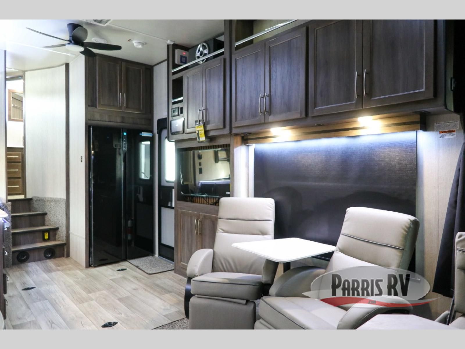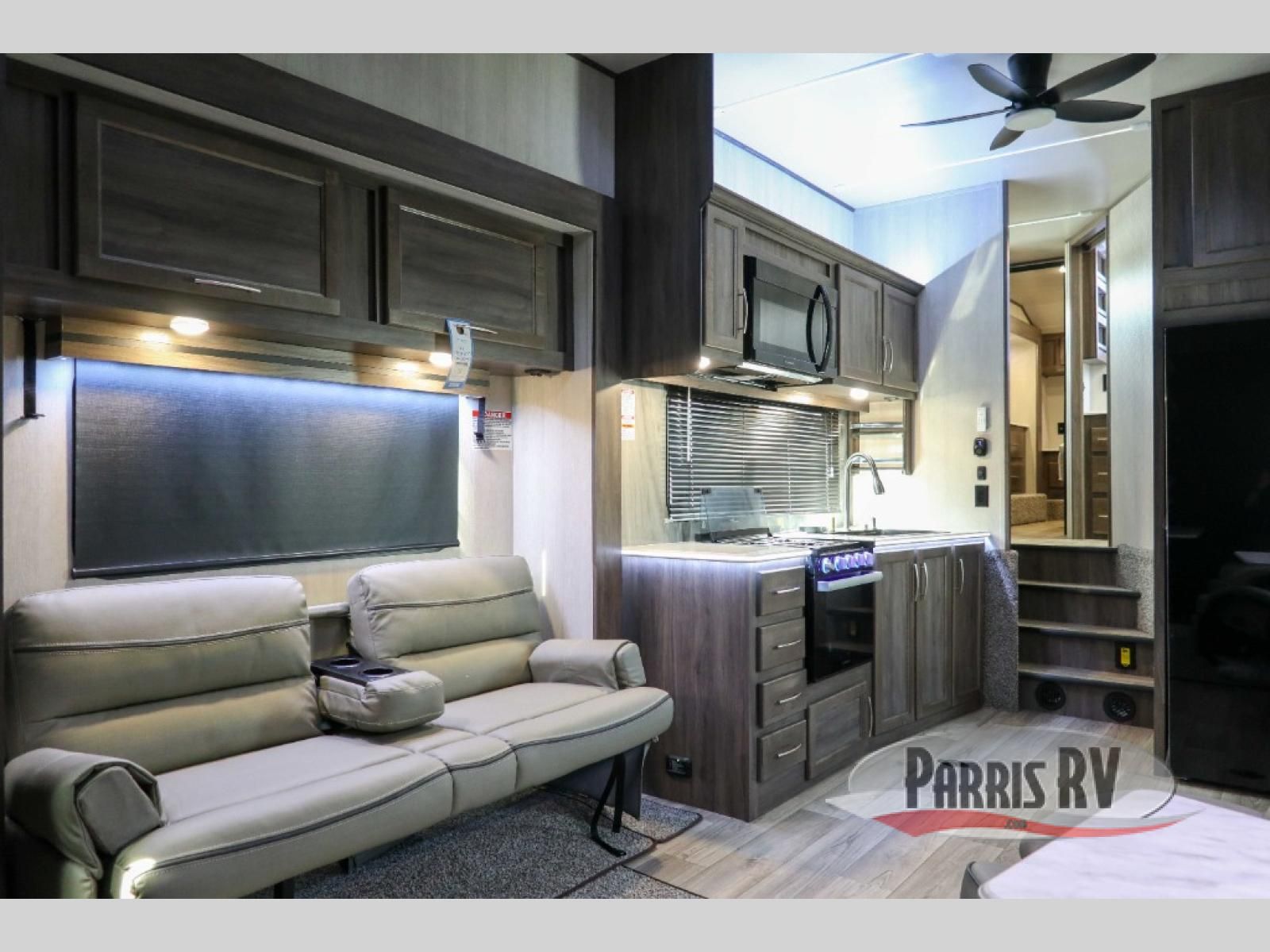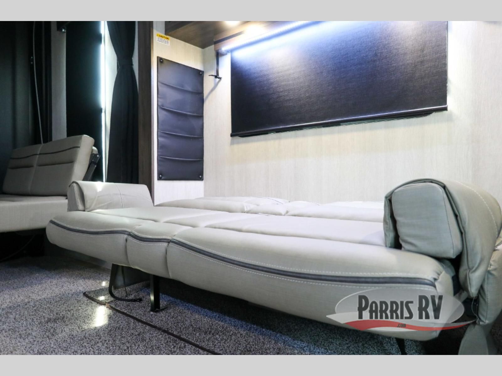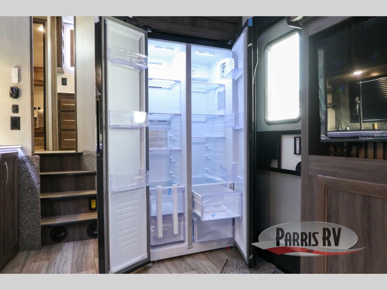 Sit back in one of the two lounge chairs on this Vortex toy hauler after exerting all of your energy out on the trails for the day! If you need to replenish your energy, grab some food from the 8-cubic foot refrigerator or heat up some leftovers in the XL residential microwave. The sofa table is good for eating meals or catching up with friends over dessert, and the full bathroom has a linen closet to store your towels. The private bedroom has a wardrobe slide to add space for moving about and storing your clothes, and you can also add another optional slide in the main living area.