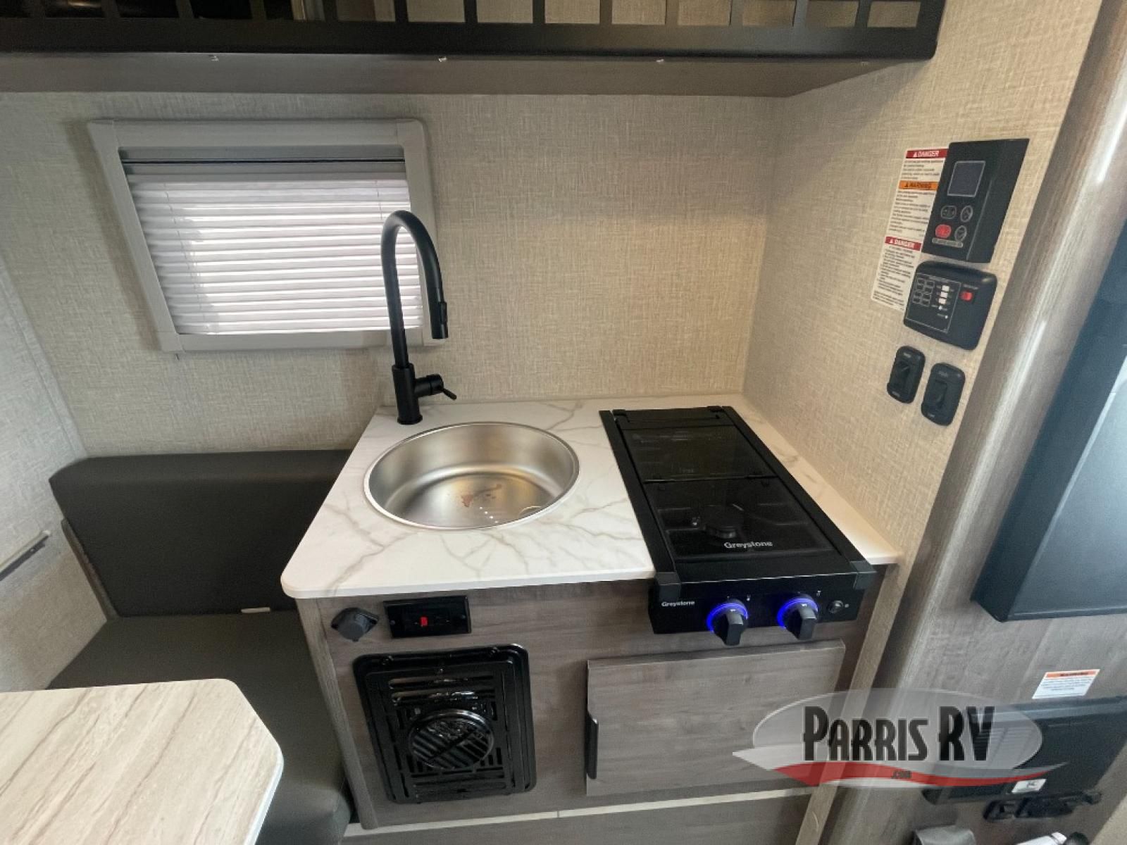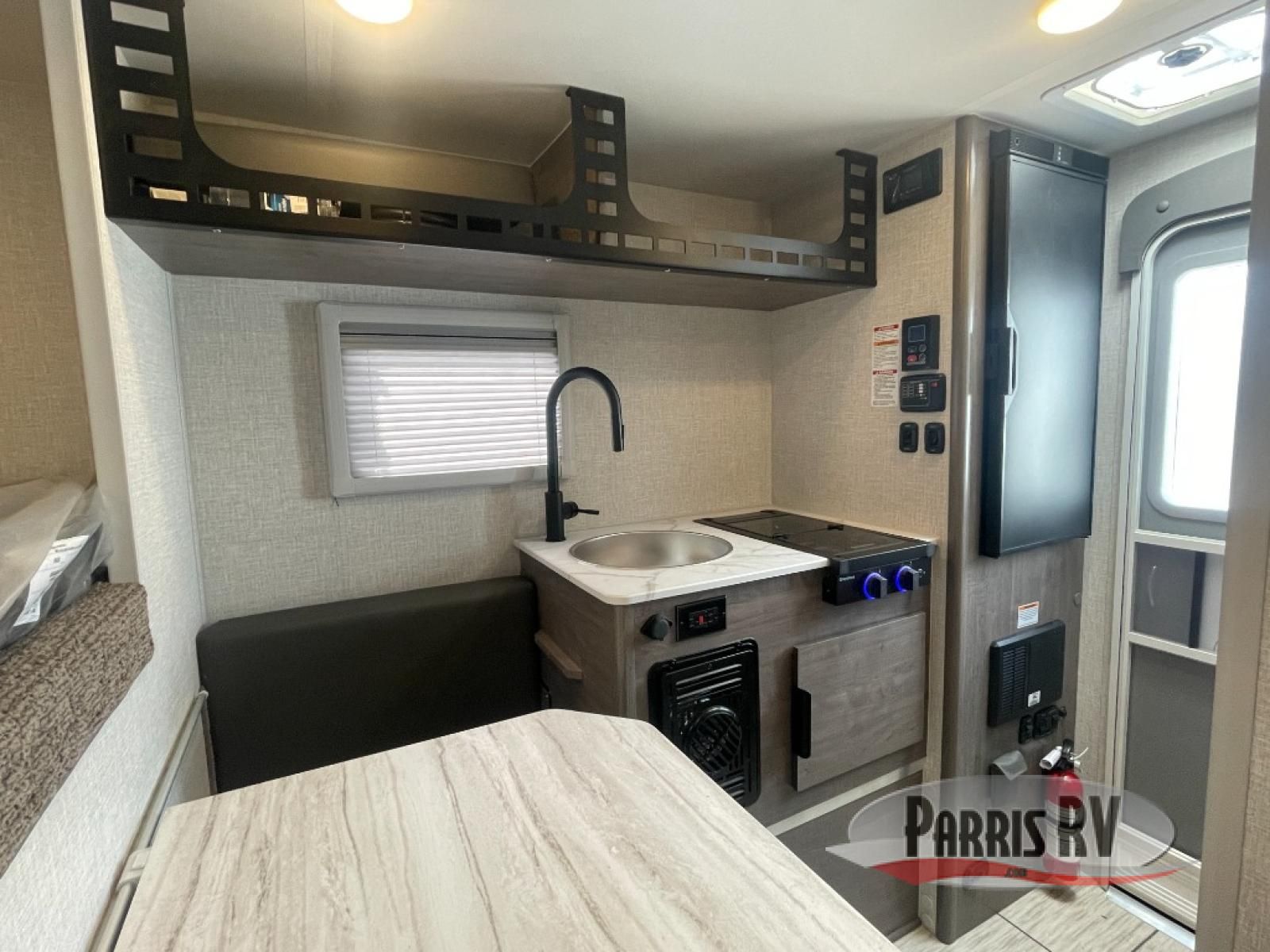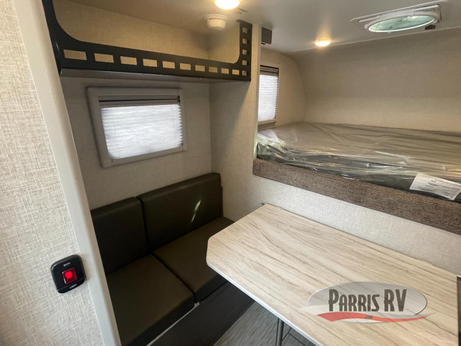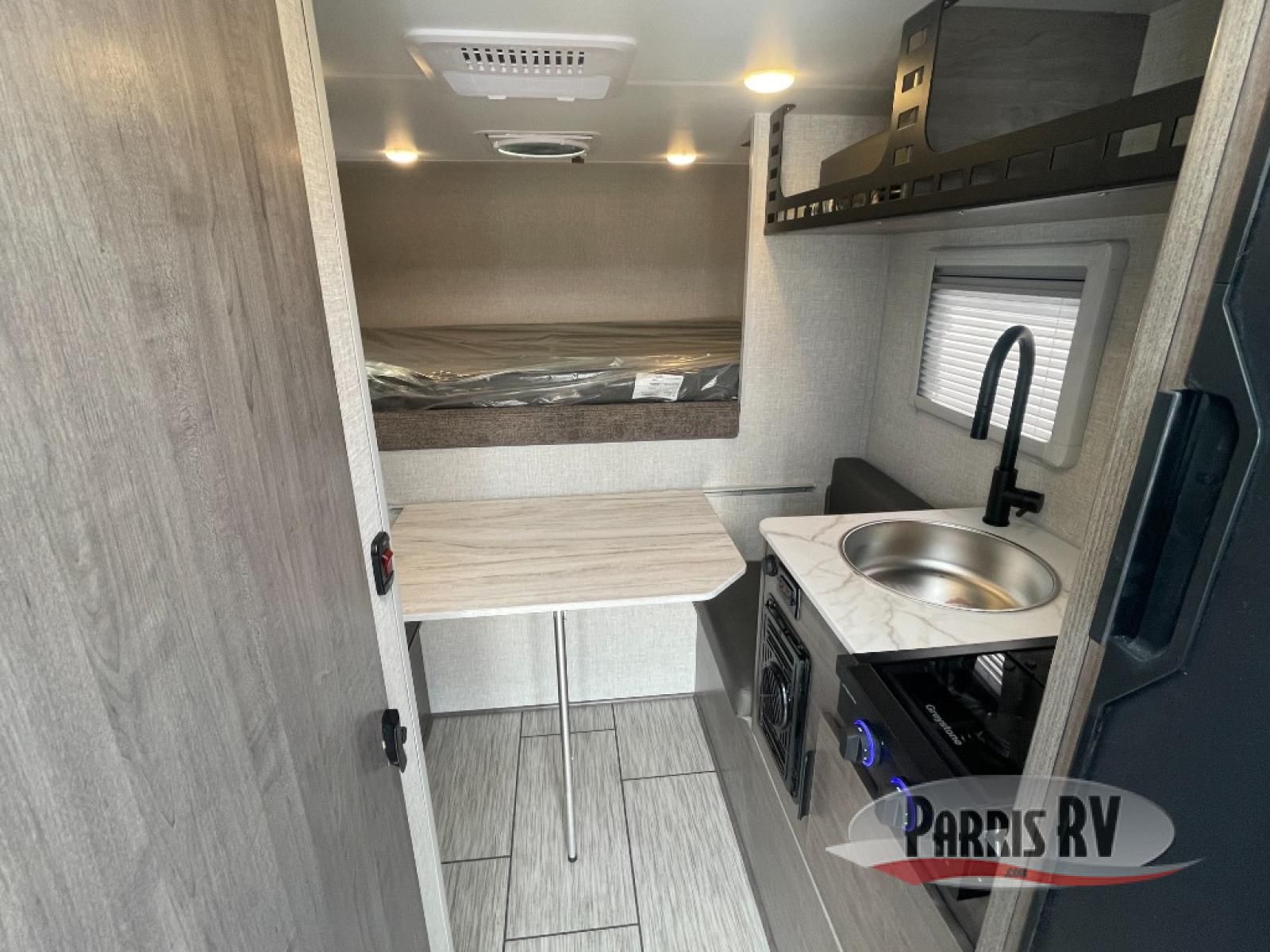 This lightweight truck camper is perfect for short bed trucks. The compact galley includes a two-burner cooktop, a stainless-steel sink, and a 12V refrigerator to keep your food fresh. A dinette provides a place to dine together or play games in the evening, and there is Molle-backed cabinet framing for extra storage. You will appreciate the wet bath with ducted heat and foot flush marine toilet, so you don't have to leave your camper in the middle of the night. A queen-size bed will provide a great night's rest, while the reading lights let you stay up late with a book!