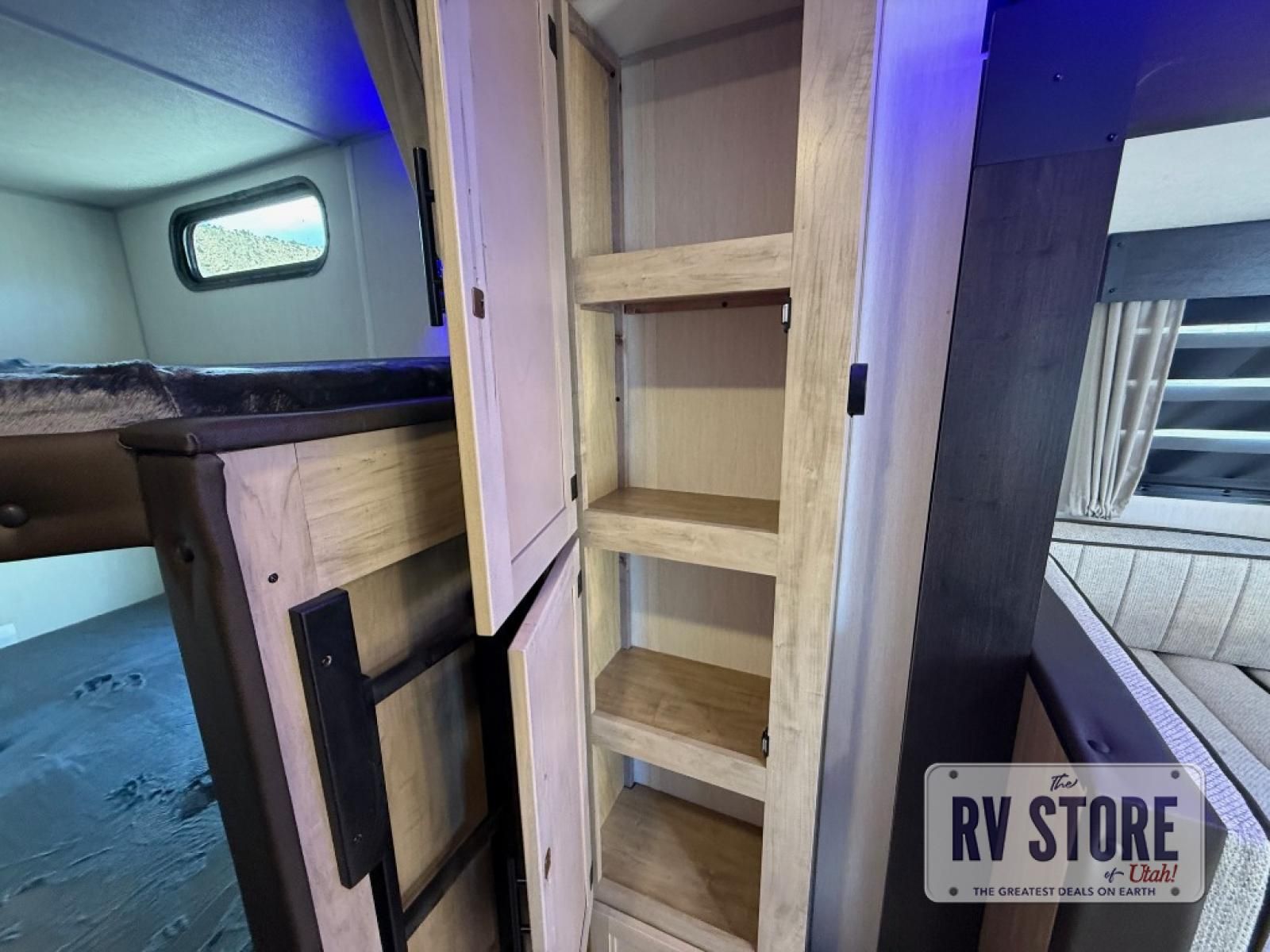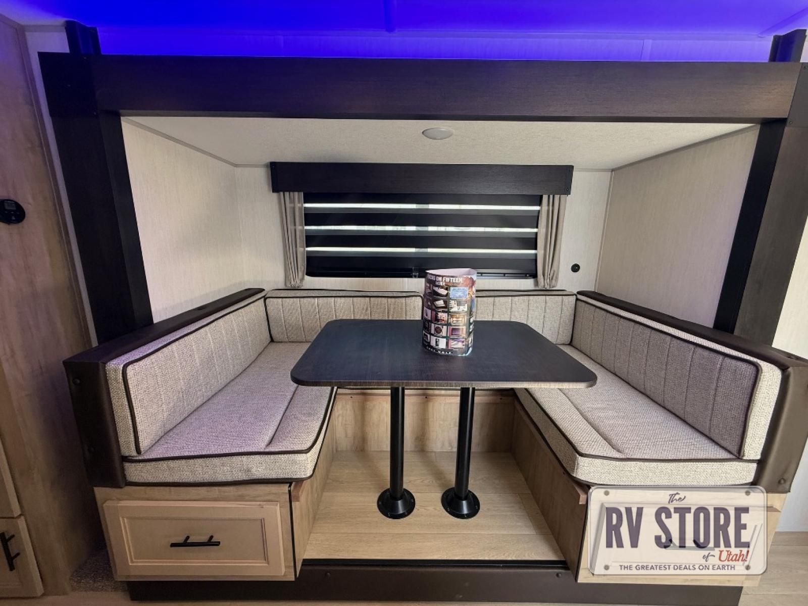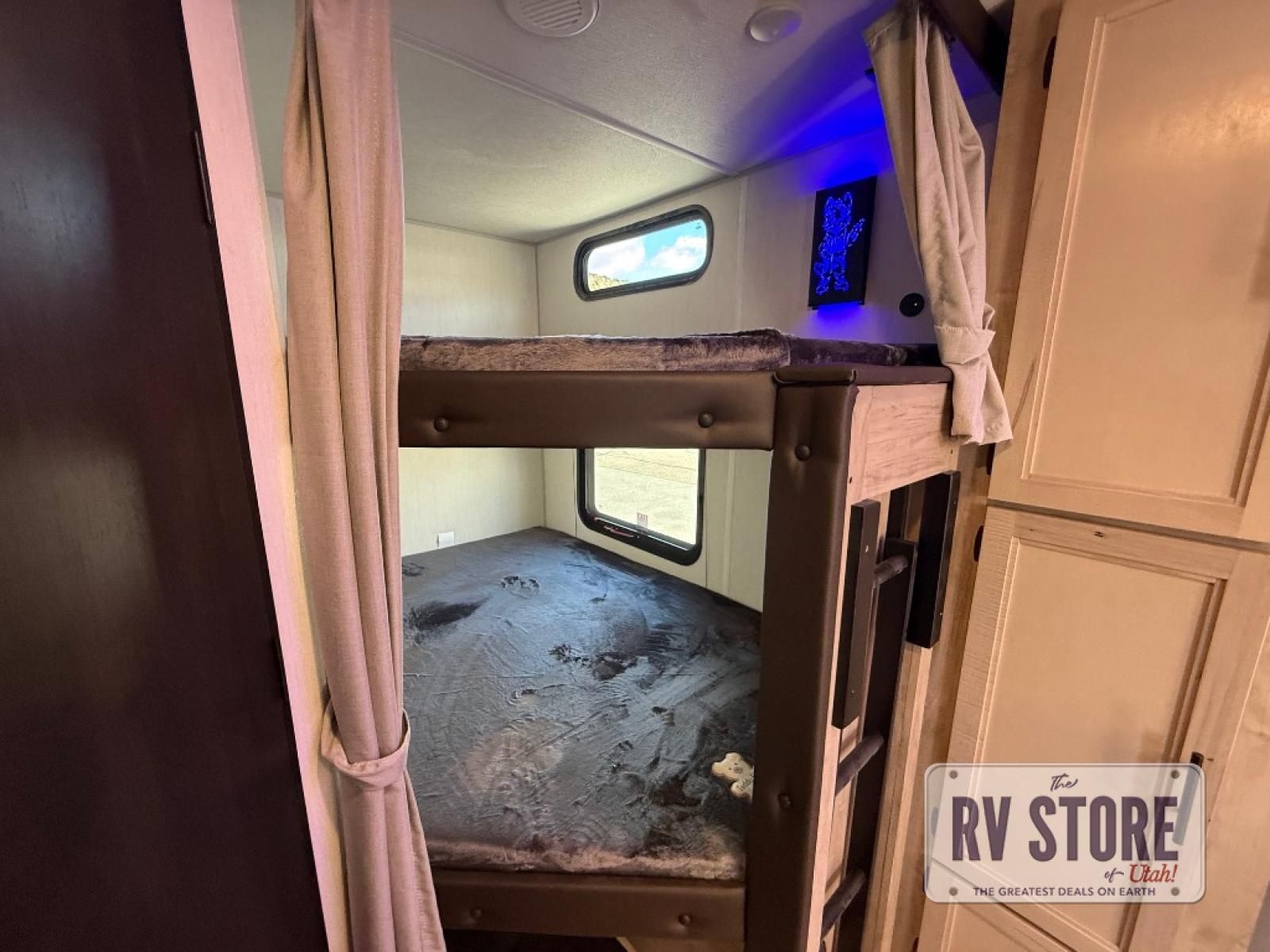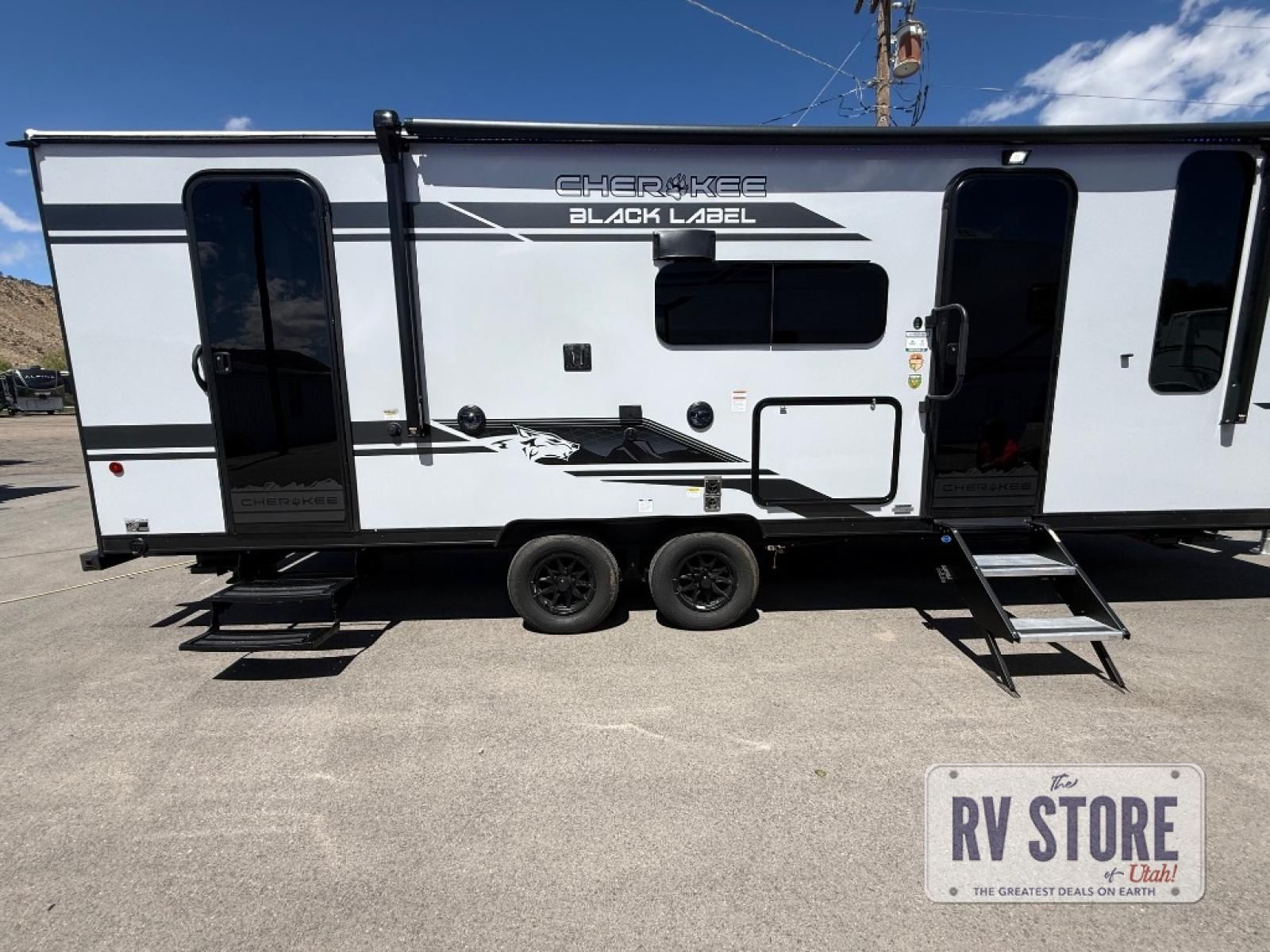 You will love the space provided in this dual entry Cherokee Grey Wolf Black Label travel trailer that has double-size bunks! The rear entry door leads right into the full bath allowing easy access from outside when you need to use the bathroom while you're enjoying the great outdoors. The large U-shaped dinette slide will not only seat everyone comfortably for a meal or a game, but since it also slides out, it opens up the interior even more to give you plenty of space for foot traffic. This space also serves as extra sleeping space if needed. For all of your outdoor gear, you will find the outside storage compartments handy for stowing away your things when not in use. While the kids enjoy their bunk beds, you will enjoy a good night's rest on the RV king bed with a wardrobe in the front private bedroom!
