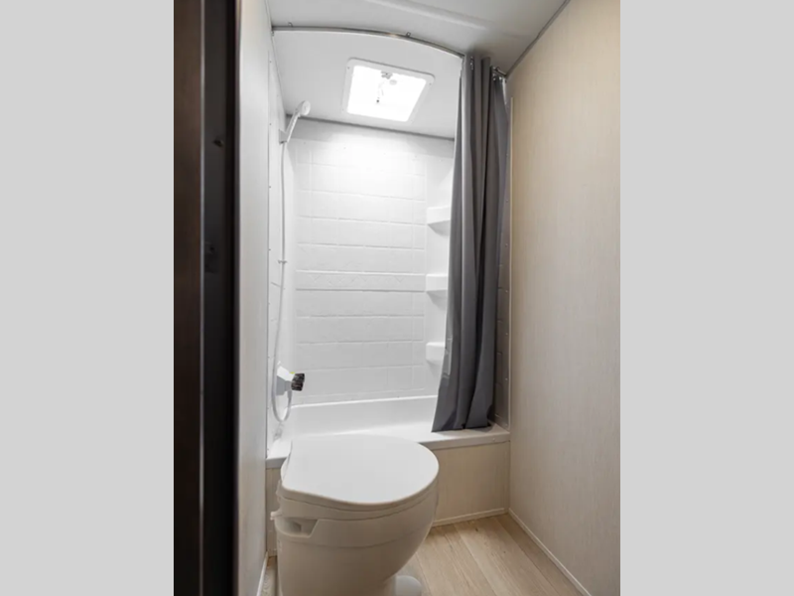 This family travel trailer is ready to head to the campground whenever you are! The kiddos can sleep on the set of double-size bed bunks, and you can sleep on the front queen bed, plus the U-shaped dinette slide can also transform into an extra sleeping space when you aren't using it to enjoy a meal prepared with the cooktop. You can also prepare your delicious meals at the outside mini kitchen and stay protected by the power awning. The exterior not only has outside storage and an outside TV mount but also features an outside storage plus door for access to the storage space underneath the bottom bunk bed. The rear corner bath allows everyone to stay clean and refreshed while you camp.