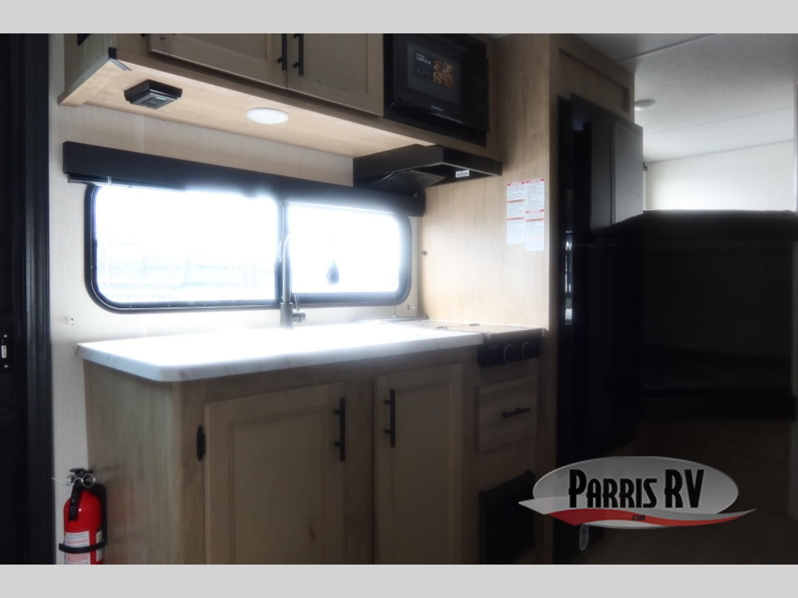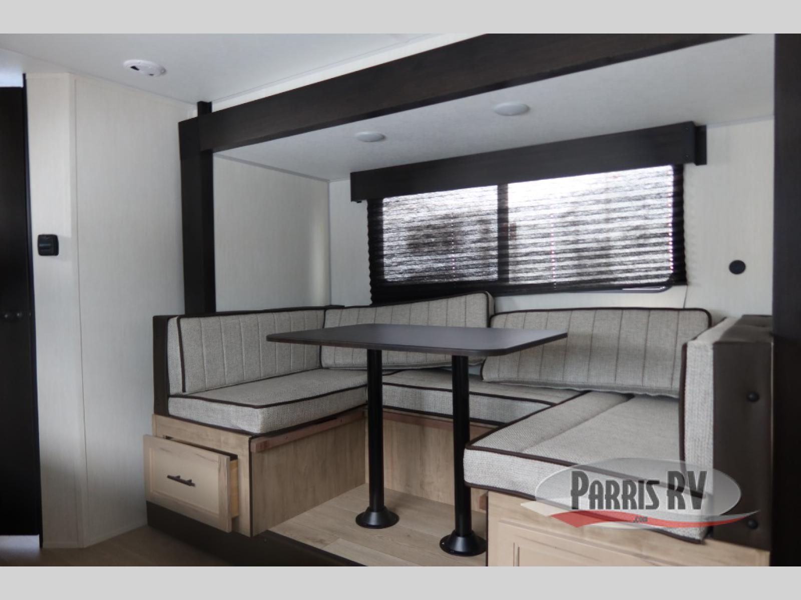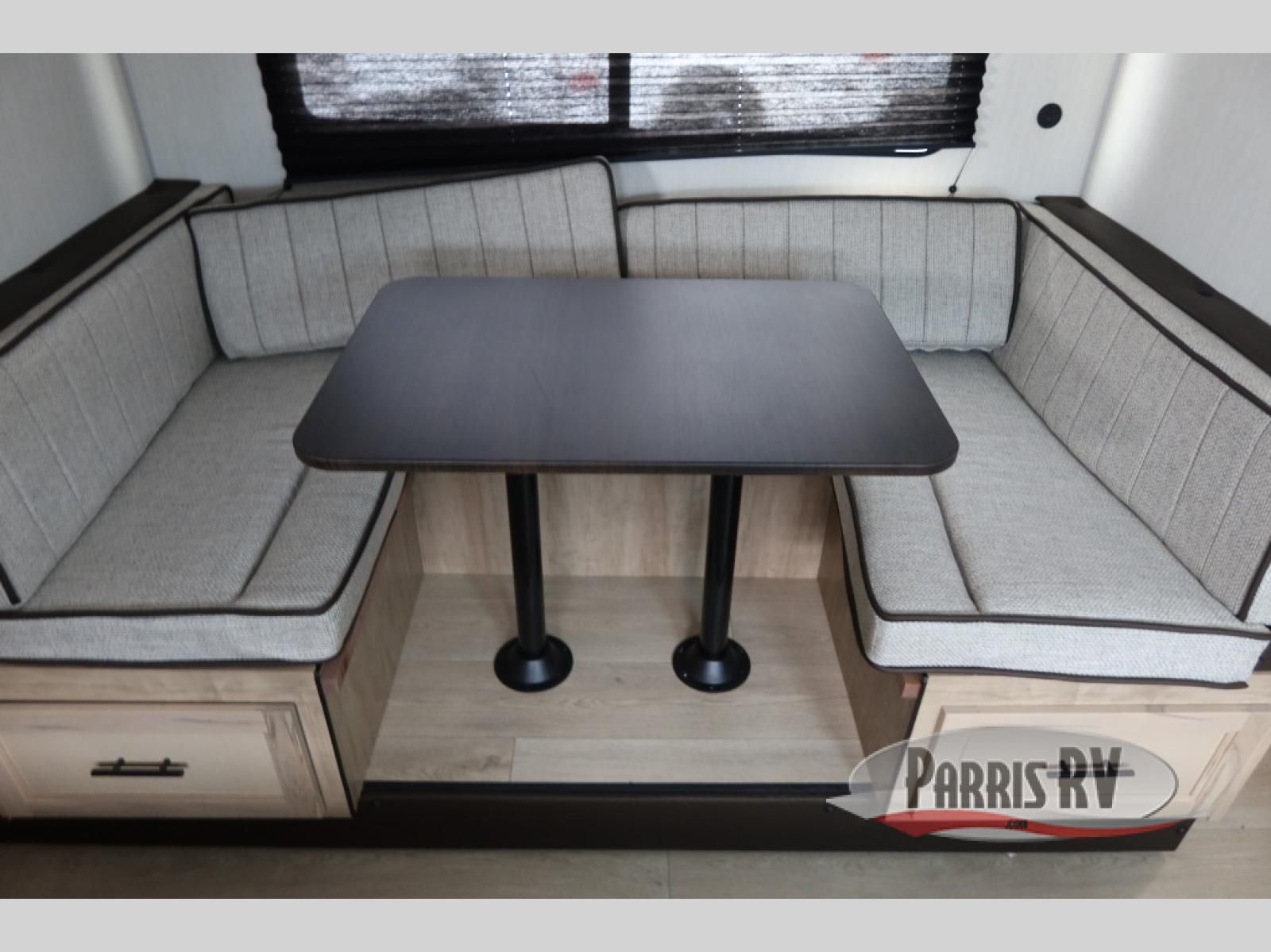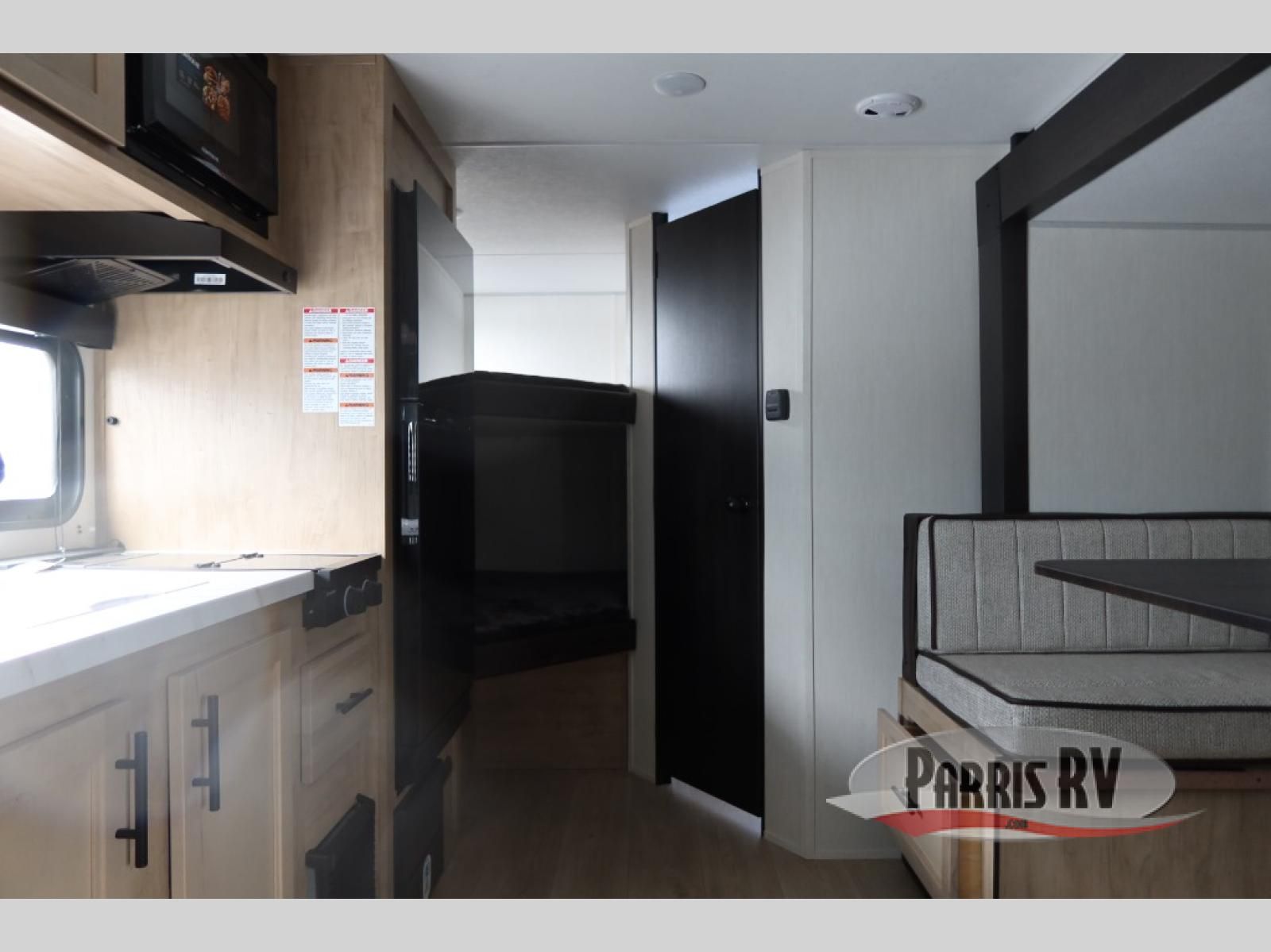 This family travel trailer is ready to head to the campground whenever you are! The kiddos can sleep on the set of double-size bed bunks, and you can sleep on the front queen bed, plus the U-shaped dinette slide can also transform into an extra sleeping space when you aren't using it to enjoy a meal prepared with the cooktop. You can also prepare your delicious meals at the outside mini kitchen and stay protected by the power awning. The exterior not only has outside storage and an outside TV mount but also features an outside storage plus door for access to the storage space underneath the bottom bunk bed. The rear corner bath allows everyone to stay clean and refreshed while you camp.