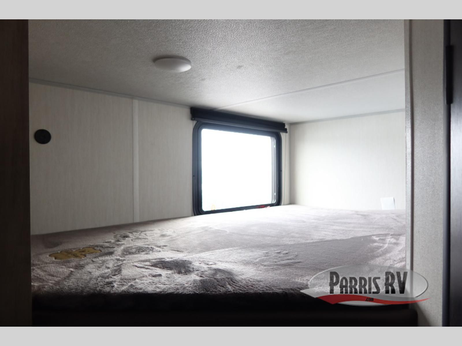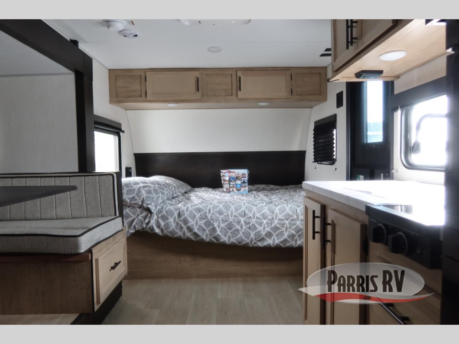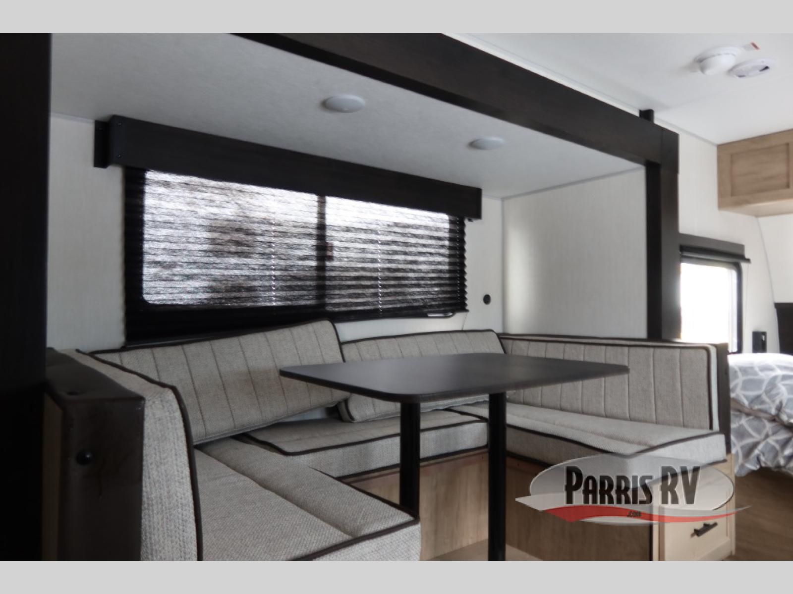 This family travel trailer is ready to head to the campground whenever you are! The kiddos can sleep on the set of double-size bed bunks, and you can sleep on the front queen bed, plus the U-shaped dinette slide can also transform into an extra sleeping space when you aren't using it to enjoy a meal prepared with the cooktop. You can also prepare your delicious meals at the outside mini kitchen and stay protected by the power awning. The exterior not only has outside storage and an outside TV mount but also features an outside storage plus door for access to the storage space underneath the bottom bunk bed. The rear corner bath allows everyone to stay clean and refreshed while you camp.