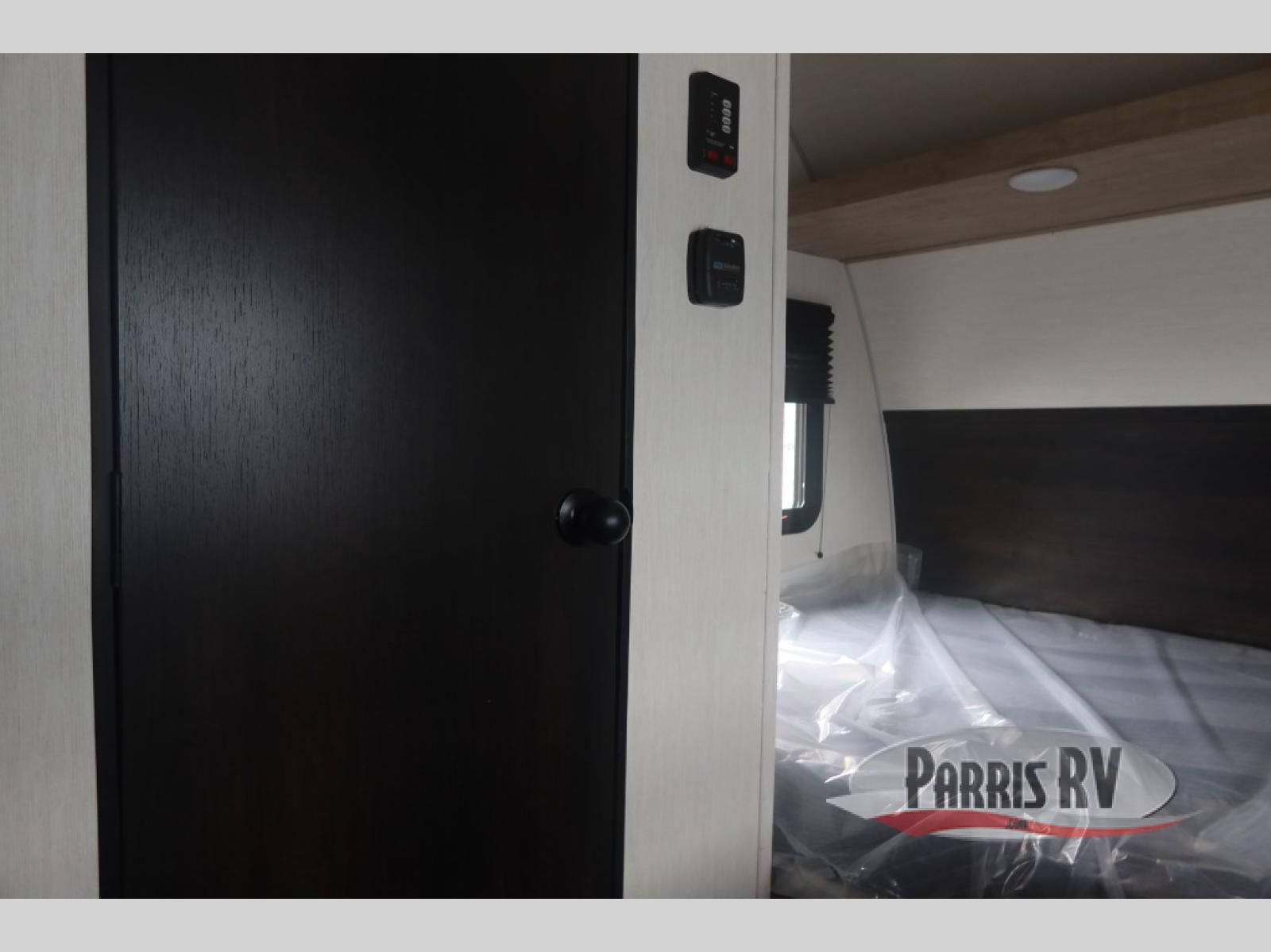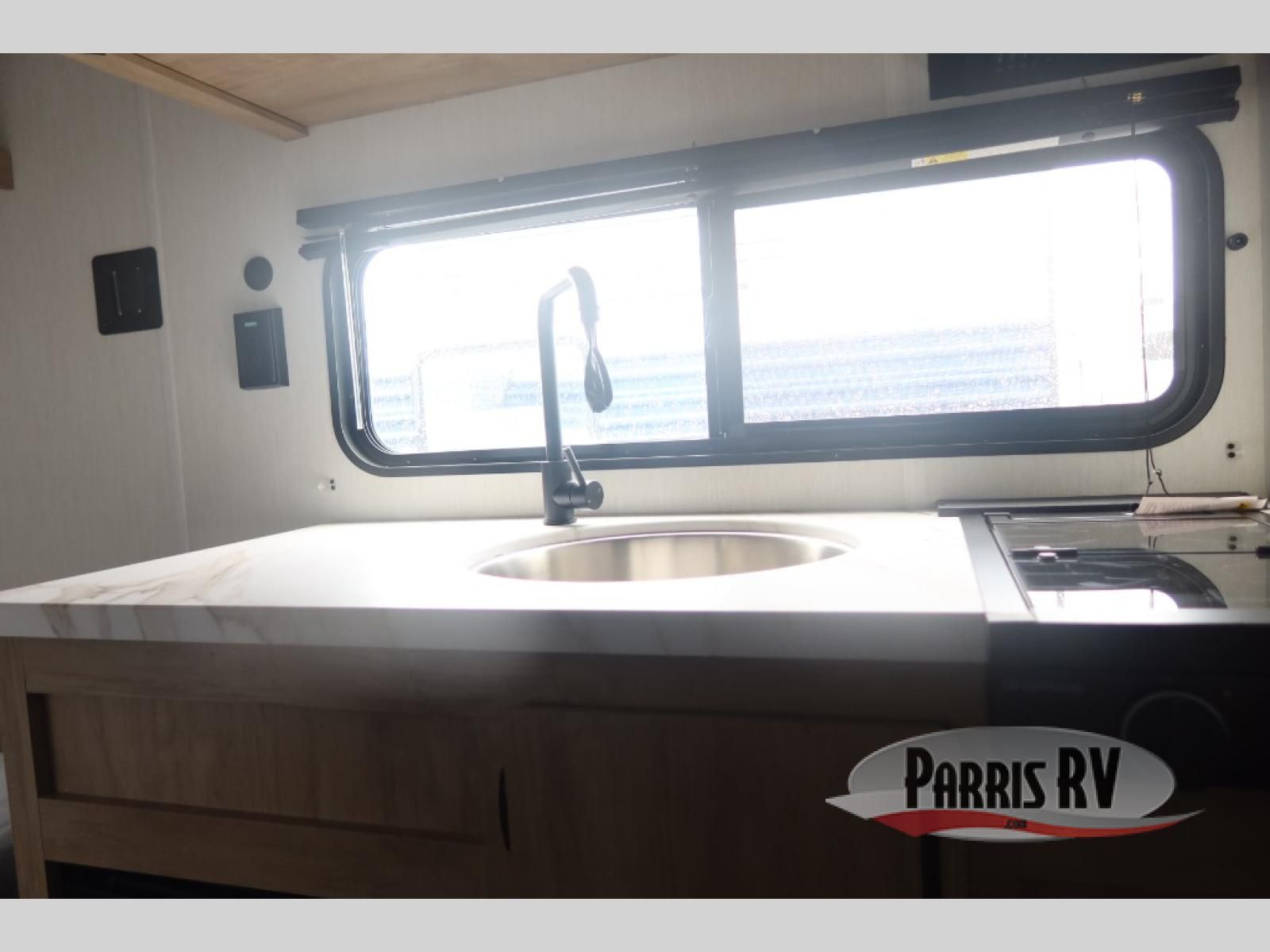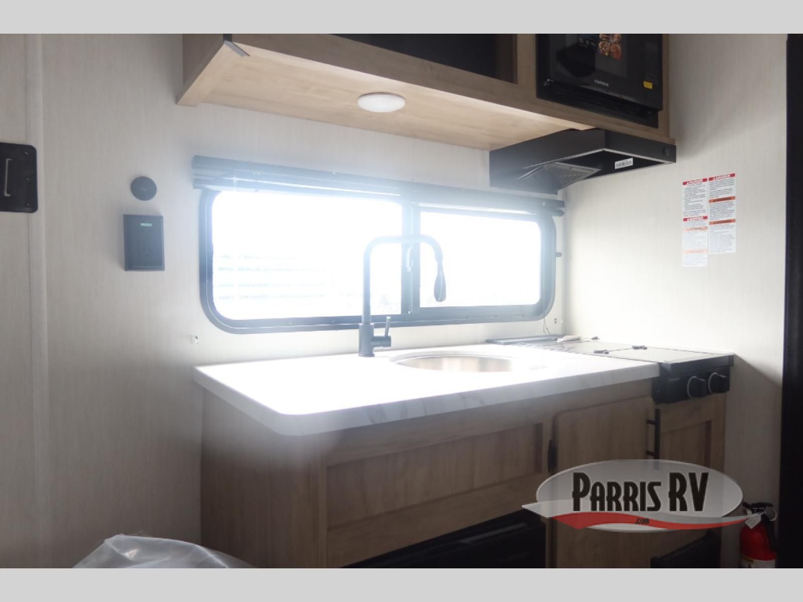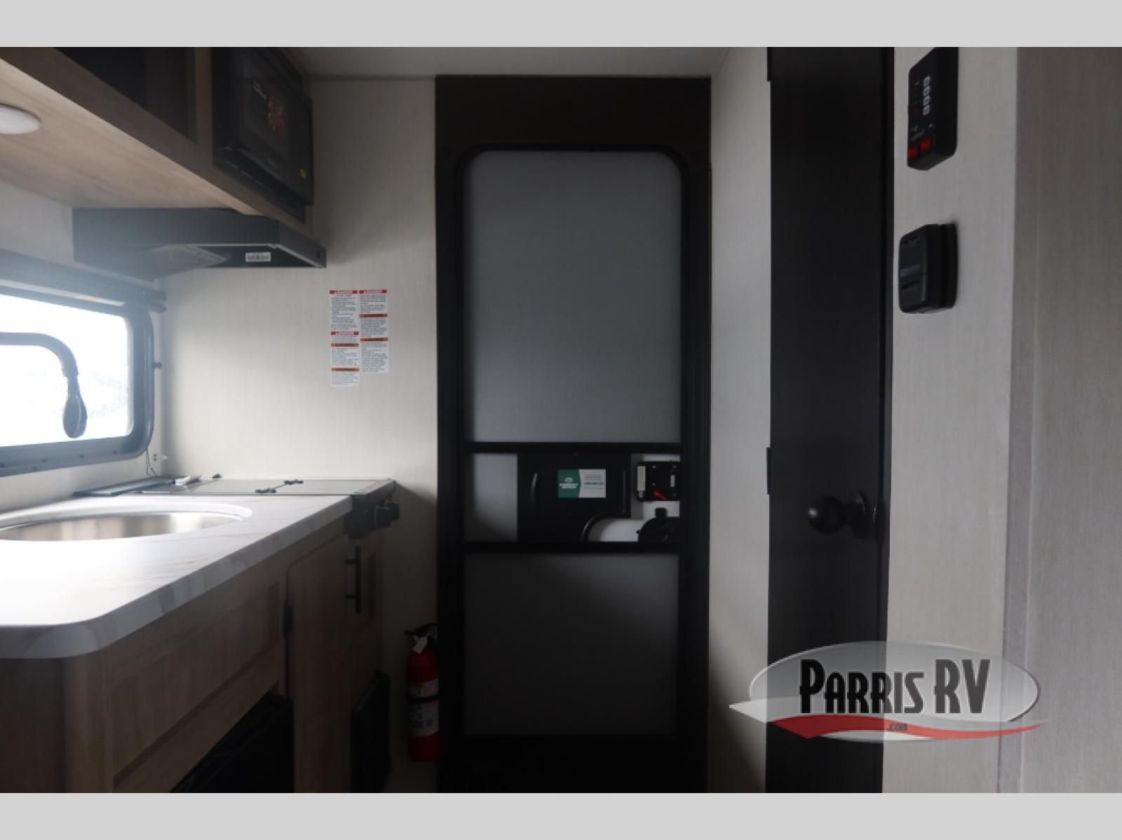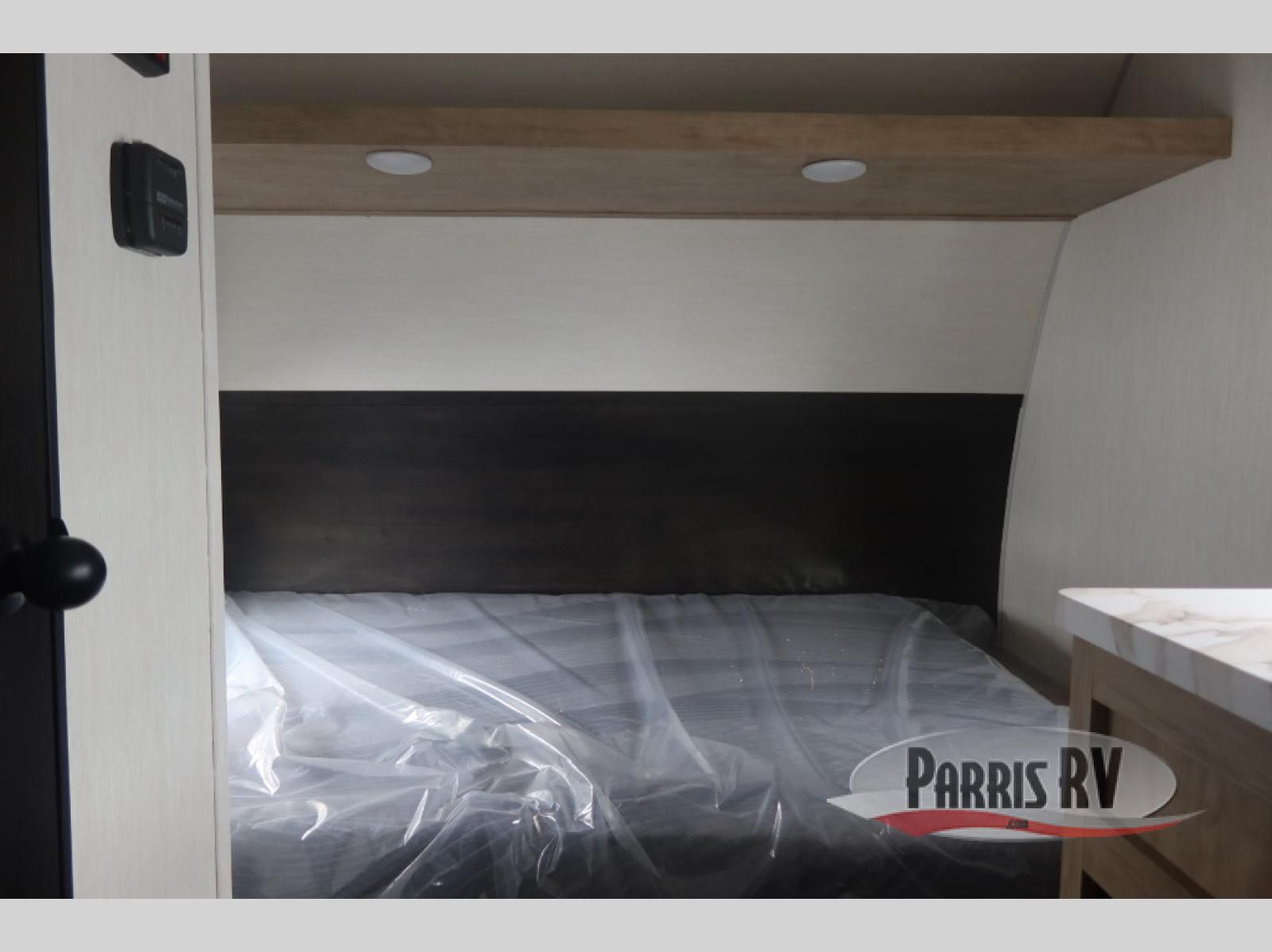 Featuring a compact, no-frills layout that keeps everything within reach. At the front of the unit, the queen bed sits as the main feature of the space, providing a simple and comfortable place to rest without any separate living area. Just beside the bed, the small kitchen setup includes a conveniently placed microwave, making it easy to heat up meals while maximizing the limited space. Above the kitchenette, overhead cabinets offer essential storage for your belongings, helping you stay organized in this efficient layout. With its straightforward design and all-in-one front layout, built for easy, practical camping without unnecessary extras.