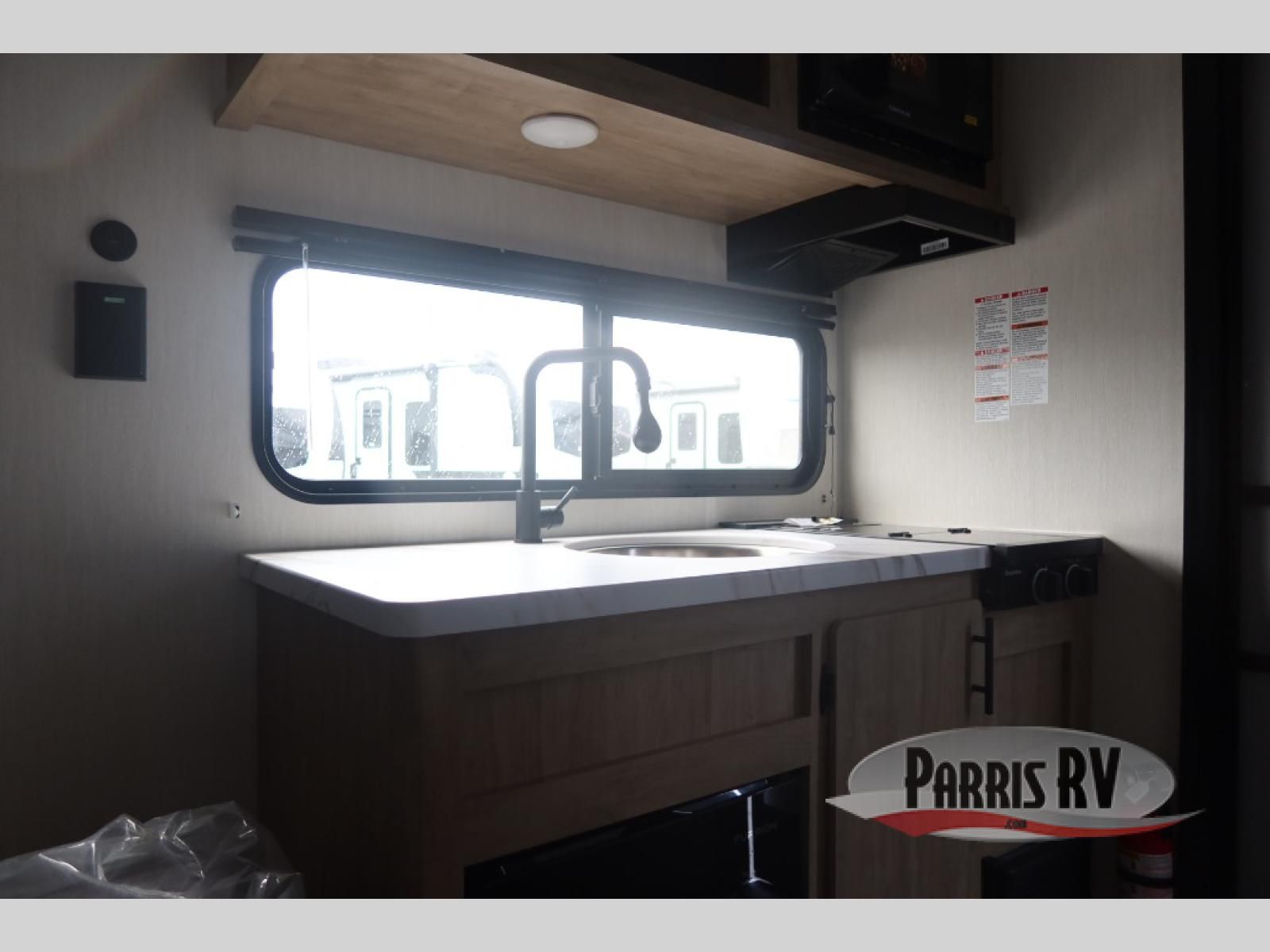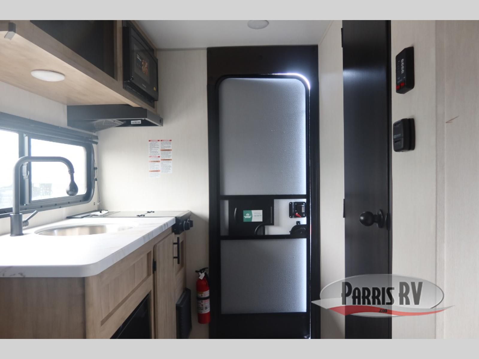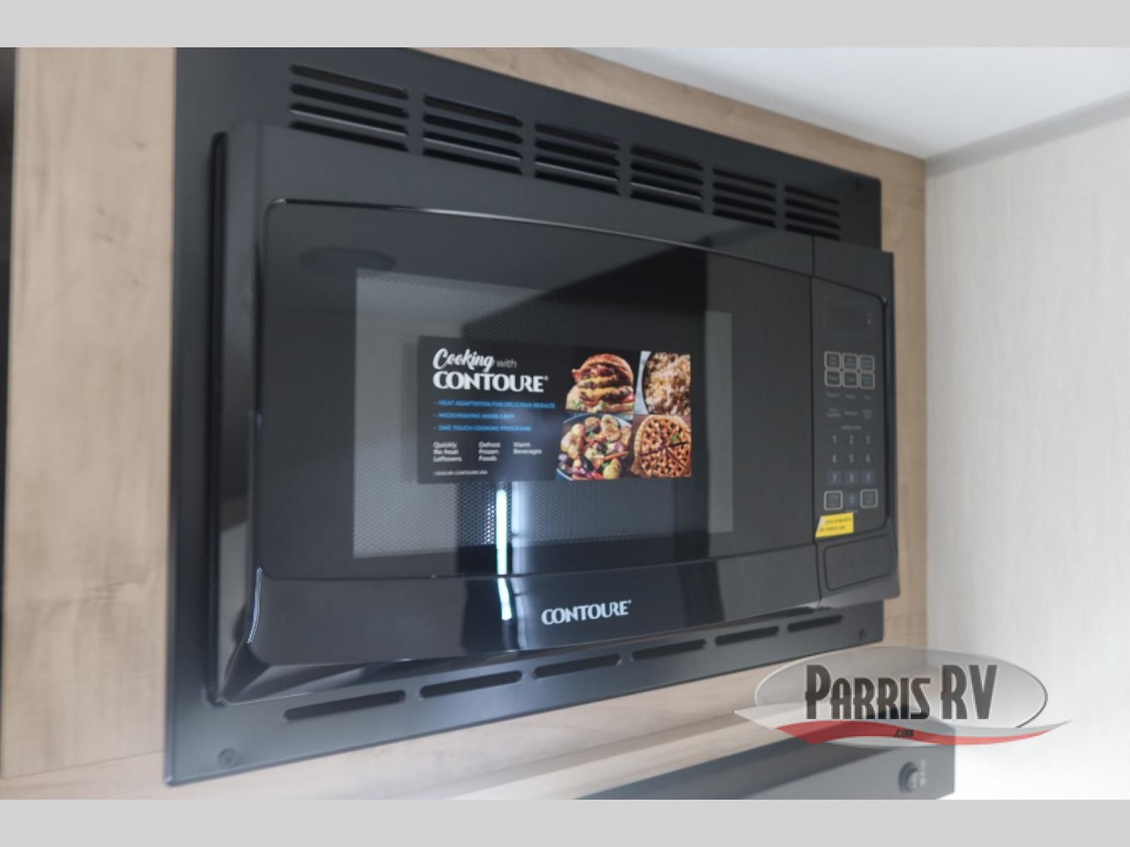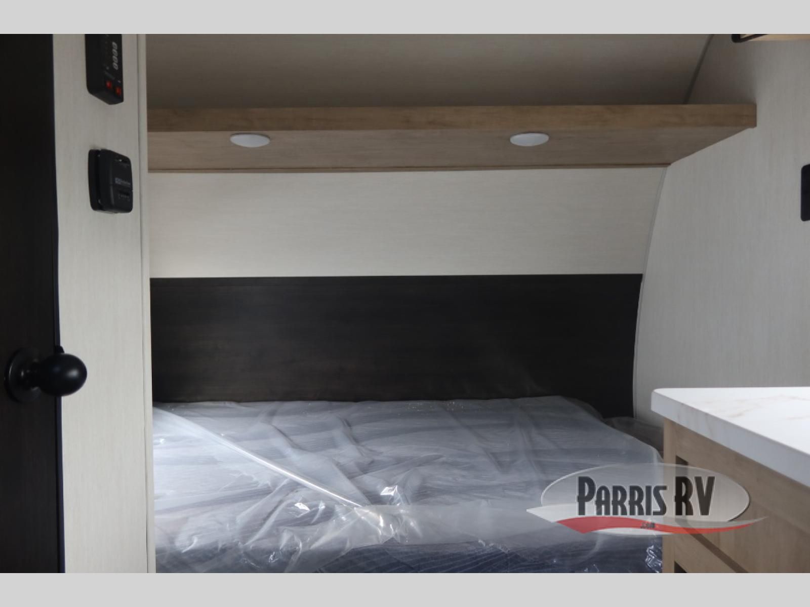 Featuring a compact, no-frills layout that keeps everything within reach. At the front of the unit, the queen bed sits as the main feature of the space, providing a simple and comfortable place to rest without any separate living area. Just beside the bed, the small kitchen setup includes a conveniently placed microwave, making it easy to heat up meals while maximizing the limited space. Above the kitchenette, overhead cabinets offer essential storage for your belongings, helping you stay organized in this efficient layout. With its straightforward design and all-in-one front layout, built for easy, practical camping without unnecessary extras.
