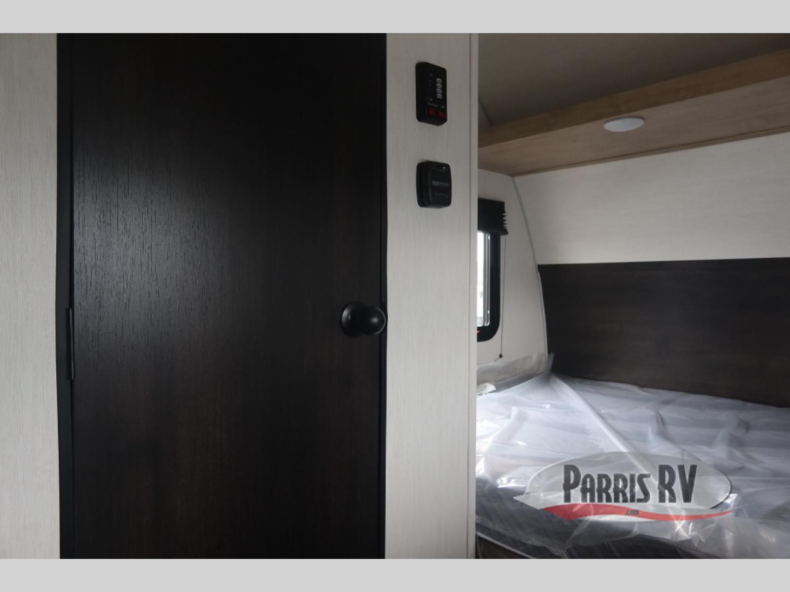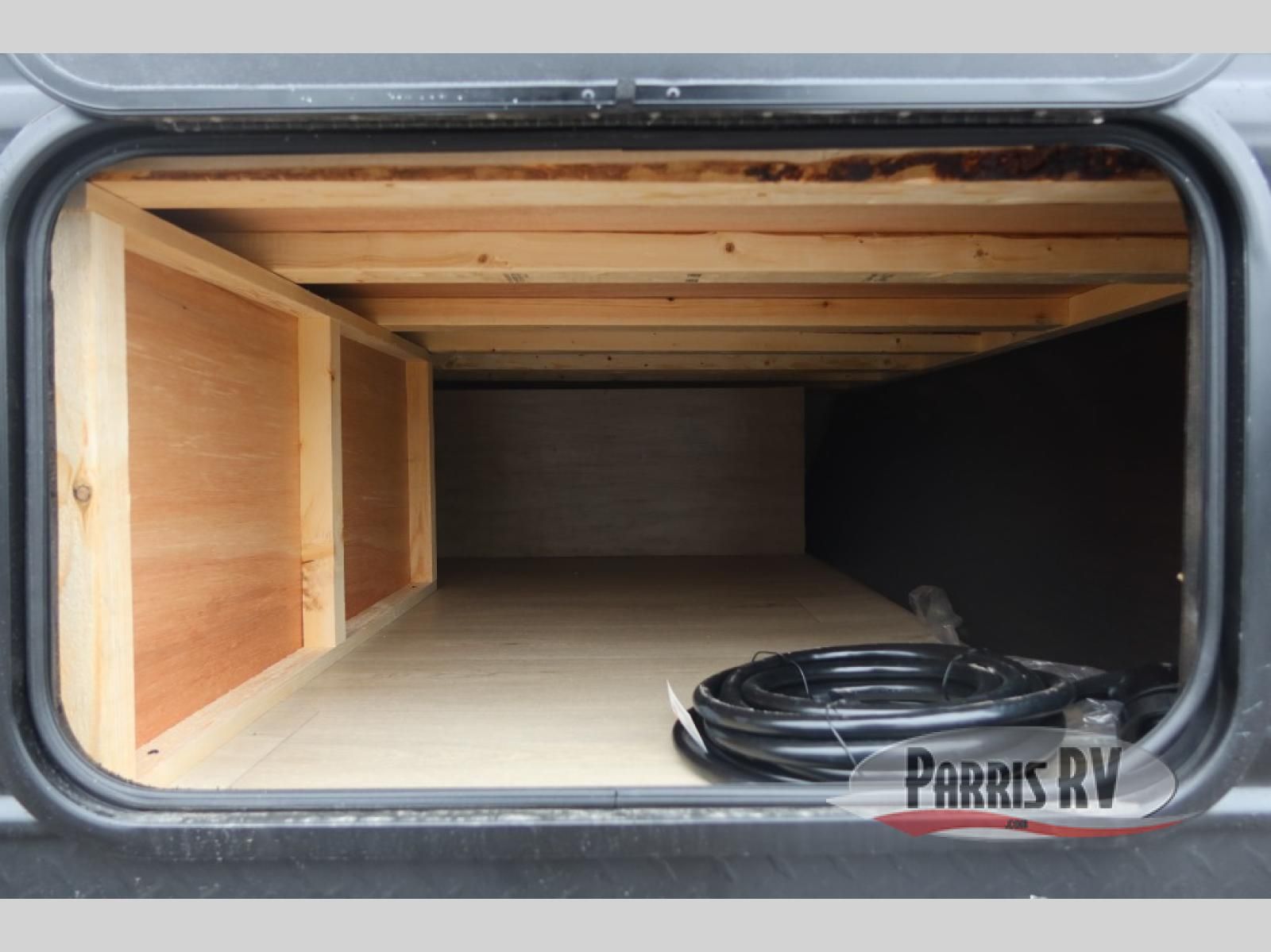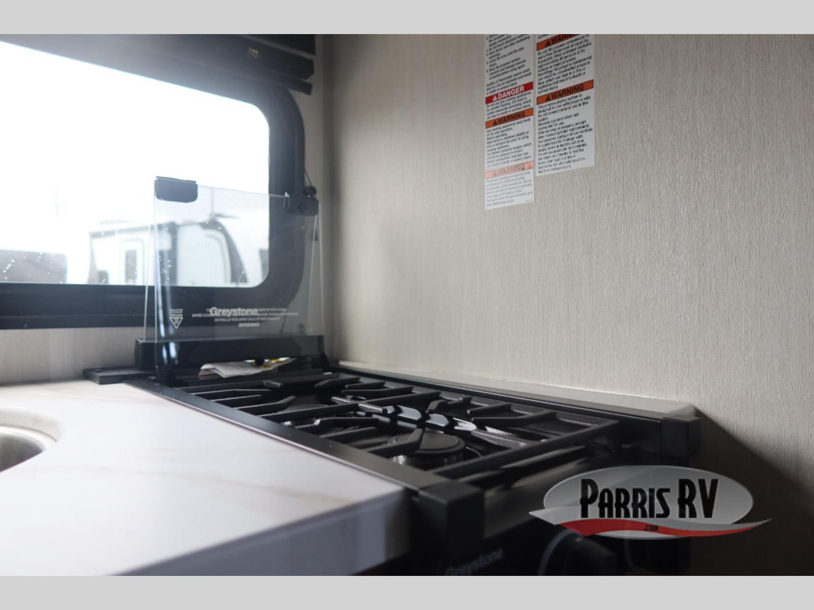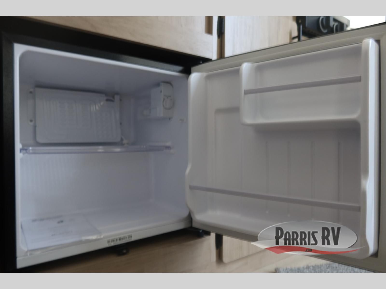 Featuring a compact, no-frills layout that keeps everything within reach. At the front of the unit, the queen bed sits as the main feature of the space, providing a simple and comfortable place to rest without any separate living area. Just beside the bed, the small kitchen setup includes a conveniently placed microwave, making it easy to heat up meals while maximizing the limited space. Above the kitchenette, overhead cabinets offer essential storage for your belongings, helping you stay organized in this efficient layout. With its straightforward design and all-in-one front layout, built for easy, practical camping without unnecessary extras.