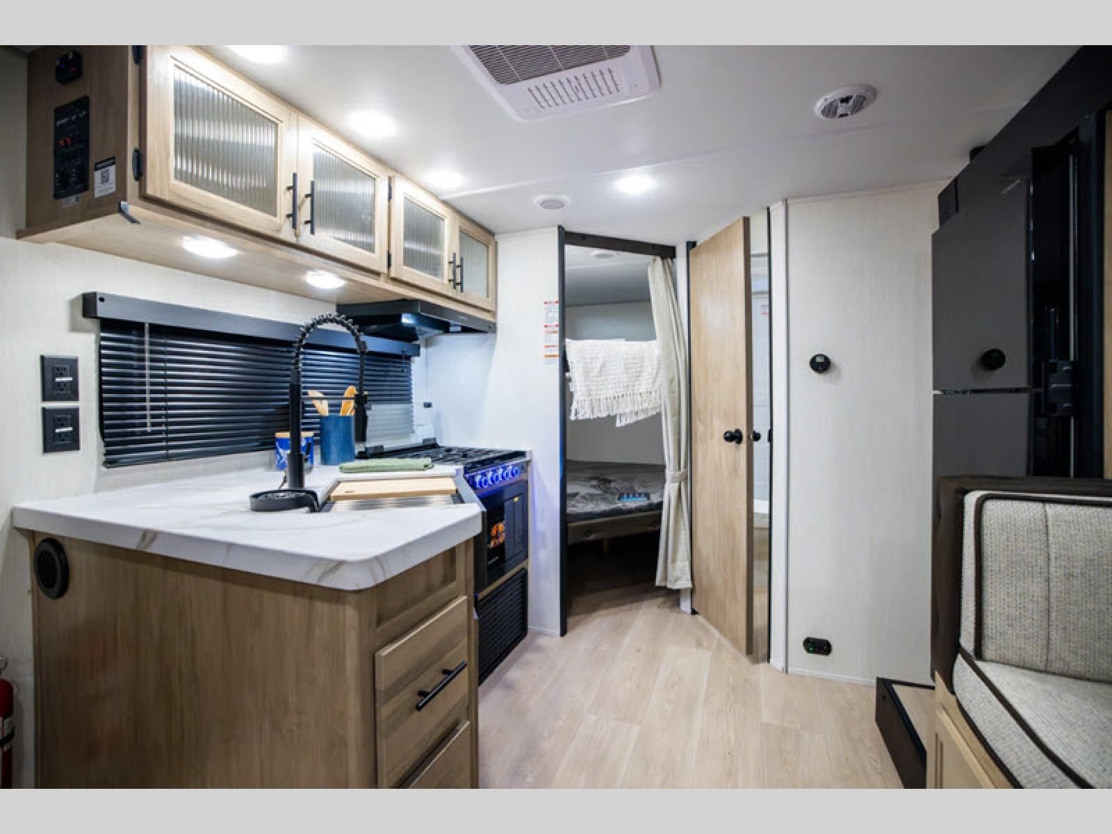 Enjoy time at the campground in this spacious travel trailer with a front private bedroom and double-size bunks for guests! The front bedroom has a wardrobe and shelf for you to store your clothing and essentials. The full interior kitchen and outside kitchen will let you make meals each day, and everyone can dine around the U-shaped dinette, which can service as extra sleeping space if needed. Or dine under the 15' awning outside! This unit also includes ample storage space, including hidden shelves behind the fireplace and outside storage!