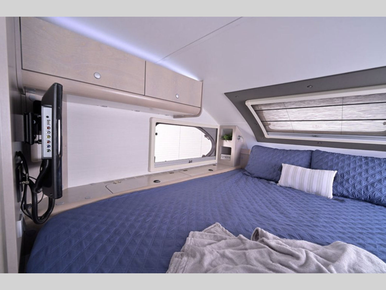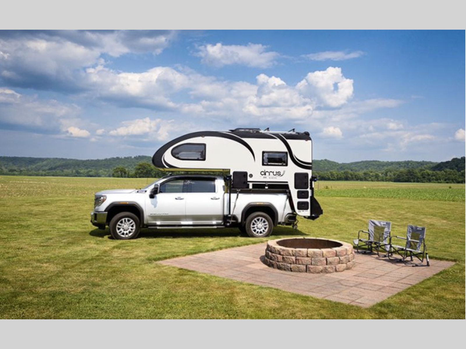 You will find a pass-thru window on this Cirrus truck camper. The exterior has a Maggie roof rack for bringing along extra gear, and there is a motorized 120" side awning to protect you while you're living life outside. The convection microwave/oven is going to make your meal prep easier and faster, and the air conditioning will keep this camper's interior at a desirable temperature even when it's hot outside. This model also comes with a Bluetooth media center with 19" TV and a great sleeping area with the Froli sleep system.