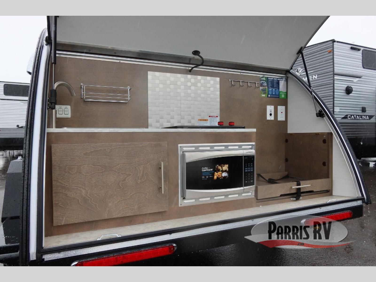 With any nuCamp RV TAG teardrop trailer, you can bring some of the comforts of home with you as you easily tow this lightweight trailer to the campgrounds. The outdoor kitchen includes a stainless steel sink and two-burner stove so you won't have to cook over a campfire each day. Inside, you'll find a composite floor, deluxe Amish cabinetry, sleeping accommodations, and a power roof fan to keep you comfortable. You will also appreciate the Convenience Package that comes with a 180-watt solar panel, a 100 Ah 12-volt Lithium battery, and more!