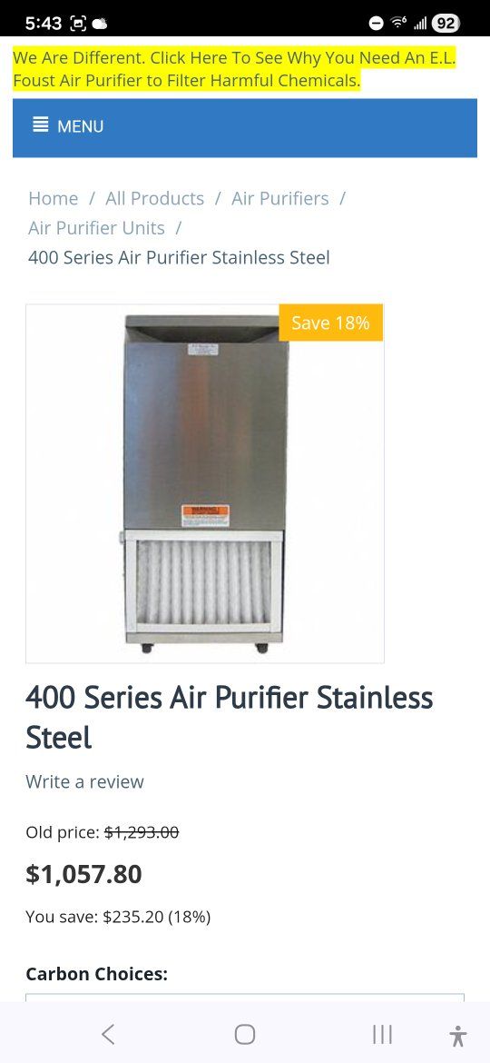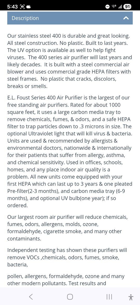 E.L. Foust Series 400 Air Purifier is the largest of our free standing air purifiers. Rated for about 1000 square feet, it uses a large carbon media tray to remove chemicals, fumes, & odors, and a safe HEPA filter to trap particles down to .3 microns in size. The optional Ultraviolet light that will kill virus & bacteria. Units are used & recommended by allergists & environmental doctors, nationwide & internationally for their patients that suffer from allergy, asthma, and chemical sensitivity. Used in offices, schools, homes, and any place indoor air quality is a problem. All new units come equipped with your first HEPA which can last up to 3 years & one pleated Pre-filter(2-3 months), and carbon media tray (6-9 months), and optional UV bulb(one year); if so ordered.