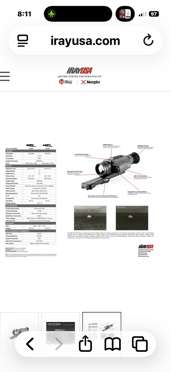 PayPalI have a gently used Iray GH50R Rico 640 thermal weapon sight. It has a built in range finder. Comes with 3 batteries. Works perfect. Over 3.5 years of warranty left. $3300 must pick up in Layton.