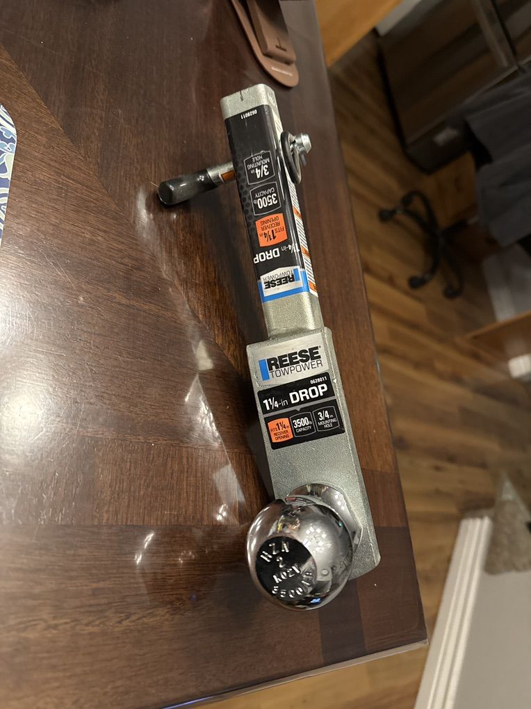 1¼” drop Fits 1¼” receiver 2” hitch ball included 3,500 lb towing capacity 3/4” mounting hole Includes pin and clip
