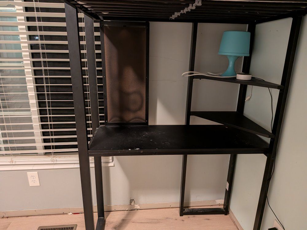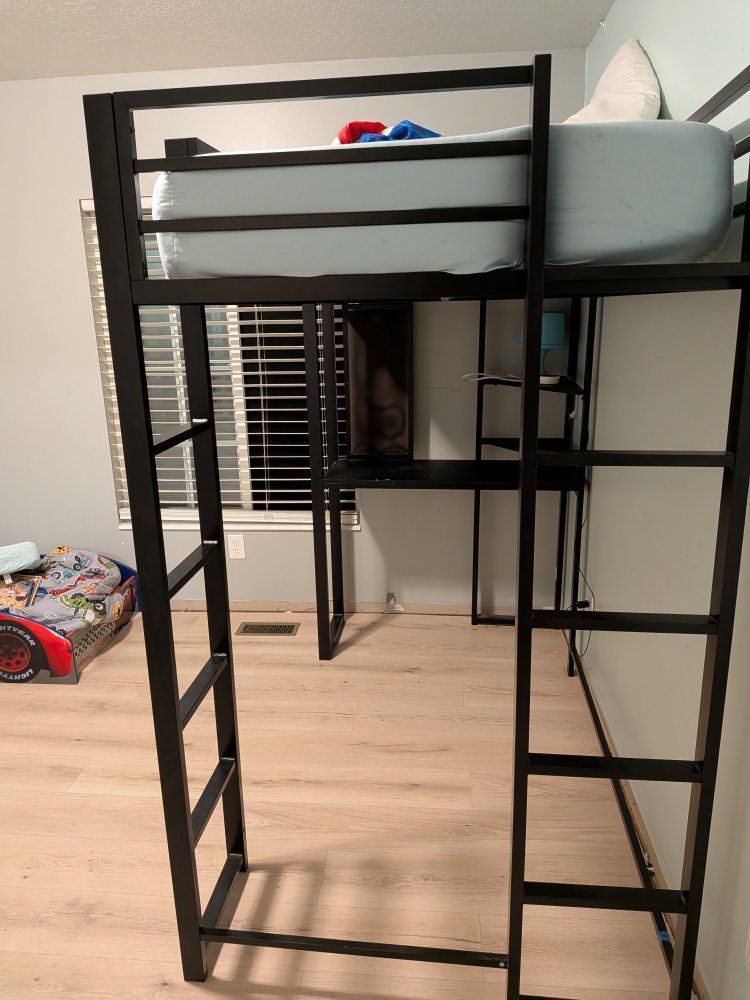 GooglePayTwin size loft bed with desk, 2 shelves, and a peg board. height under the bed is 60"