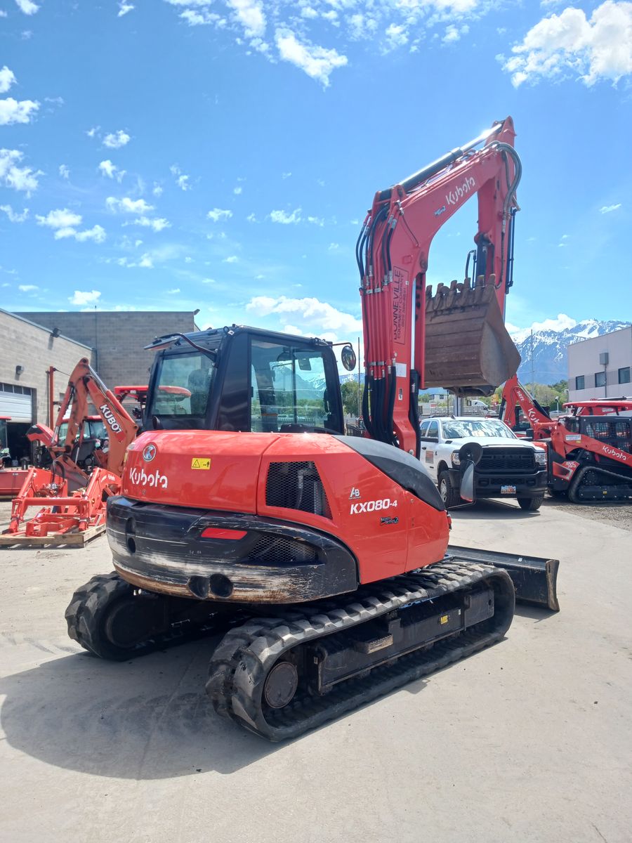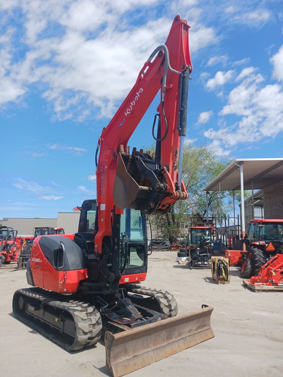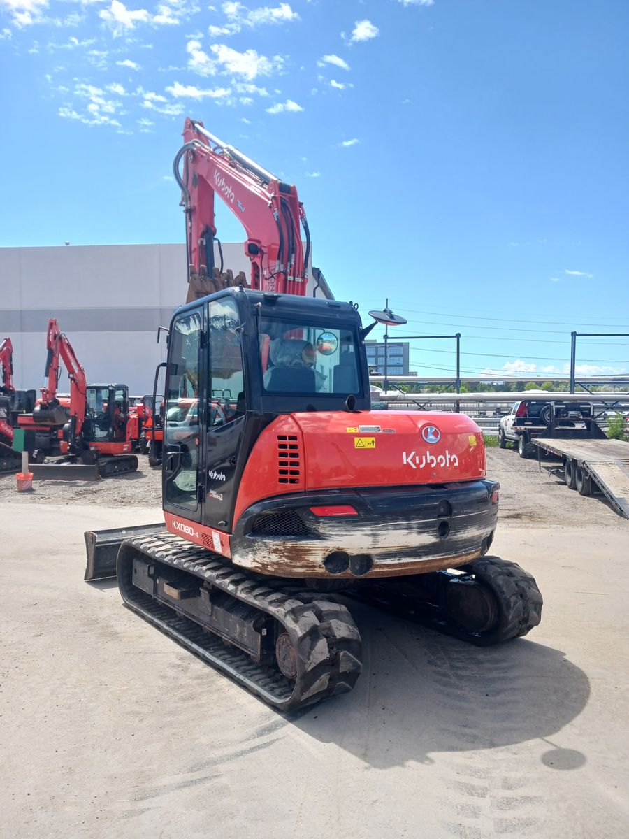 This 8-ton class Kubota KX080-4S2R3A tracked excavator is coming out of our dealership rental fleet and is now available for sale. It features the versatility and power needed for heavy trenching, digging, and site work, while providing operator comfort and control with an enclosed cab. Disclaimer: Unit coming out of rental fleet, hours may vary, sold as-is.